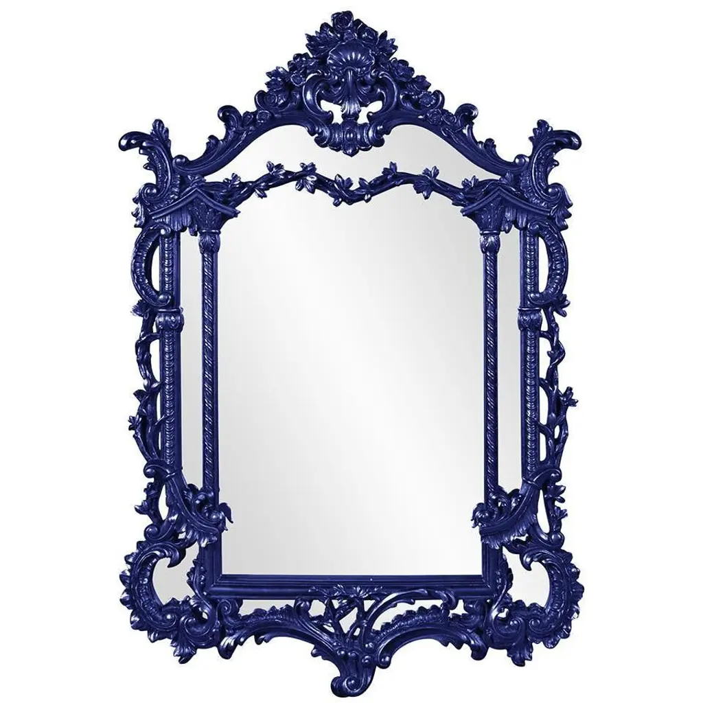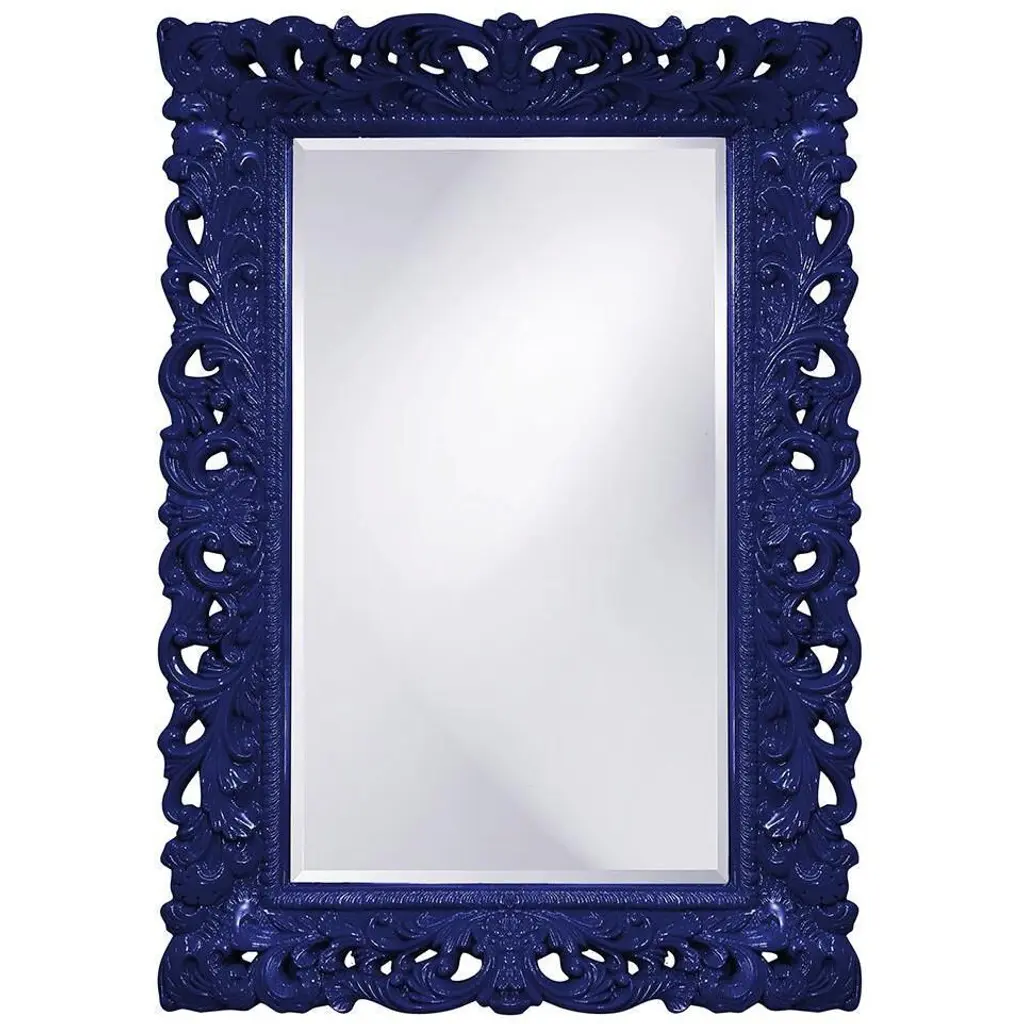 The Chateau Mirror features an ornate rectangle frame complete with scrolls and flourishes. It is then finished in our custom glossy navy blue lacquer. The Chateau Mirror is a perfect focal point for an entryway, bathroom, bedroom or any room in your home. D-rings are affixed to the back of the mirror so it is ready to hang right out of the box in either a horizontal or vertical orientation The mirrored glass on this piece has a bevel adding to its beauty and style. The Chateau Mirror is part of our custom paint program and is available in one of fourteen vivid colors. It is proudly painted in the USA.