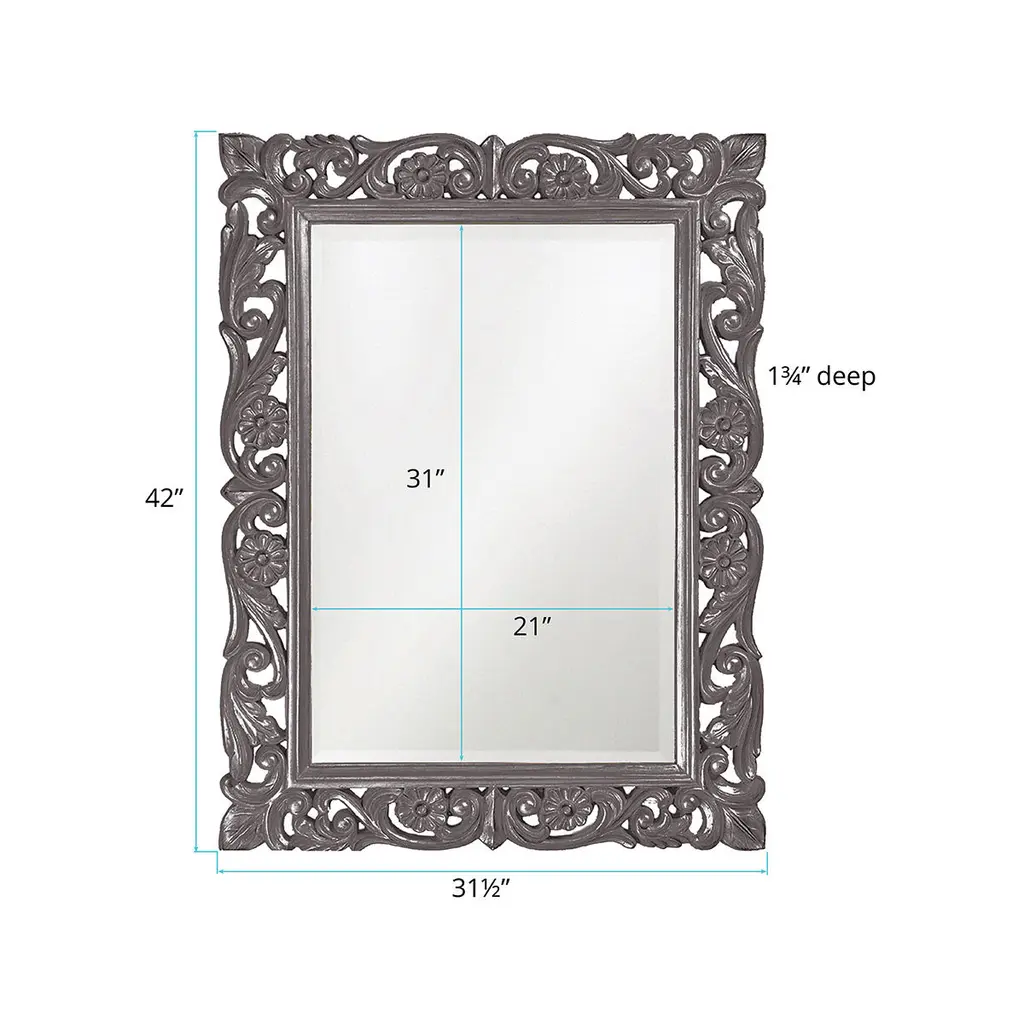 The Chateau Mirror features an ornate rectangle frame complete with scrolls and flourishes. It is then finished in our custom glossy charcoal gray lacquer. The Chateau Mirror is a perfect focal point for an entryway, bathroom, bedroom or any room in your home. D-rings are affixed to the back of the mirror so it is ready to hang right out of the box in either a horizontal or vertical orientation! The mirrored glass on this piece has a bevel adding to its beauty and style. The Chateau Mirror is part of our custom paint program and is available in one of fourteen vivid colors. It is proudly painted in the USA.