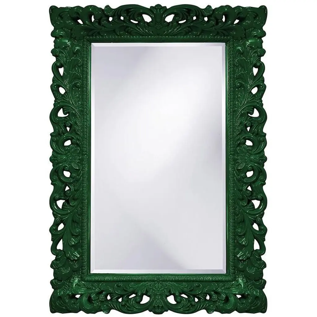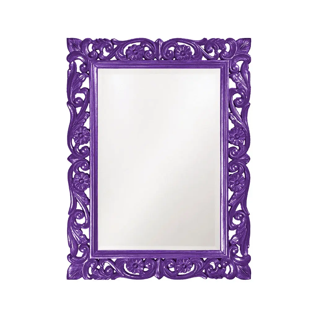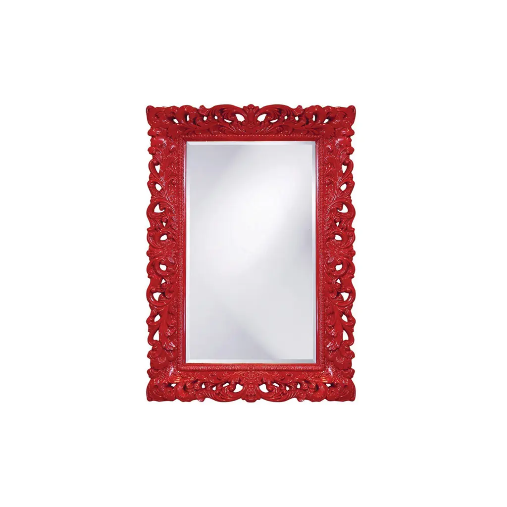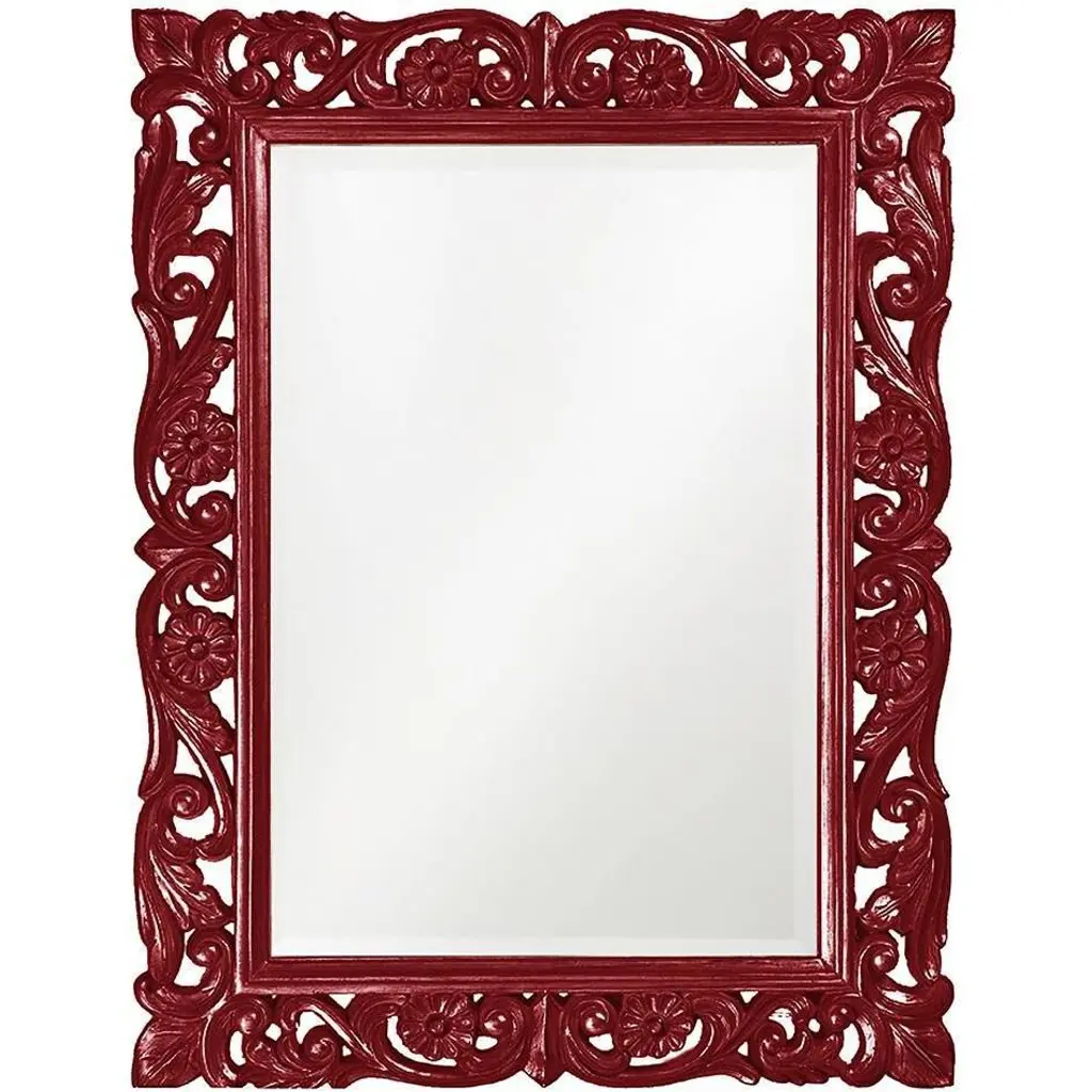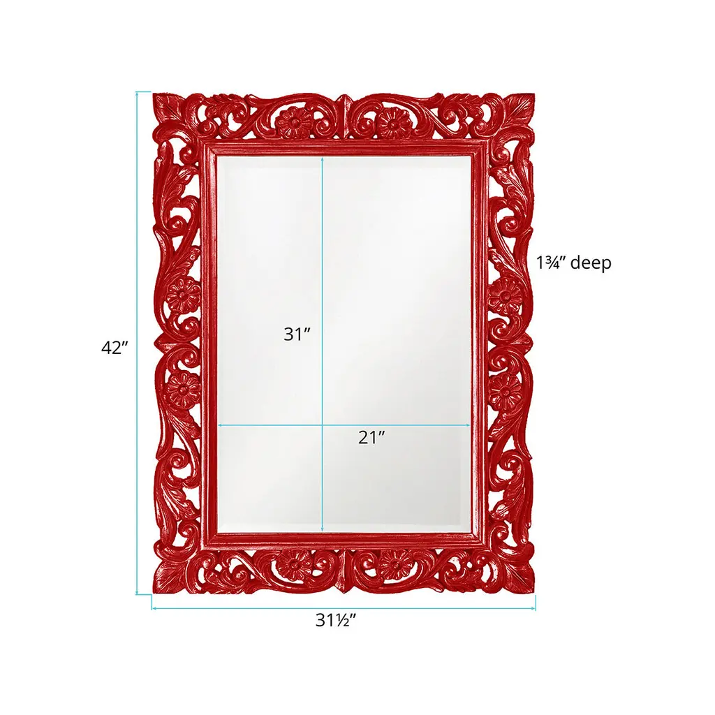 The Chateau Mirror features an ornate rectangle frame complete with scrolls and flourishes. It is then finished in our custom glossy red lacquer. The Chateau Mirror is a perfect focal point for an entryway, bathroom, bedroom or any room in your home. D-rings are affixed to the back of the mirror so it is ready to hang right out of the box in either a horizontal or vertical orientation! The mirrored glass on this piece has a bevel adding to its beauty and style. The Chateau Mirror is part of our custom paint program and is available in one of fourteen vivid colors. It is proudly painted in the USA.