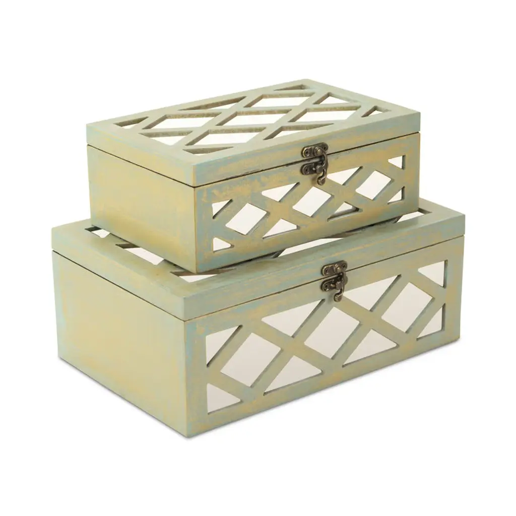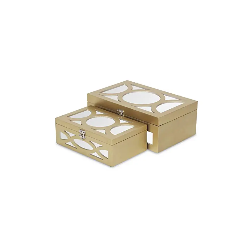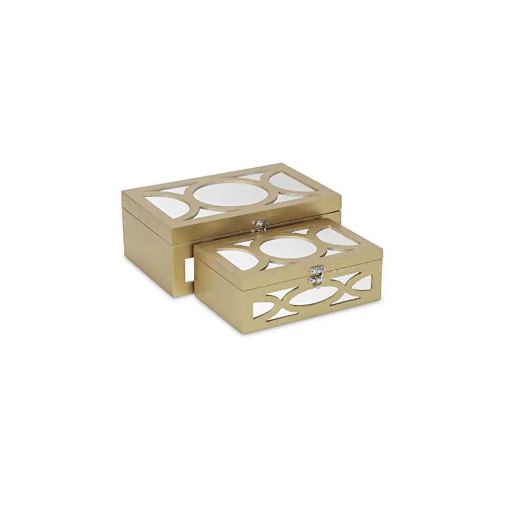 In bedrooms, entryways, mantles and more, keepsake boxes have provided a unique heirloom touch to many spaces. Perfect for storing treasured items or everyday objects, they provide an eye-catching and classic look. Crafted from wood materials, this set of 2 gold colored boxes feature unique circular patterns with distinctive mirrors styled on the top and front.