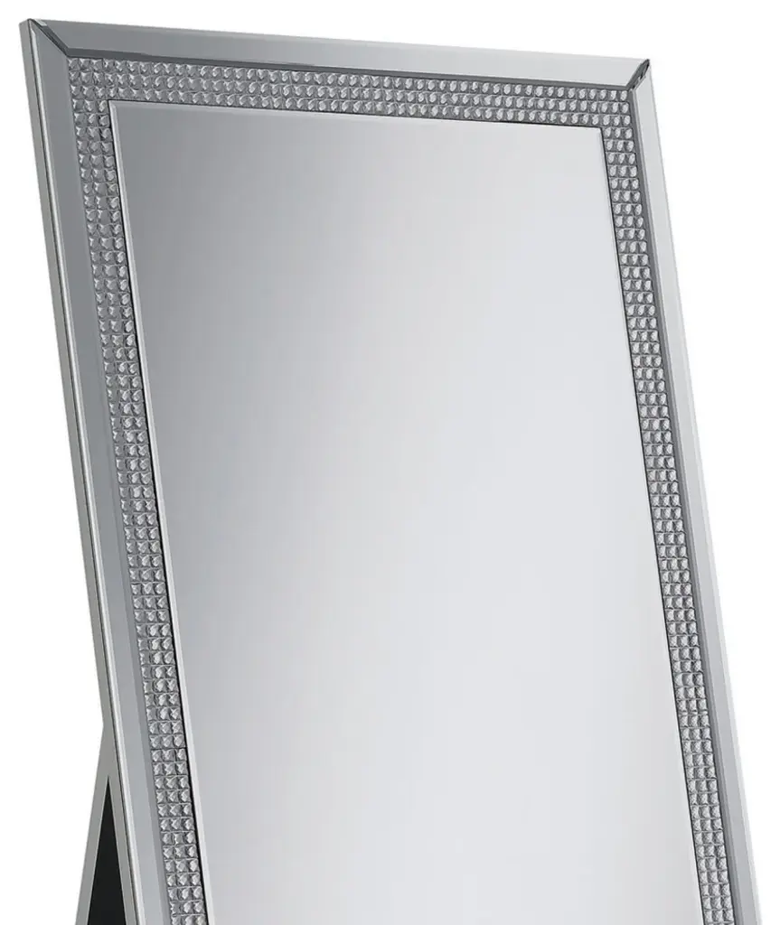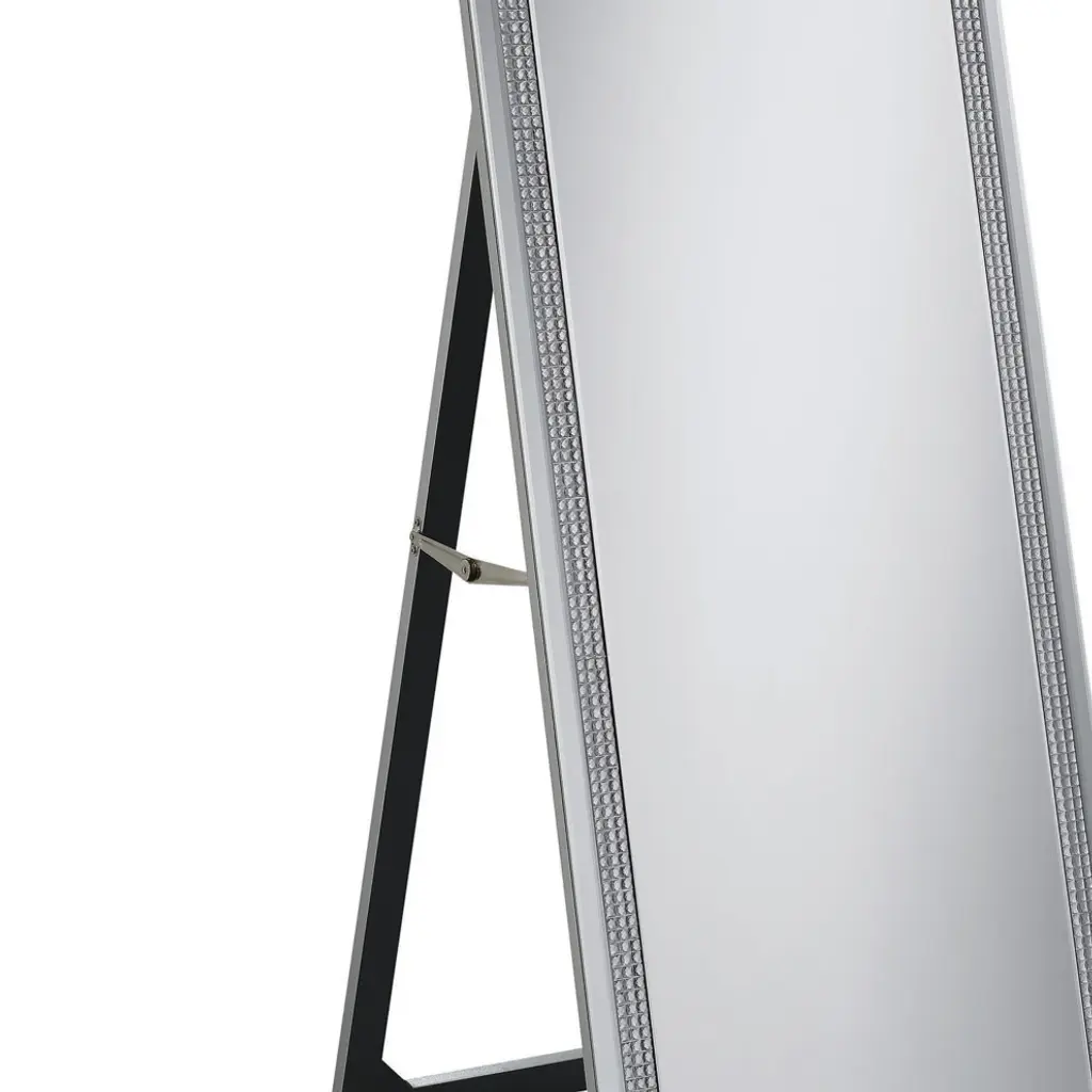 Cheval Mirror with Rhinestone Inlay and Easel Back, SilverThis cheval mirror is here to transform the look of your entire interior setup. The vertical rectangular shaped frame embellished with rhinestone inlay adds to the entire piece. The easel back offers ample support and allows the piece to stand conveniently.