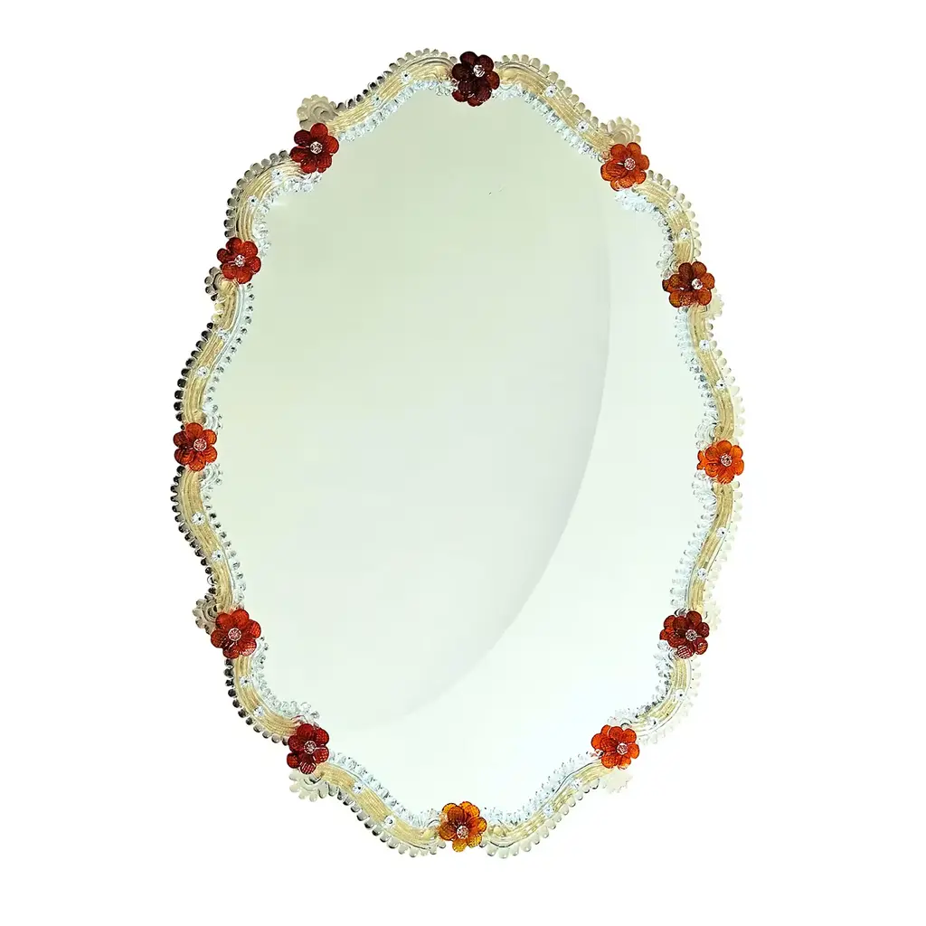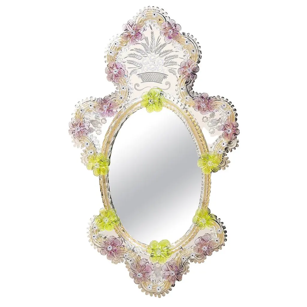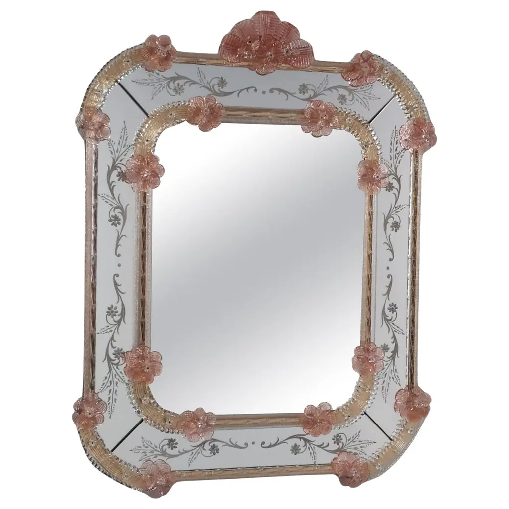This original Venetian mirror is made in the strictest Murano tradition with rich bands carefully engraved by hand. All assembled with crystal and black elements handmade in the Murano furnaces. Wooden frame with a natural finish.