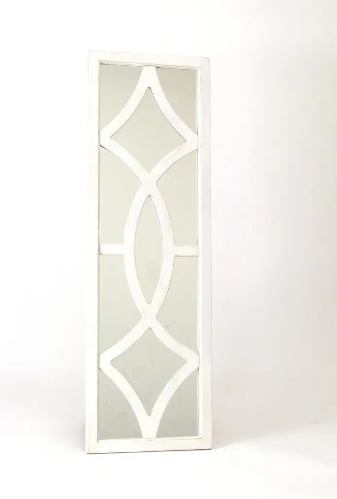A mirror can add interest to your space or complete a look, so let our Churchill Mirror give your room the finishing touch it needs. With its long and narrow design, its eye-catching carved framing and its weathered white finish, it will be the cornerstone of your space.Crafted from pine wood.Measures 16 inches wide and 50 inches tall.