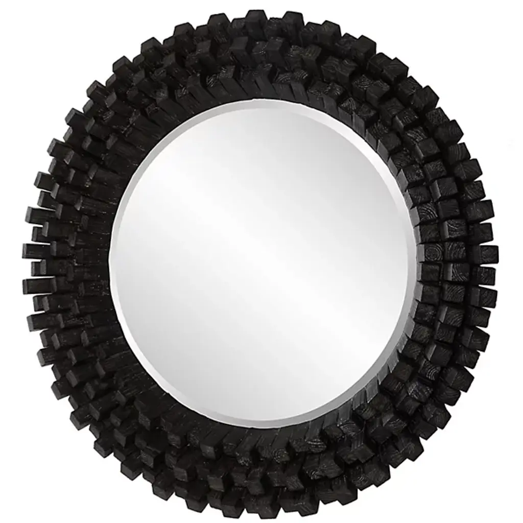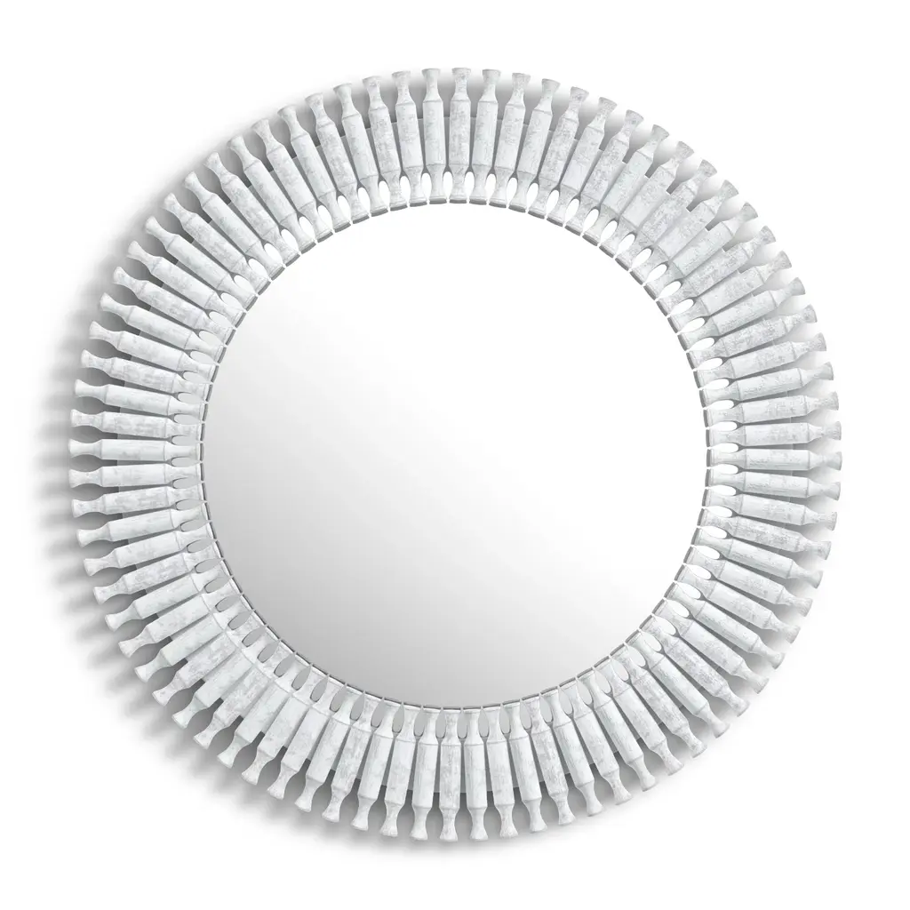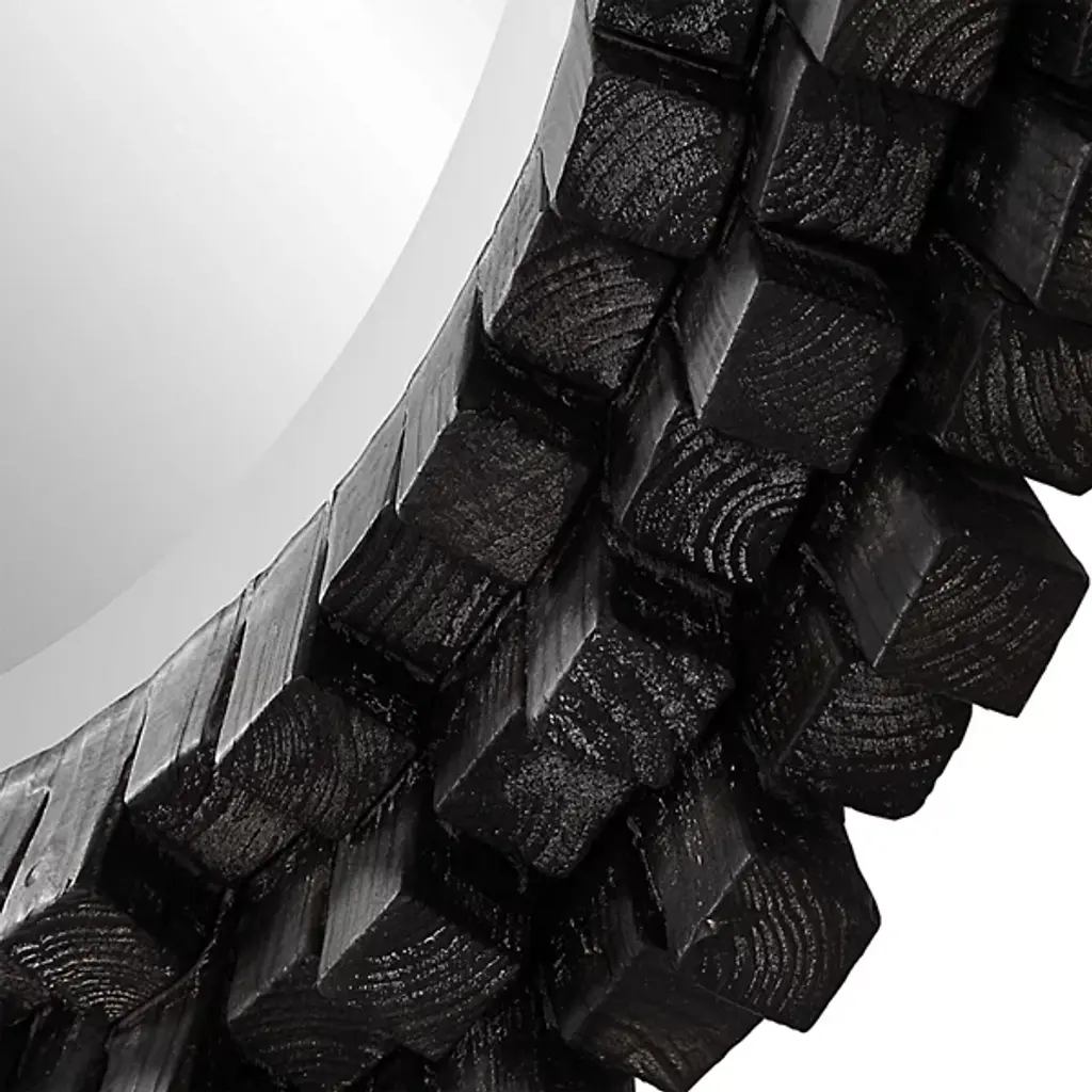 The Circle of Piers Round Mirror from Uttermost exemplifies Grace Feyock's architectural inspiration. Angled pillars of solid fir wood stack at alternating heights around the circumference, forming a vibrant interchange of light and shadow. The textural treatment of the frame adds depth to the design, while the varied heights of the wooden elements create rhythm and movement. This round mirror turns a basic reflective surface into an artful wall sculpture.