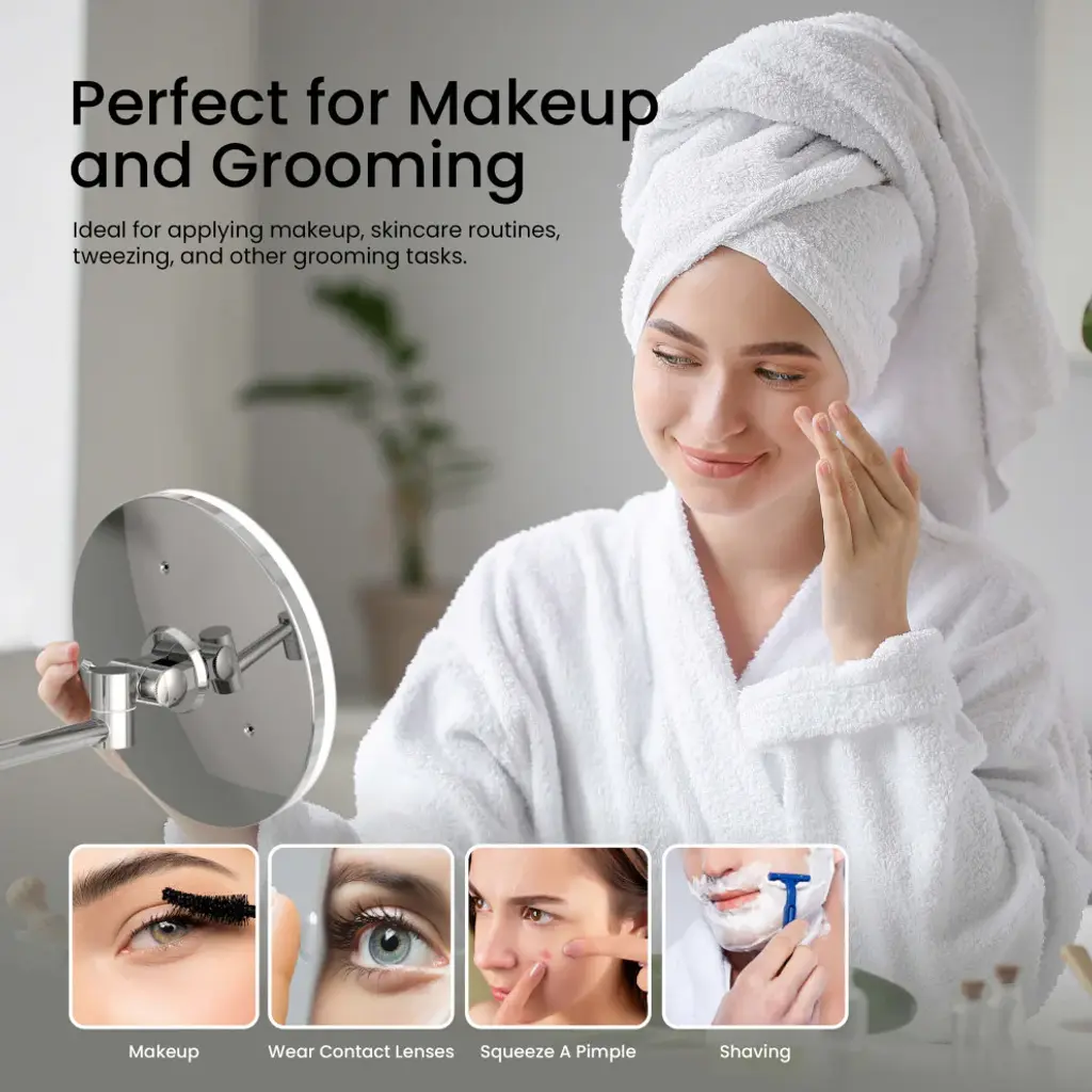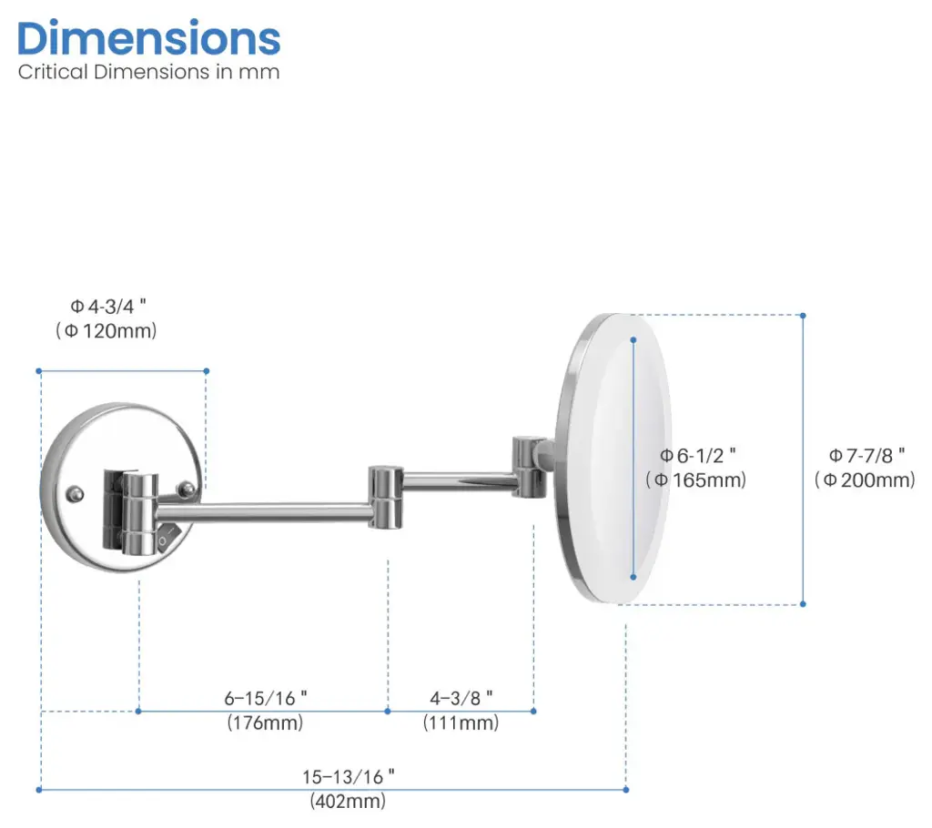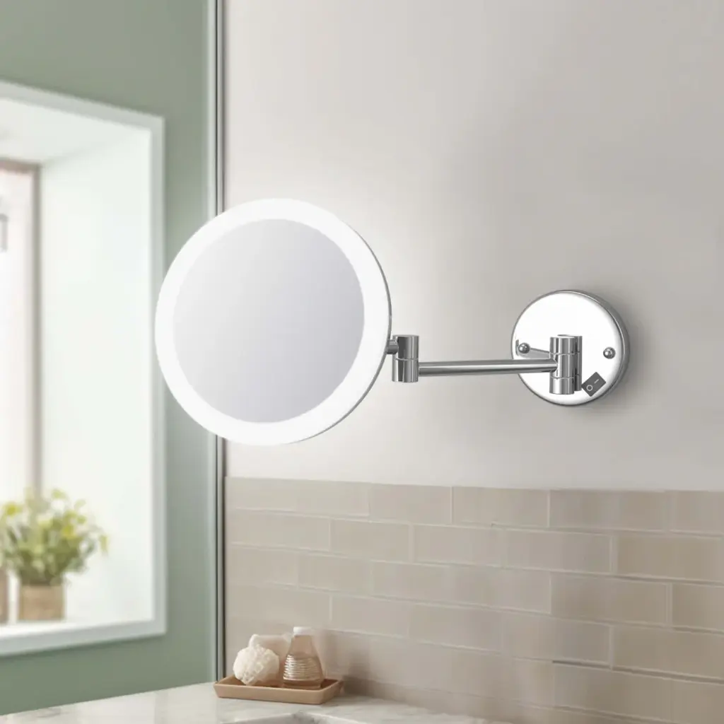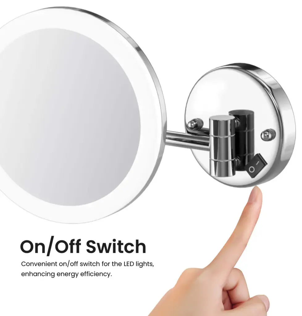 The Circular LED Magnifying Makeup / Shaving Mirror features an extendable arm and 4 rotating joints to adjust its position and angle to suit your makeup or shaving needs; a round mirror with a 5 x magnification for a close-up view. It is made of solid brass for the highest quality, durability, and finish, which can protect against rust and corrosion when exposed to humid elements. This Makeup Mirror is equipped with energy-efficient LED lights surrounding the edges. These bright yet gentle lights mimic natural daylight, providing optimal illumination for your makeup application regardless of the time of day or ambient lighting conditions. Sleek Frameless Design: The LED Makeup Mirror boasts a modern and elegant frameless feature, offering an unobstructed view of your reflection. This seamless design not only enhances its aesthetics but also allows for a larger reflective surface, providing you with a clear and distortion-free image. 360-Degree Swivel Design: The mirror features a 360-degree swivel design, allowing for easy adjustment of the viewing angle. This feature ensures that you can find the perfect position and angle for your makeup application, providing maximum comfort and convenience. Sleek and Durable Construction: Crafted with a stylish and durable frame, the LED Makeup Mirror adds a touch of elegance to any vanity setup. Its sturdy construction ensures longevity, making it a reliable and long-lasting addition to your beauty routine. Energy-Efficient and Eco-Friendly: Designed with energy efficiency in mind, the LED Makeup Mirror consumes minimal power while providing maximum illumination. This not only saves energy but also makes it eco-friendly. Say goodbye to wasteful disposable batteries, as this mirror is hard-wired, reducing your environmental footprint while enhancing your beauty routine. Concealed Installation Option: This LED Makeup Mirror offers a concealed installation feature, allowing it to be seamlessly integrated into your vanity or bathroom space. Designed with a discreet mounting system, the mirror can be easily installed flush against the wall, creating a sleek and modern look. Hardwired Installation for Permanence: Designed for a secure and permanent setup, the LED Makeup Mirror features a hardwired installation option. By connecting directly to your electrical system, this installation method ensures a stable power source, eliminating the need for batteries or visible cords.