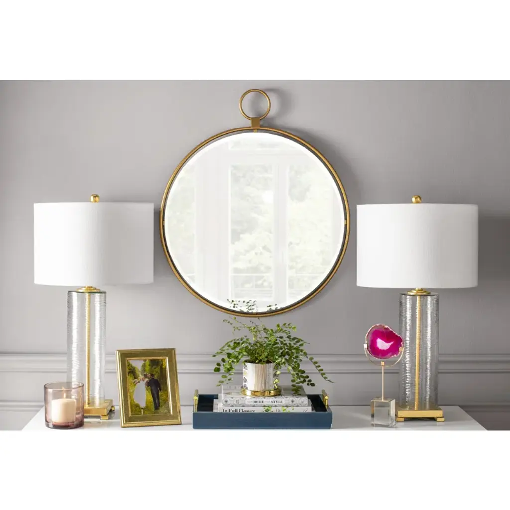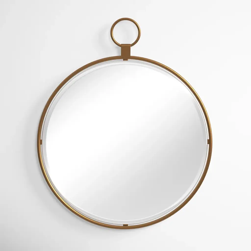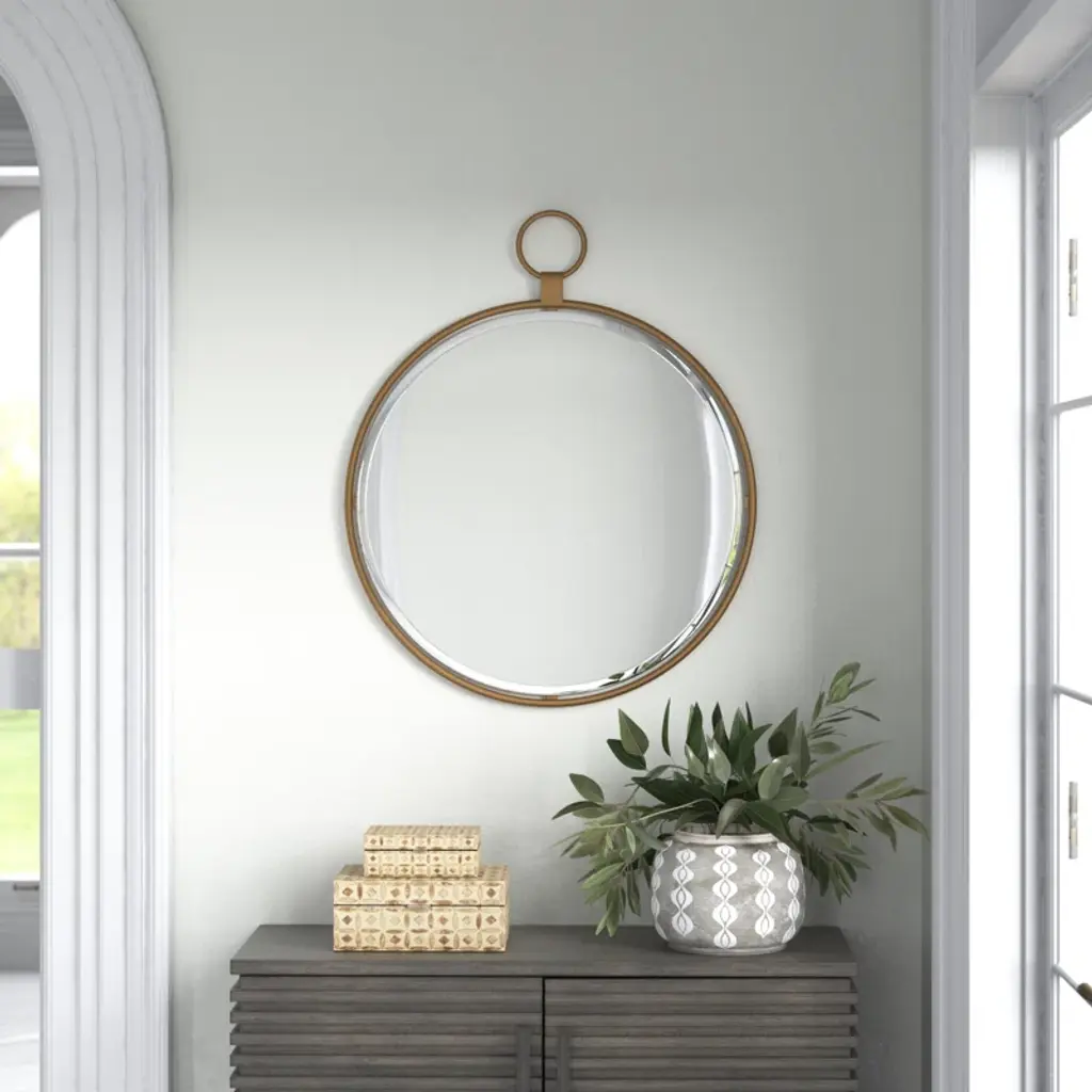 Add sophisticated, sleek style to your walls with this modern accent mirror. It's crafted from metal. The slender frame is capped with a decorative hook finial, which also doubles as another sort of hanger. Within the frame, the glass mirror has a thick beveled edge for a brilliant reflection. Best of all, this mirror arrives fully assembled and ready to hang right out of the box, with pre-installed hardware included.