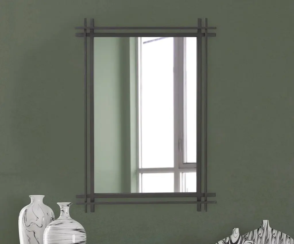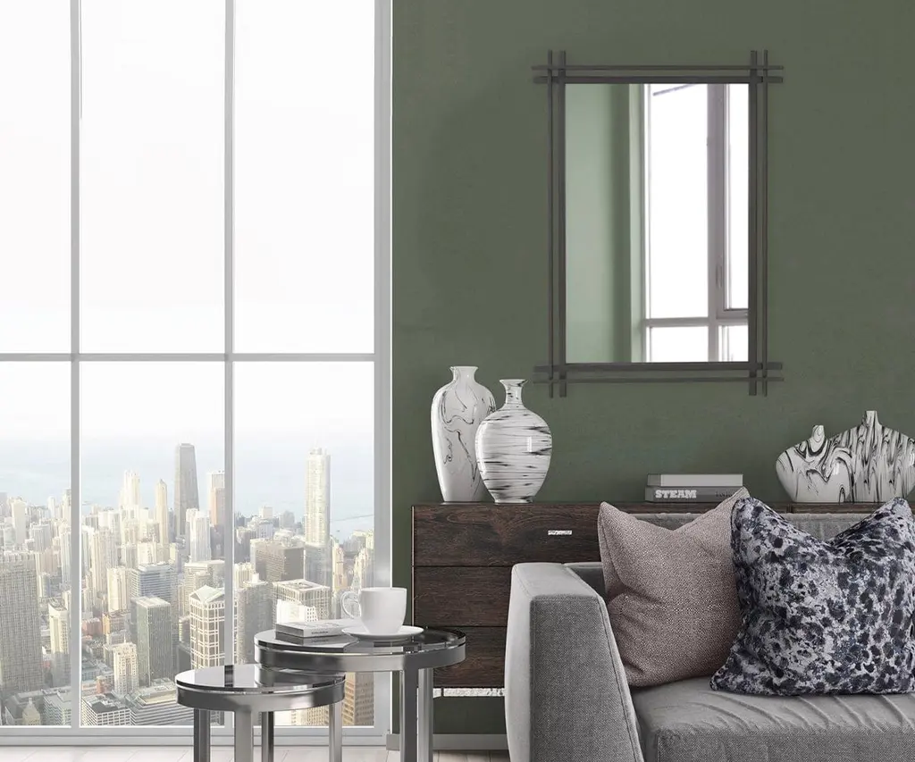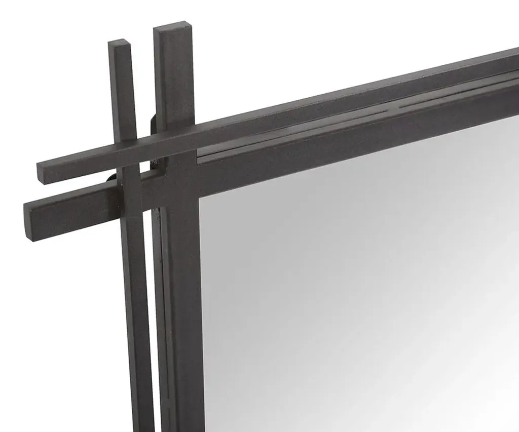 The Clarke Mirror features an iron frame with unique crisscross detailing for visual intrigue, while a graphite finish adds an industrial-inspired edge.