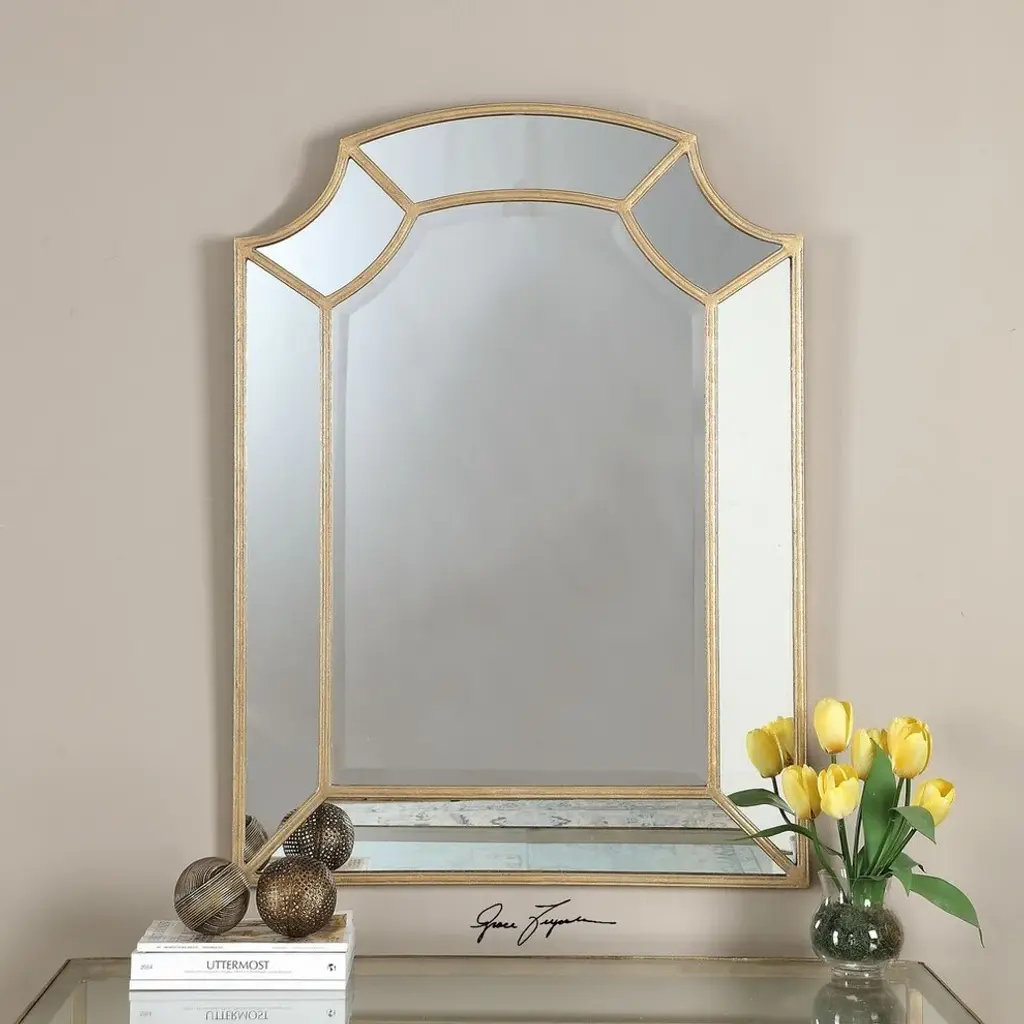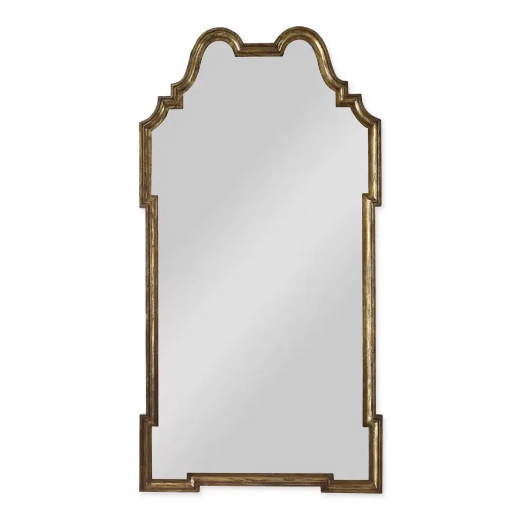 Hand Forged Metal Arch Frame With Scooped Corners, Has A Lightly Antiqued Gold Leaf Finish. Mirror Has A Generous 1 1/4" Bevel. Item: Gold Metal Arch MirrorDesign: Hand Forged Metal Finished In A Lightly Antiqued Gold Leaf. Size: 43. 875'''' H X 32'''' W X 1'''' Deep. Weight: 37lbs. Glass Measurements: 43. 625'''' H X 31. 75'''' W X 0. 187'''' deep. May be hung vertically or horizontally. Materials: Premium METALHeirloom Quality - Expertly hand crafted and hand finishedDue to the hand crafted nature of this piece, each piece may have subtle differences. The mirror has a state of the art back coating that makes it resistant to oxidation and discoloration. Properly weighted hanging hardware is attached.