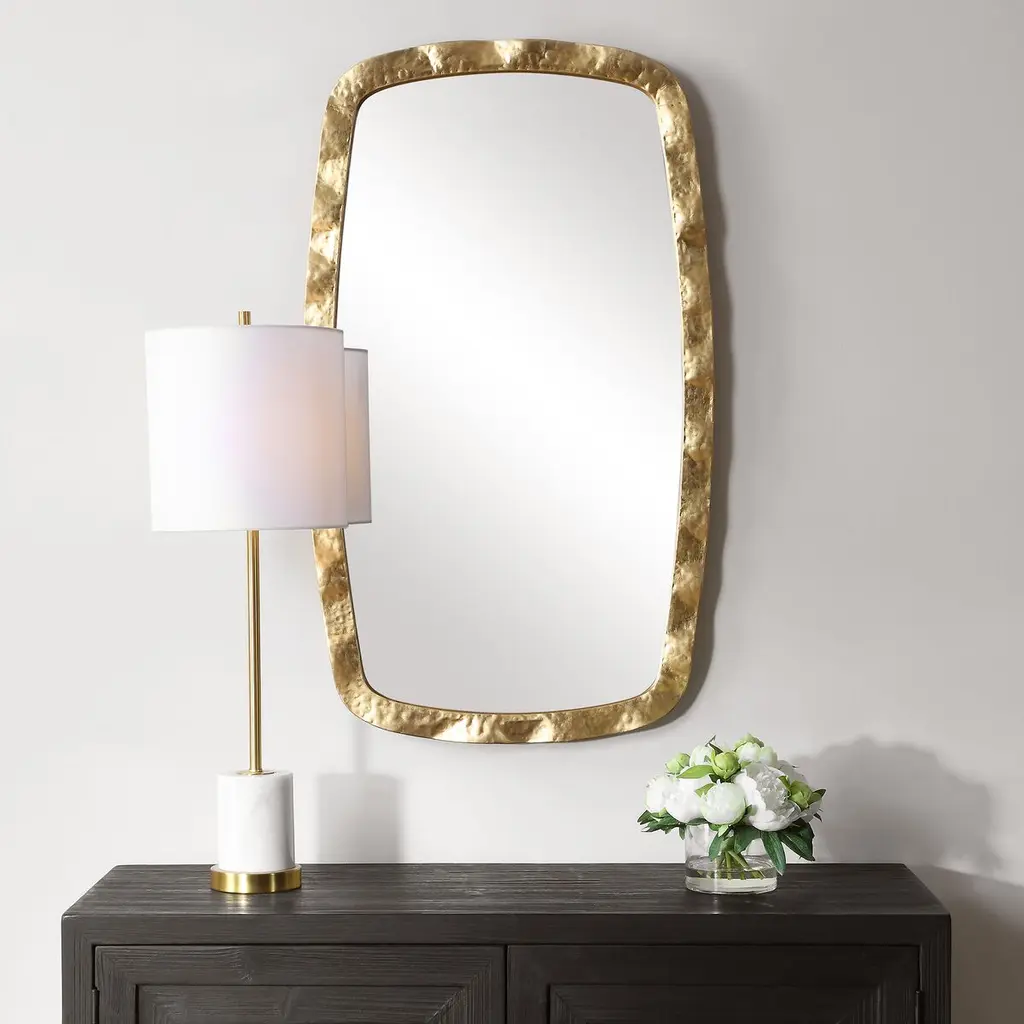 Transform your space with this elegant mirror, a masterpiece of design that captures the essence of romance and sophistication. Its iron frame, with rounded corners and soft, adds a touch of organic interest, inviting you to lose yourself in its gentle curves. The frame's unique design, with sides that gracefully curve out and then back, creates a sense of movement and fluidity, as if the mirror itself is a living, breathing entity. Whether hung vertically or horizontally, this mirror becomes a focal point, reflecting not just your image, but the beauty and elegance of your surroundings. Let this exquisite piece be the heart of your home, where every glance is a moment of enchantment.
