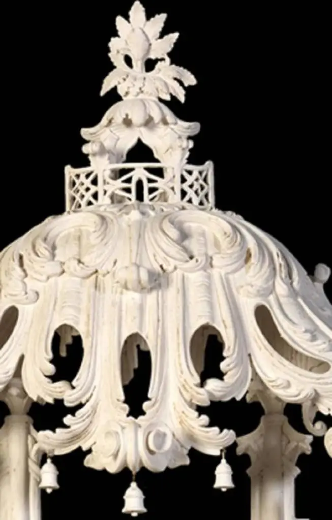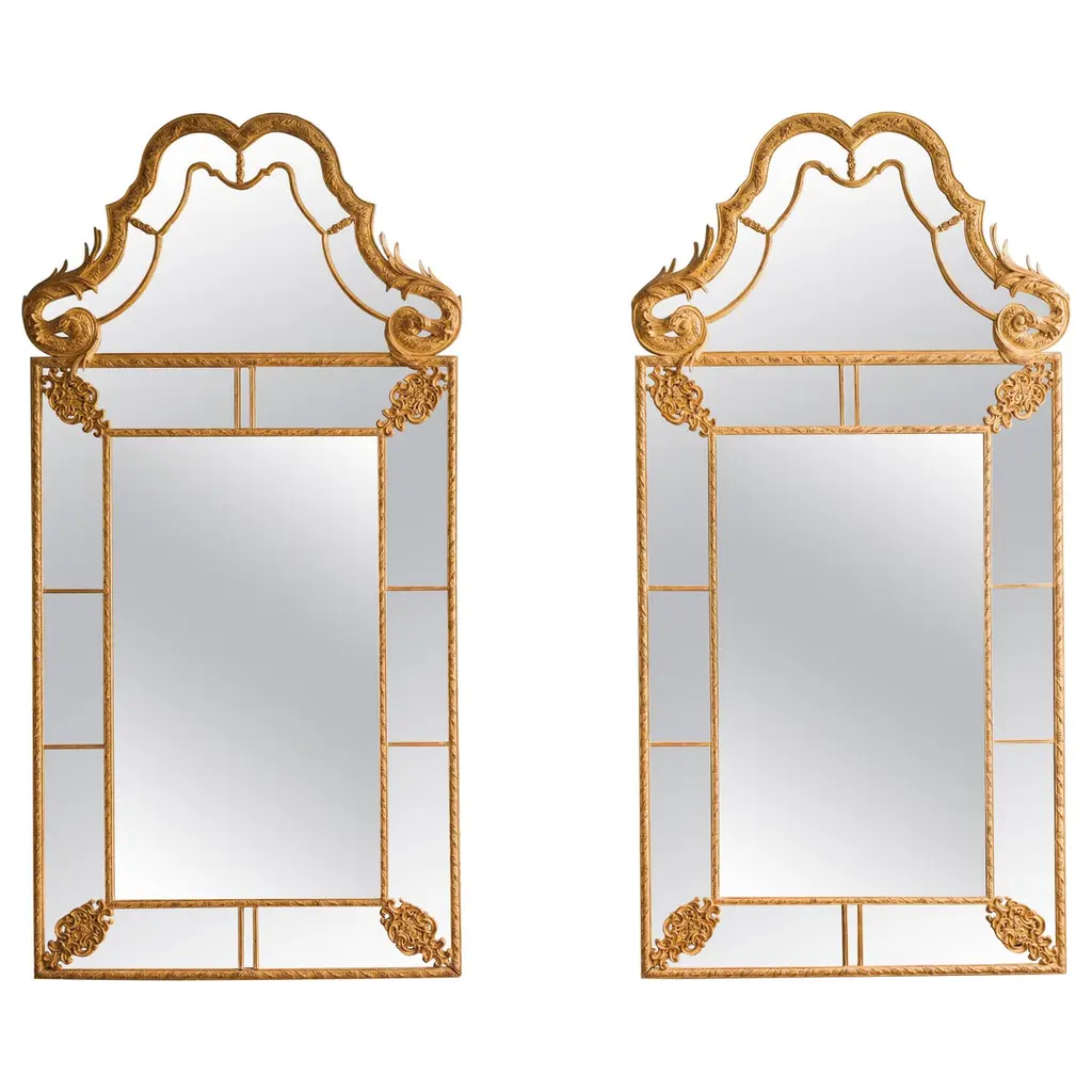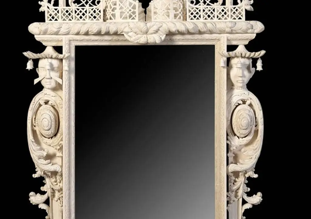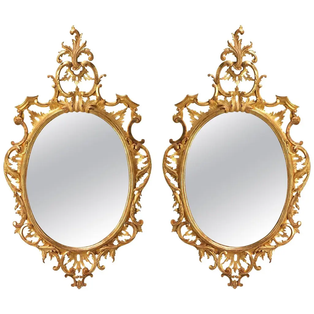 An exceptional pair of rectangular carved pier mirrors, inspired by the Chinese Room of Claydon. The elaborate carved decoration following the style of Luke Lightfoot in the chinoiserie taste, a term used to express the frivolous Chinese style of decoration that enjoyed a tremendous vogue throughout Europe in the mid-18th century. The mirrors take the form of a Chinese fretwork tea house with overhanging eaves trimmed with icicles, bells and exuberant Rococo decoration. The front and sides embowered by clambering vines.We are currently working to a 30-36 week lead time.