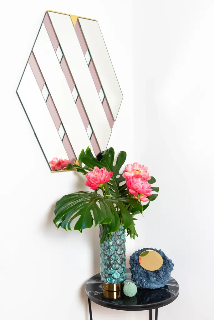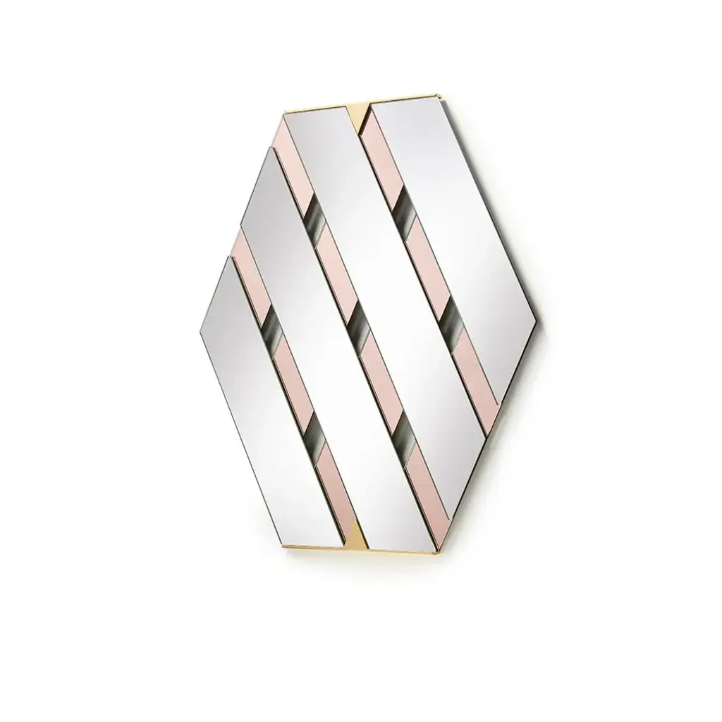 Striped diagonal bands of reflecting surface, which overlap in an elegant optical effect, as many bands of colored mirror. This mirror is reminiscent of one of the most classic Bon Ton hairstyles. Labeled by Maker,Labeled by Maker