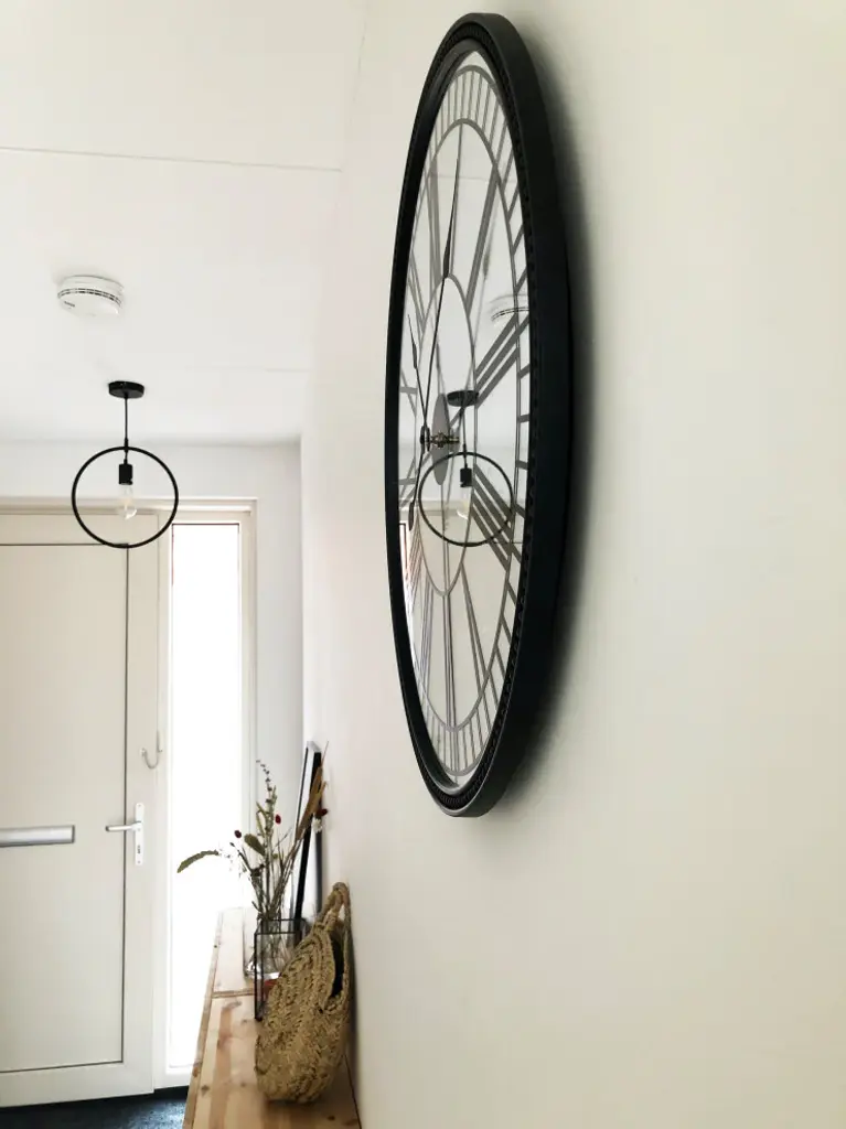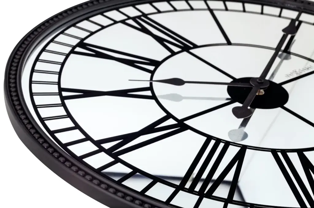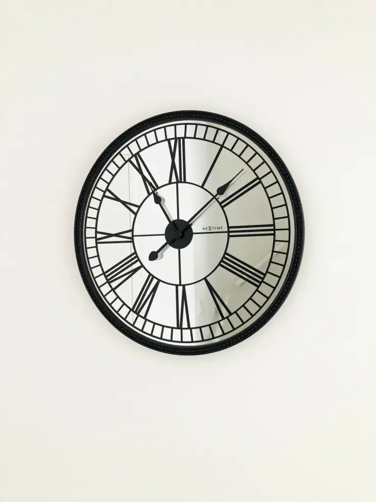 The NeXtime "Cleopatra Mirror" is a large (22inch/56cm) round wall clock. The style is a unique blend of classic and vintage. It is a strikingly beautiful addition to almost any interior design. It has a black plastic case, a printed black roman index and romantic style hands. This clock is silent and works on 1 AA battery (not included).