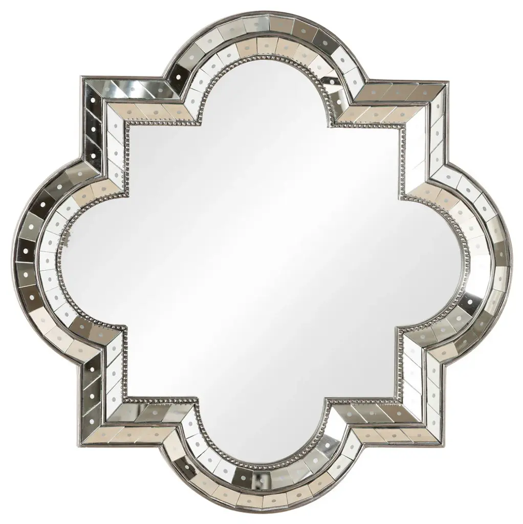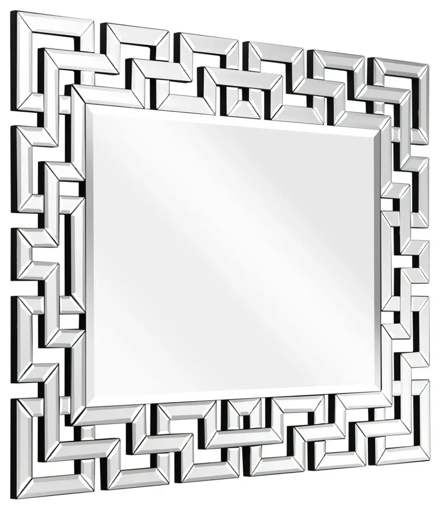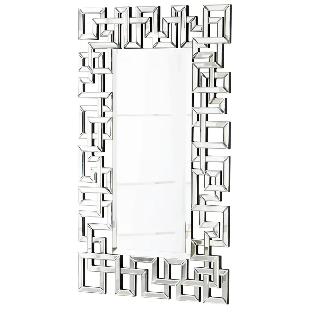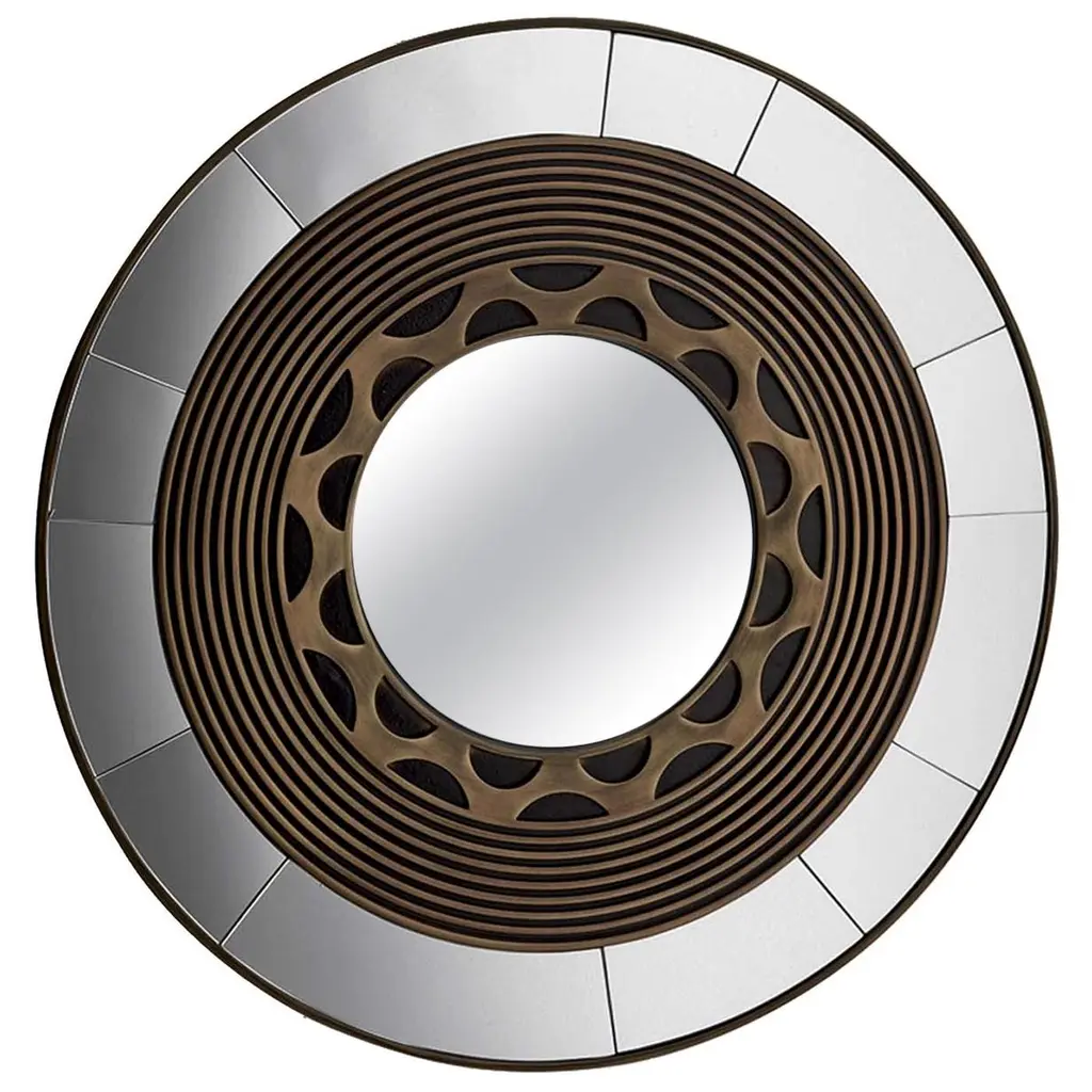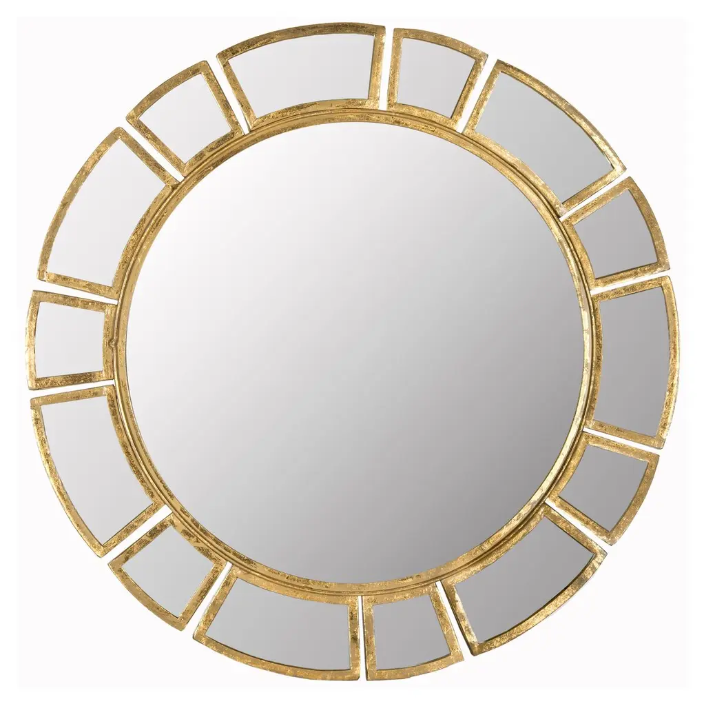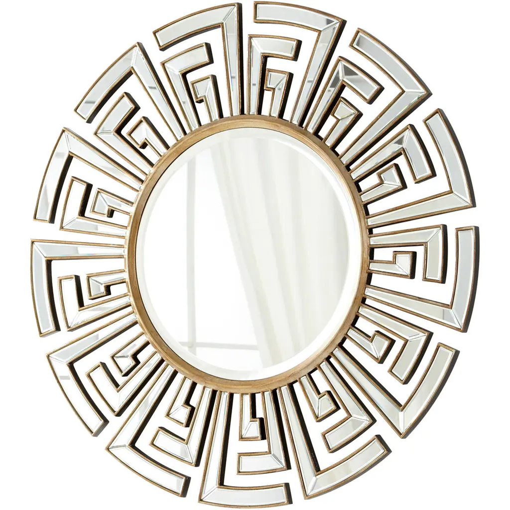 Decorate a bare wall with the Cleopatra Mirror. Featuring a unique gold frame made from mirrored pieces arranged in a Greek key design, this round mirror is sophisticated and eye-catching. Hang it above a bed or sofa as a striking accent piece.