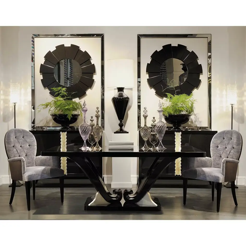 The round mirror of this piece is framed by a sun-shaped wood structure with a glossy black finish for a sophisticated look inspired by art deco.
