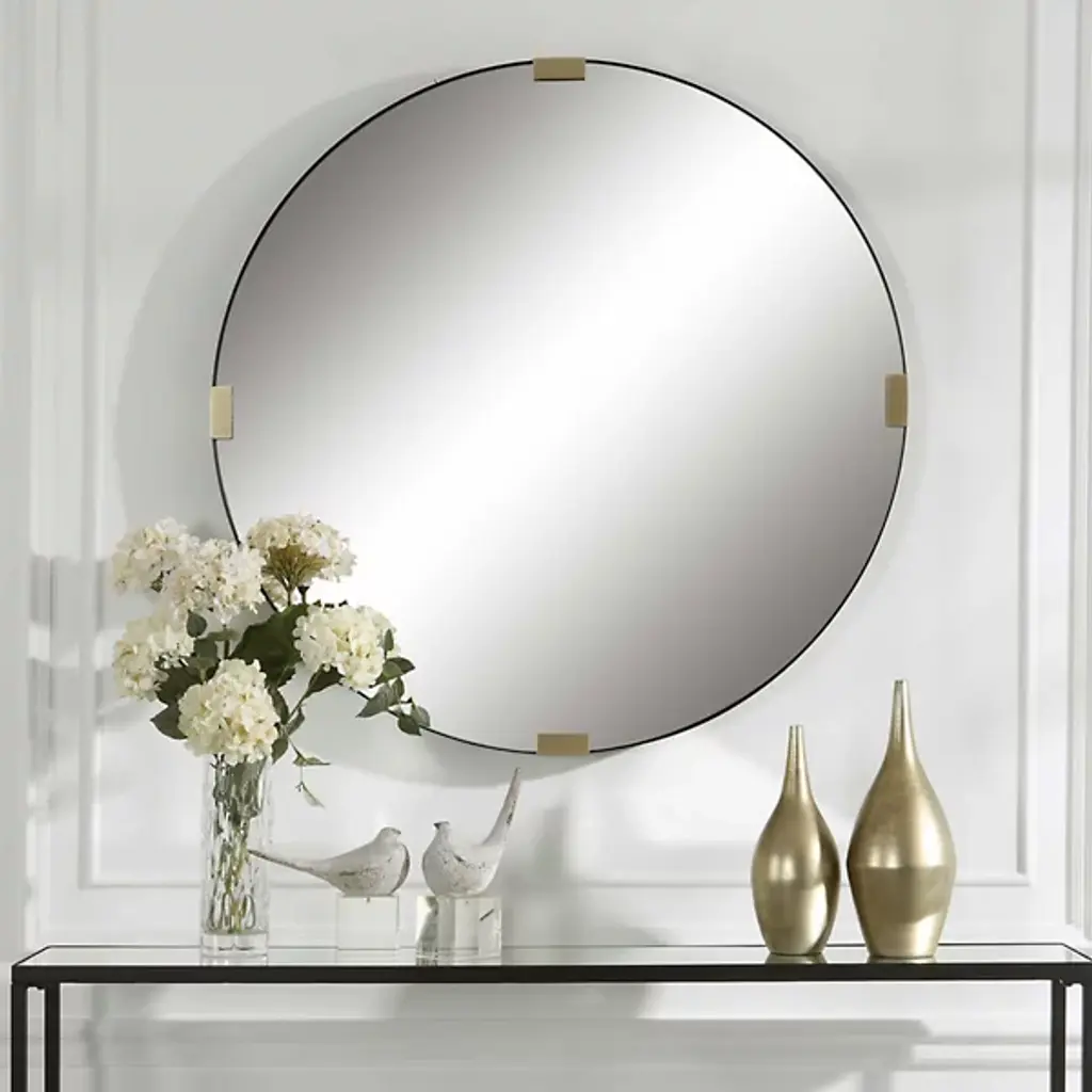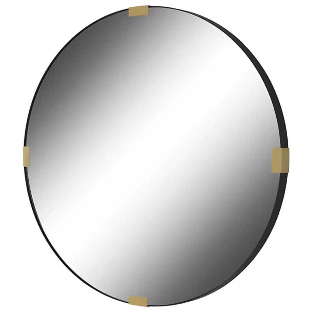 The Clip Mirror from Uttermost, designed by Grace Feyock, takes inspiration from industrial elements, reimagining them for residential spaces. The iron band frame creates clean lines, while decorative accents mark the cardinal points of the circle. The minimalist approach to ornamentation puts focus on the mirror's geometric form. This mirror works especially well in spaces where simplicity is key, offering reflection without unnecessary embellishment. Its purposeful design makes it adaptable to various interior styles.
