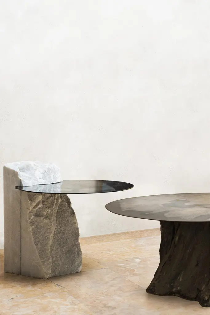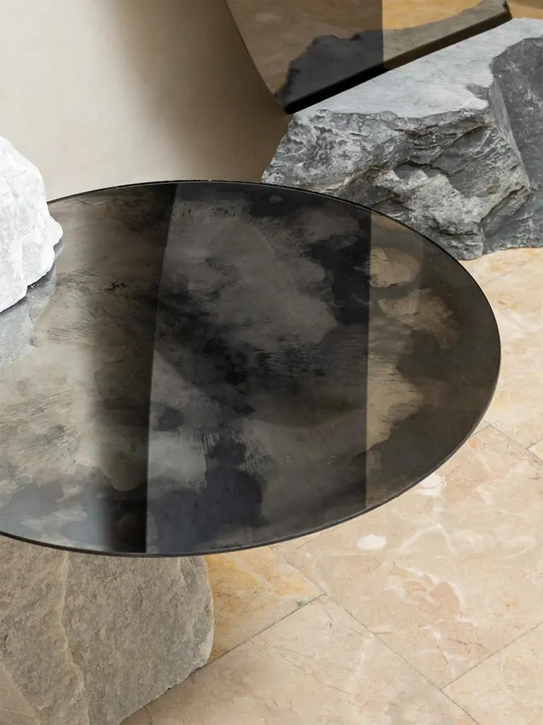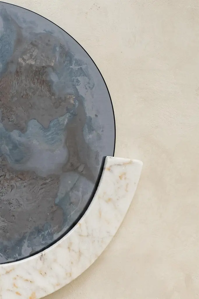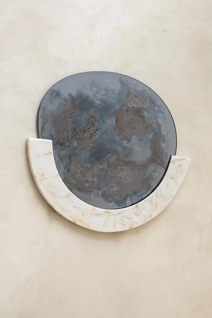 Cloud Mirror I by HomaDimensions: W 54 x D 60 x H 0.4 cm, Half Marble Frame: Ø 65 x 8 x 3 cmMaterials: Smoke and Silver Oxidized Mirror, Clear Glass. HOMA is a contemporary design atelier based in Istanbul. The atelier’s trademark processes are handblown glass, glass fusing and mirroring, created through the use of multidisciplinary techniques and materials. Over time, with meticulous research and experimentation HOMA has acquired unique expertise in mirrors, lighting and home interior objects thus elevating things of function to the status of art. Handcraft HOMA has discovered one of the last remaining masters of handcrafted mirroring in the Eastern Mediterranean. The atelier is original in its simultaneous use of different techniques to create organic and flowing mirror shapes. Each piece celebrates reflection, translucency, movement, light, time, multiple layering and aesthetic, spontaneity…Object HOMA’s pieces are an exploration of organic, abstract, as well as unexpected flowing lines and shapes. Our design service offer is presented in a catalogue of over 50 designs in fluid and geometric shapes achieved through multidisciplinary techniques.Materiality Through the use of mixed textures and the layering of mirror elements unexpected effects are created on glass, which play with one’s visual perception as well as the surrounding space. Glass, stone, marble, messing mirror techniques, bronze, wood and clay are just some of the Earth’s materials that find their way into HOMA’S offerings. HOMA offers a vast materials library.Architecture Formally trained in interior architecture, HOMA founder, Tuğba Koç has transformed her knowledge and experience into layered aesthetic design objects. Now, with a team of architects and artisans, Tuğba applies her hands in a workshop environment on interior and exterior objects to enrich earth-derived, breathing, living materials. HOMA’s interior objects are informed by art and driven by the philosophy that nothing artificial should be allowed to interfere with the energy of one’s living environment.