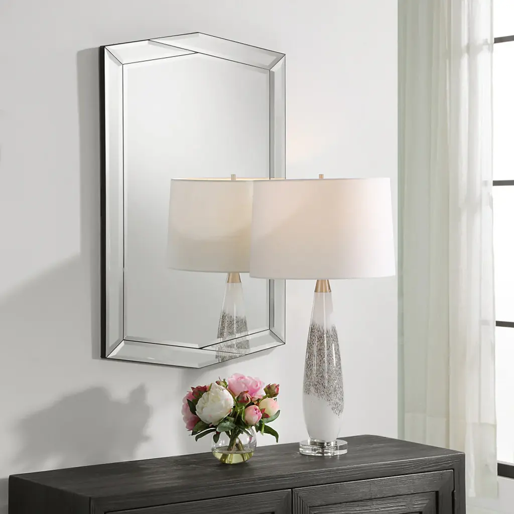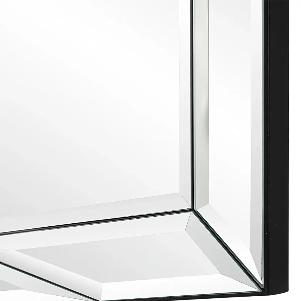 This mirror adds a modern twist with its asymmetrical design. While the top and bottom panels are positioned off center, they form a diamond peak. The side panels are complemented with a .5" bevel on the center mirror and a black frame completes the look. May be hung either vertically or horizontally.