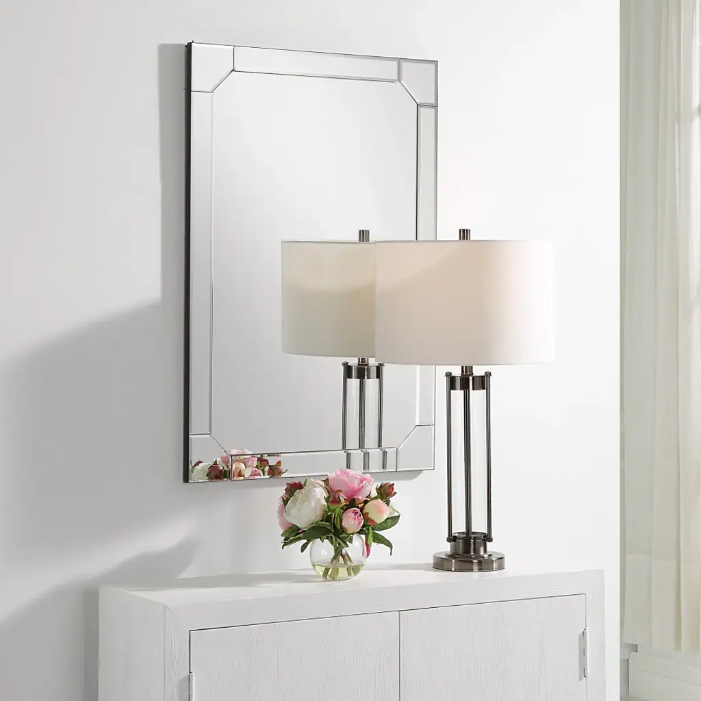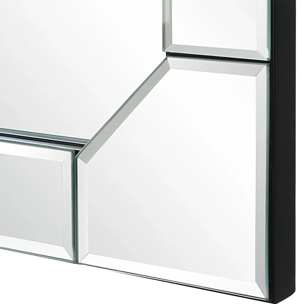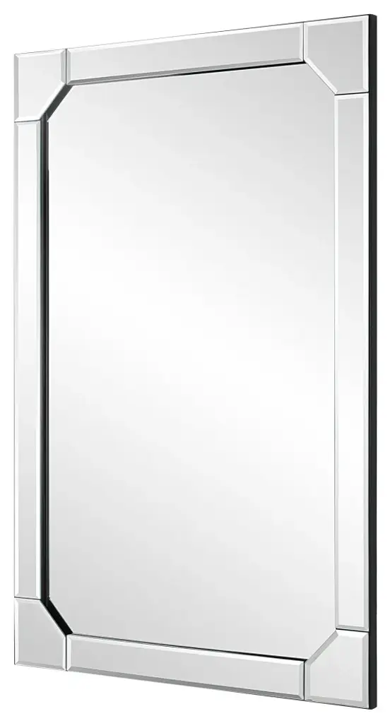 This elegant mirror features clipped inside corners which bring attention to the simplistic details. Each panel is finished with a small bevel, leaving the center mirror with a clean look. Give your master bathroom or powder room an elevated look or place over a chest in the foyer. May be hung either vertically or horizontally.