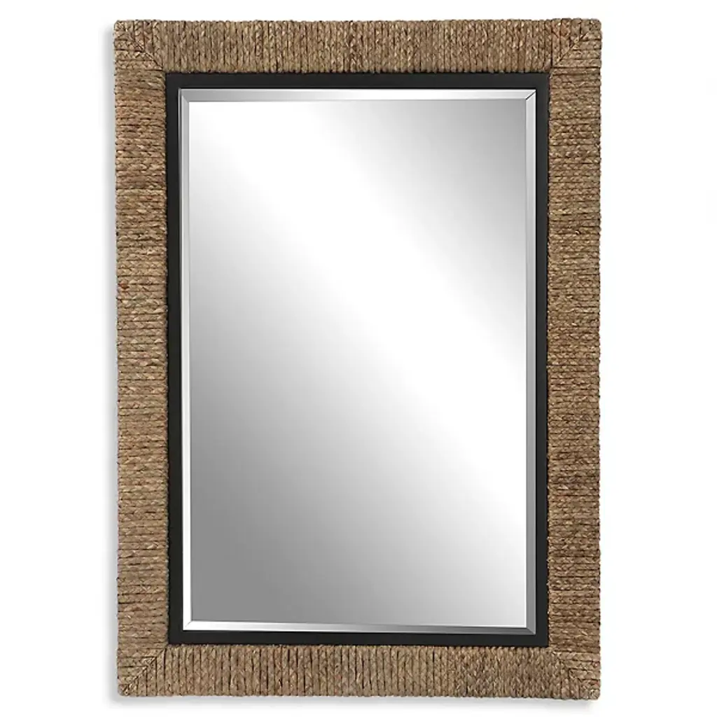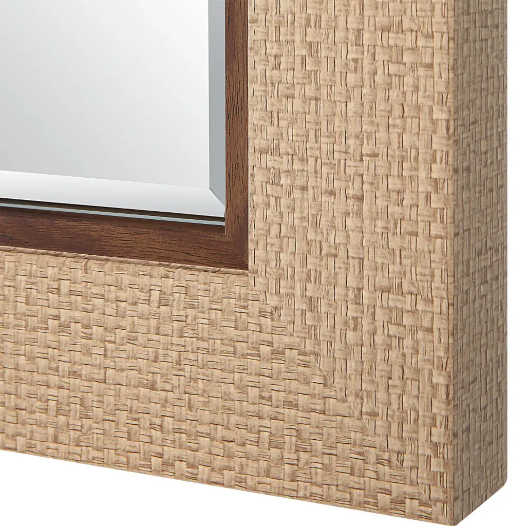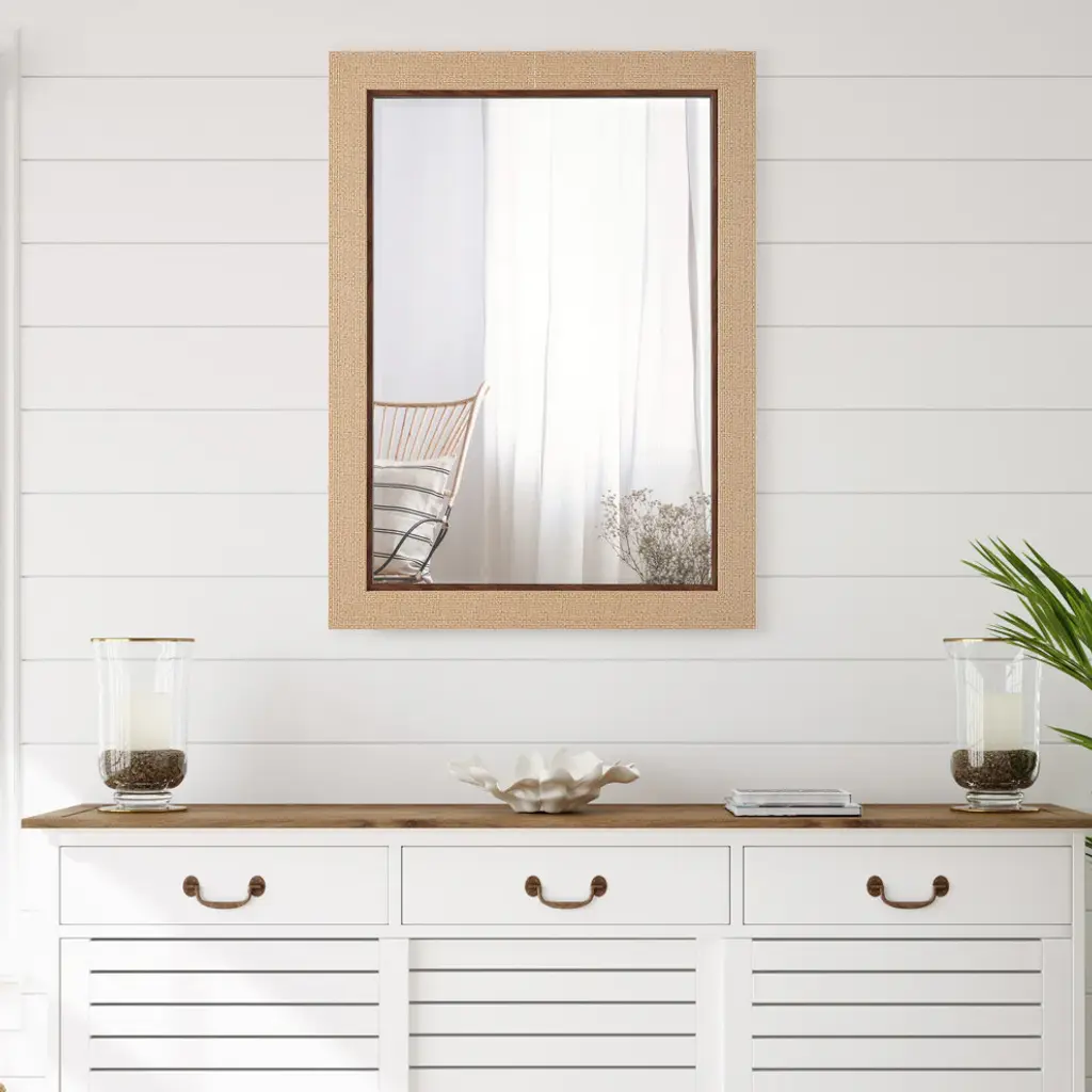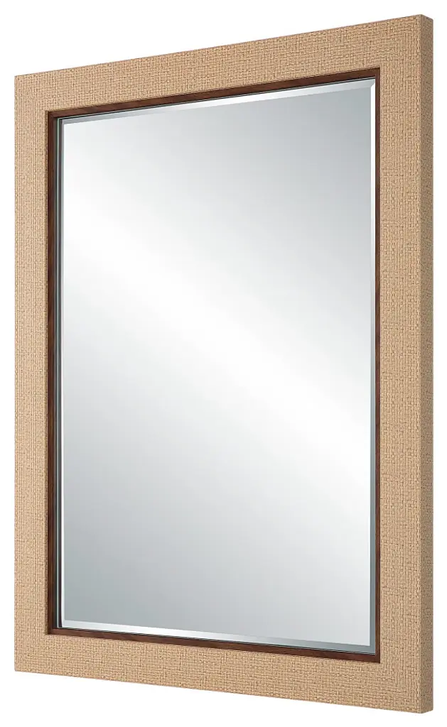 Perfect for any coastal decor, this frame is designed to resemble a natural basket weave. The frame uses a textured wrap that gives the authentic look of natural material, without the worries of moisture, giving you the option to use in a bathroom. The beige coloring of the frame is complemented by a dark brown liner that surrounds the 1" beveled mirror. May be hung either vertically or horizontally.