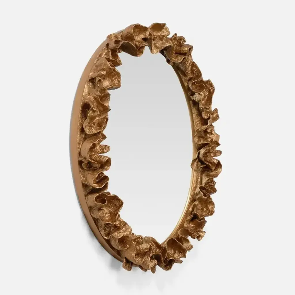 Leaf coral was the inspiration for this remarkable piece. Hours of molding and hand painting are necessary to fashion the Coco's undulating oval of white coral. For a less casual interpretation, a thin silver or gold tip is applied to the end of each ''leaf.'' This mirror has a ruffled frame with an approximate 6” depth.