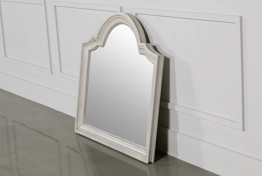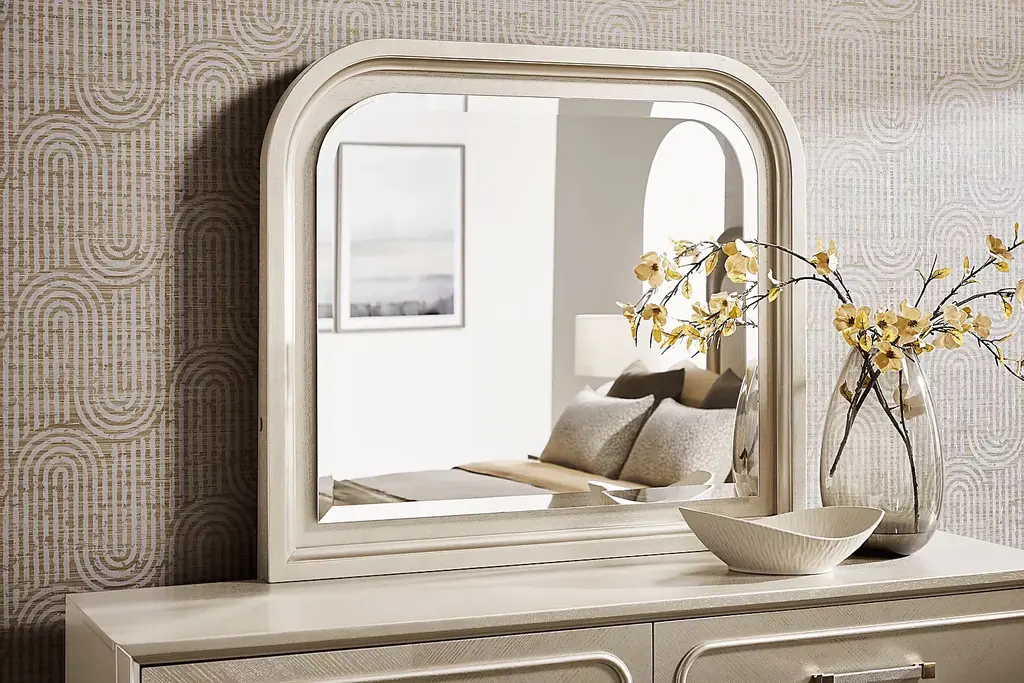 The serene glow of early morning light reflecting off city windows finds its form in the Colette collection's sculptural elegance and sophisticated ease. Contemporary in style, this mirror is crafted with beautiful ash veneers in a soft silver finish that radiates understated glamour. A sleek waterfall silhouette paired with beveled frame creates a graceful and poise look.