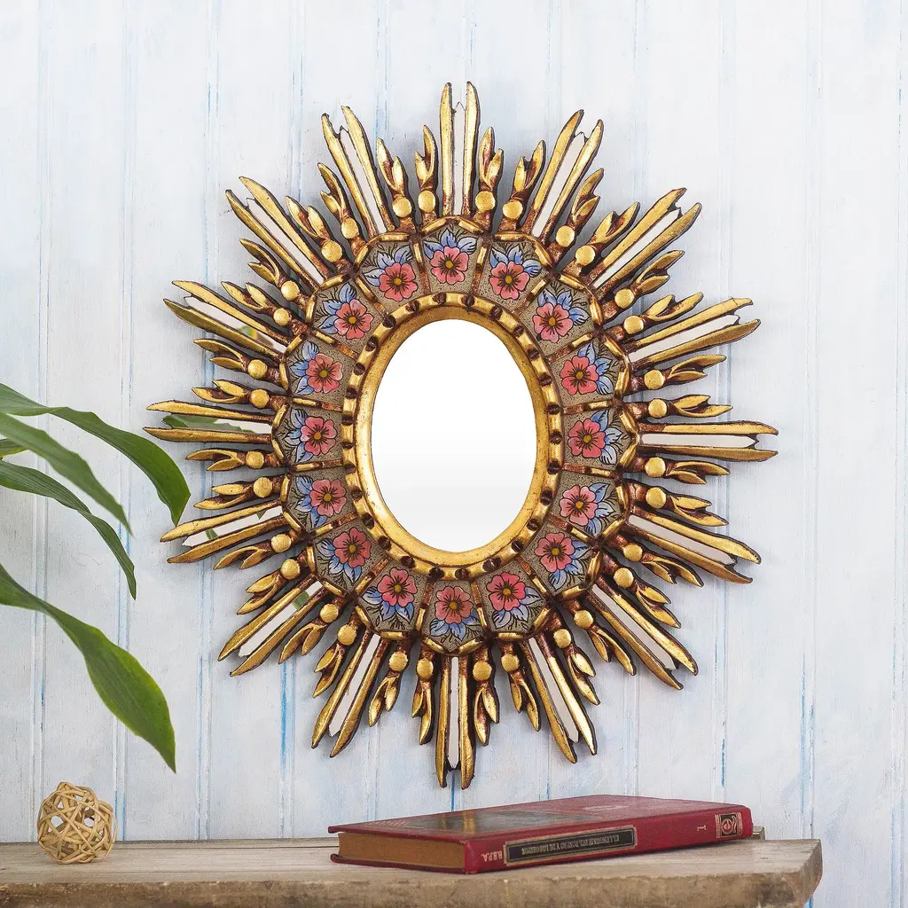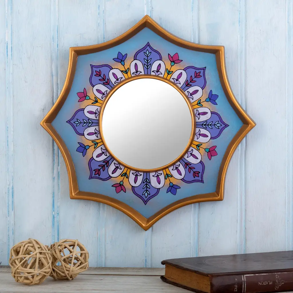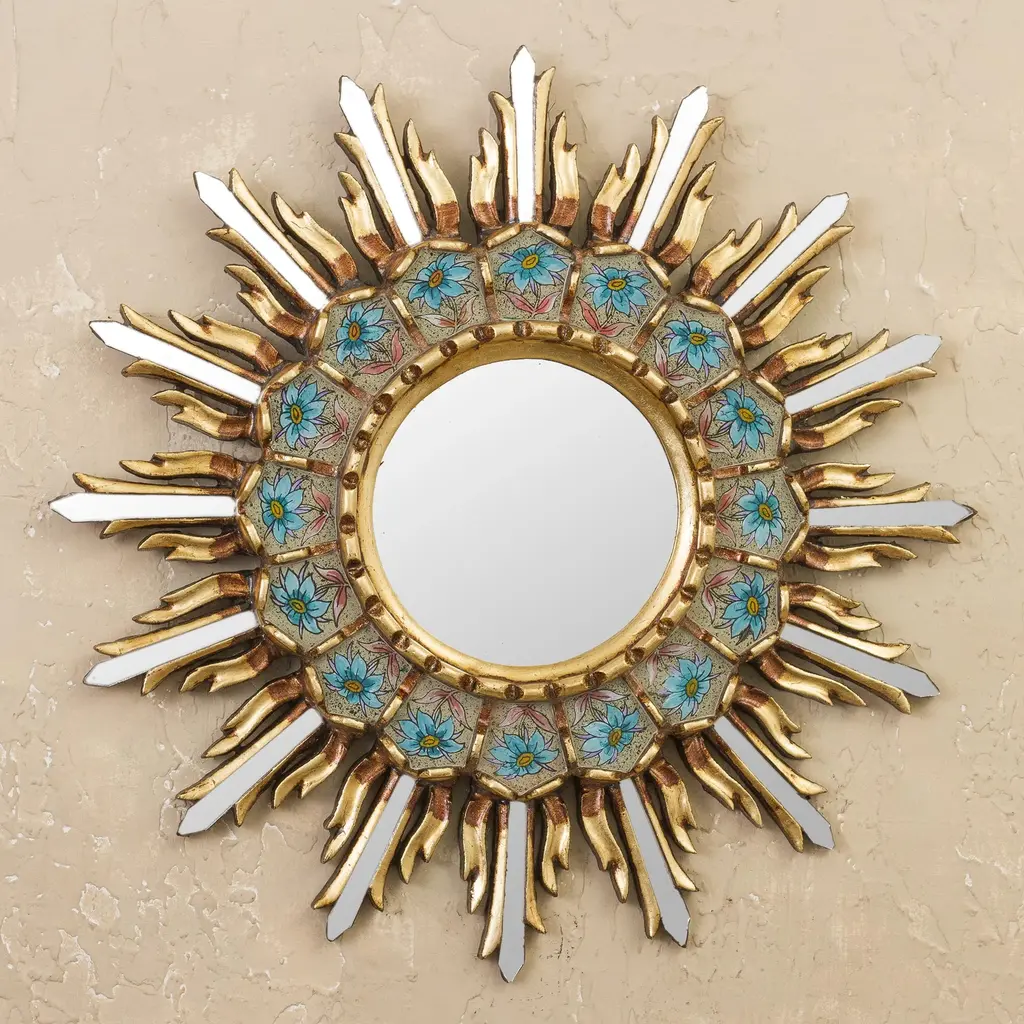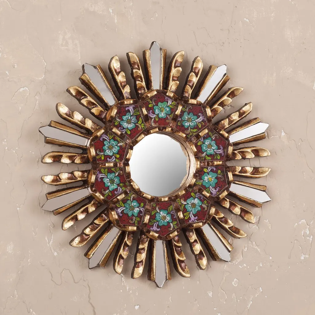 Inspired by the colonial art styles of the "Cuzco School", artisan Gliseria Soto crafts a small but impressive wall mirror in a snowflake-like shape. The frame is carved by hand from mohena wood and embellished with bronze leaf. Preserving a time-honored technique, Soto adds small panels of reverse-painted glass to the frame. The result is breathtaking.