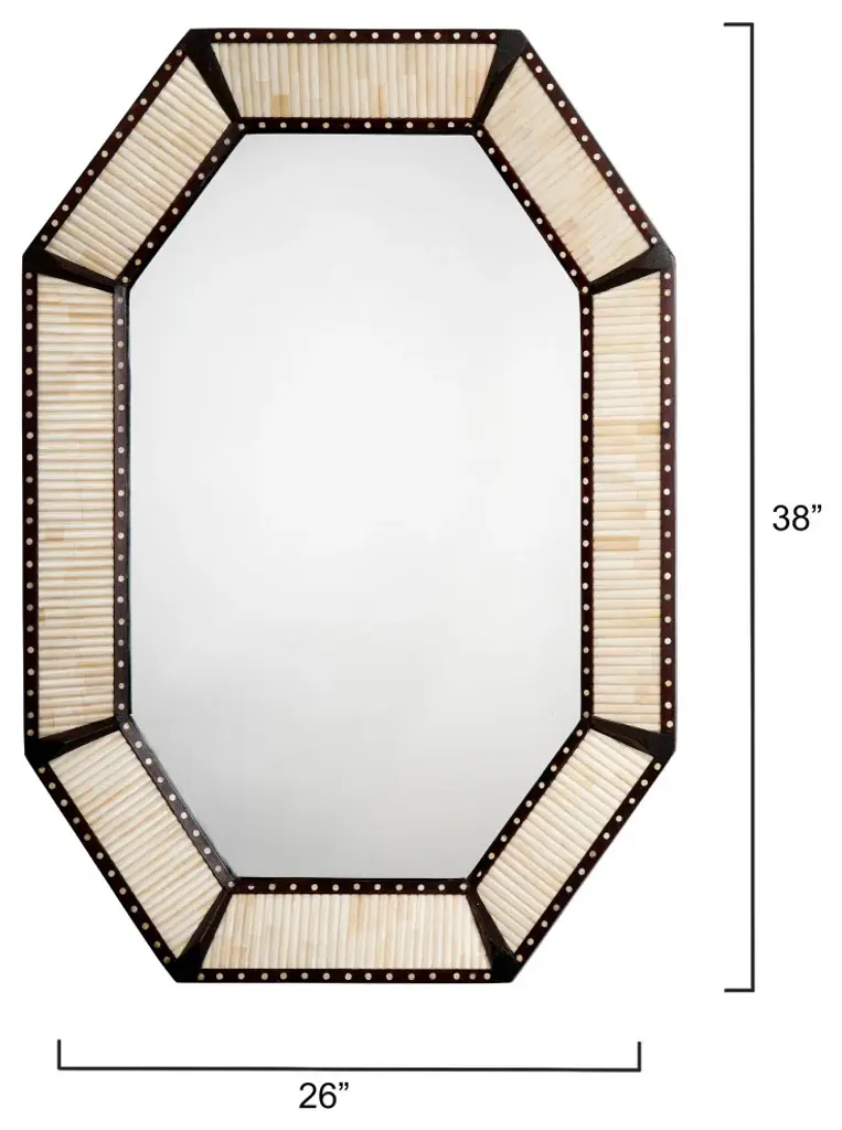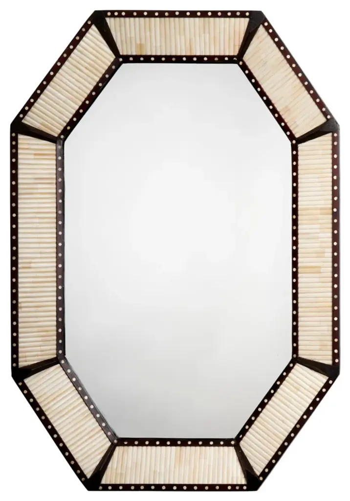 The timeless look of this handcrafted mango wood wall mirror is enhanced with a unique octagonal frame accented using the ancient decorative tradition of bone inlay. Sure to be cherished for generations, it can be hung vertically or horizontally to add light and dimension to any room of your home. Hand-crafted of Mango wood and Camel Bone InlayNon Beveled Glass MirrorVersatility of hanging vertical or horizontalHand-carved Camel bone in varying shapes and sizesWall MountedThe handcrafted nature of this wood creates products with character and individuality. The inherent knots, grains, and variations in tone and texture, are preserved, to create pieces rich in detail and natural beauty. These unique imperfections and variations are what define our products, with each piece having its own personality. Mirror Surface: 30"H x 18.5"WCleat Hanging MechanismFrame: 4"W x 2"DMDF Backing, Dark Brown TatronCare Instructions: Wipe frame with a soft, dry, lint free cloth. Wipe glass with standard glass cleaner. DO NOT use cleaners or abrasives on mirror frame.