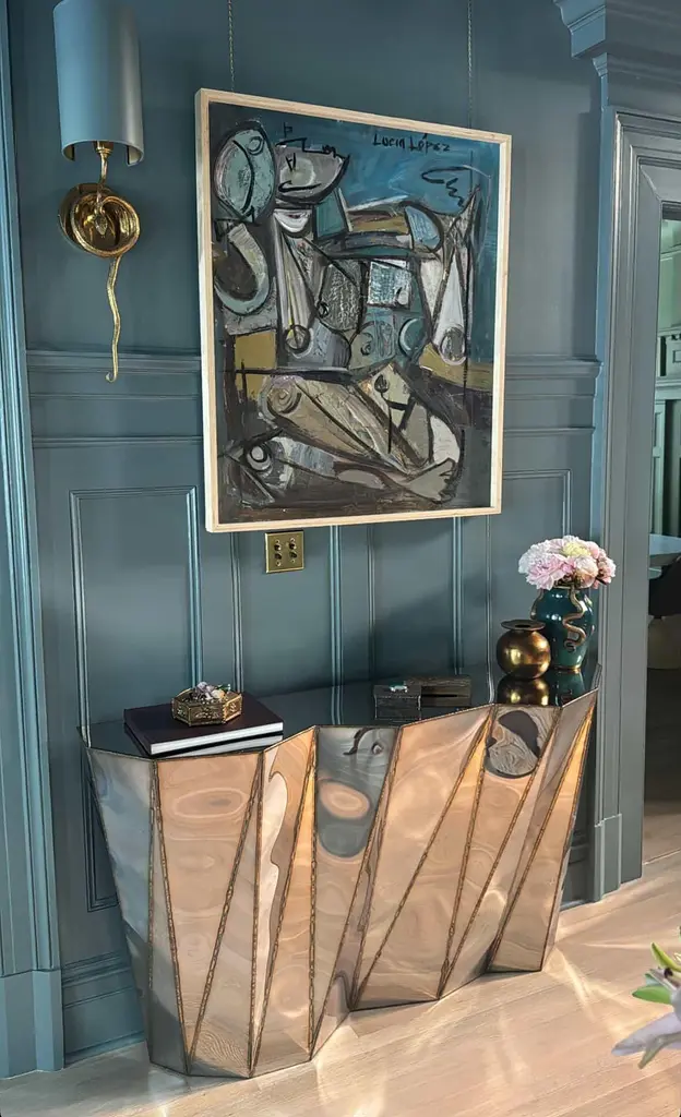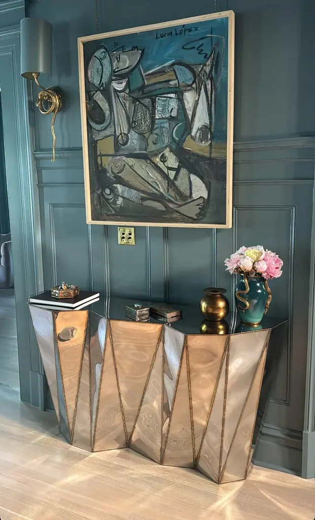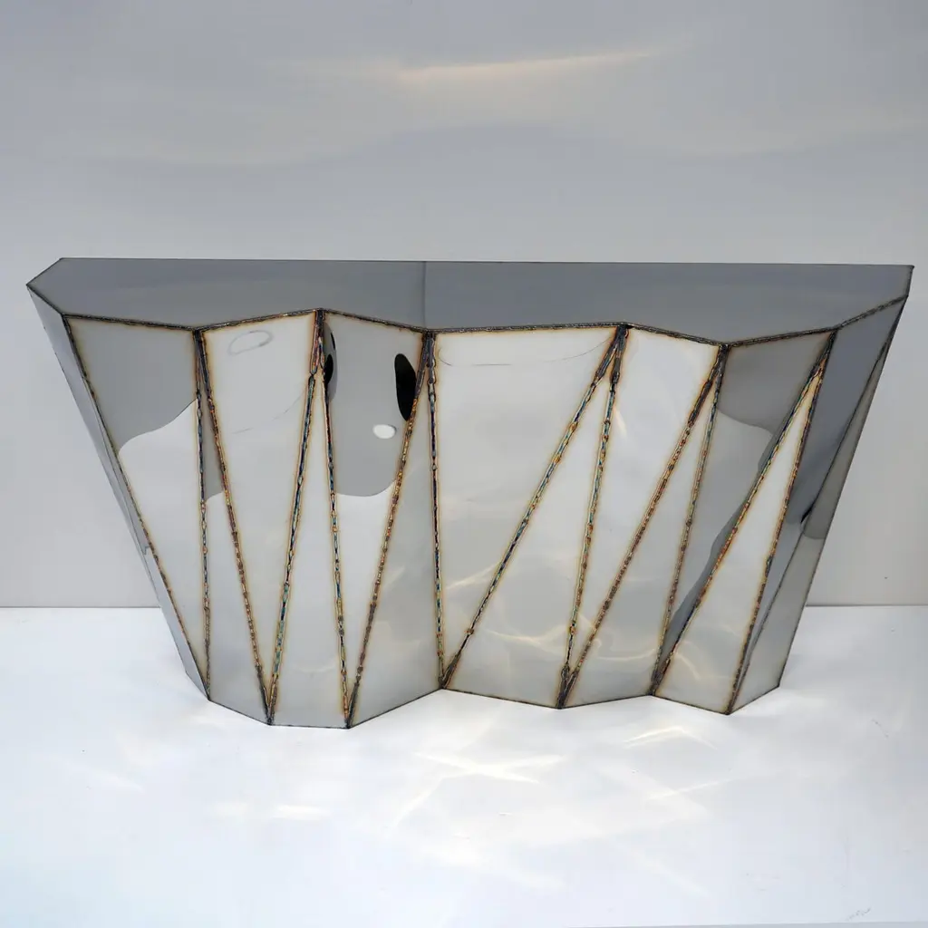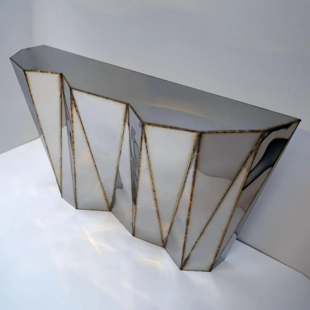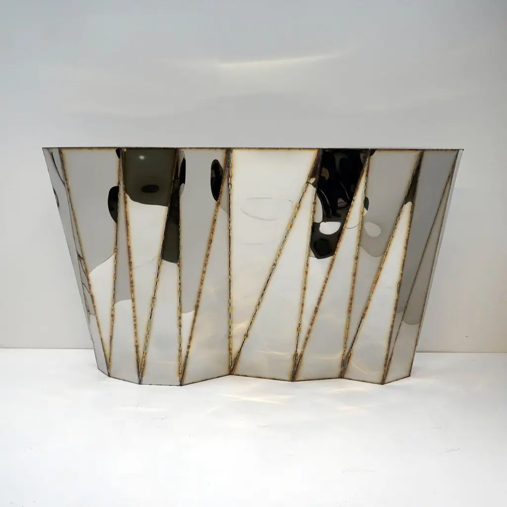 Concertina Console in Welded Mirror-Polished Stainless Steel by Julian MayorLimited Edition of 8 + 4AP.Dimensions: D 43 x W 160 x H 89 cm. Materials: Mirror-polished stainless steel.Julian Mayor is a British artist and designer renowned for his sculptural works crafted from welded sheet metal. Using high-tech design processes, the artist creates each piece digitally on a computer before building it by hand in his workshop. Born in 1976, Mayor graduated with a BA in Industrial Design from the University of Northumbria in 1998, followed by an MA from the Royal College of Art in Design Products under Ron Arad. After graduating in 2000, he moved to Northern California and worked for a design consultant agency as a product and interior designer. By 2004, Mayor returned to London to work for UK-based agencies, including Pentagram, and collaborated with British designer Tom Dixon. The artist’s work has been exhibited at the Victoria & Albert Museum, London, the Museum of Arts and Design, New York, MUDAC Lausanne, Switzerland, and the Yorkshire Sculpture Park, UK. He has installed a permanent series of sculptural benches in a park behind the Tate Britain in Pimlico, London. Mayor lives and works in Doncaster, South Yorkshire, UK.
