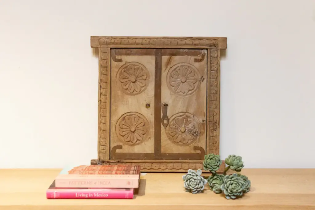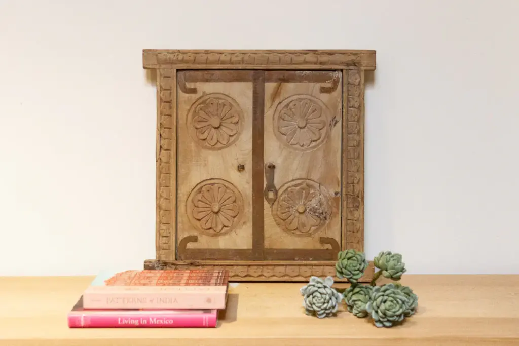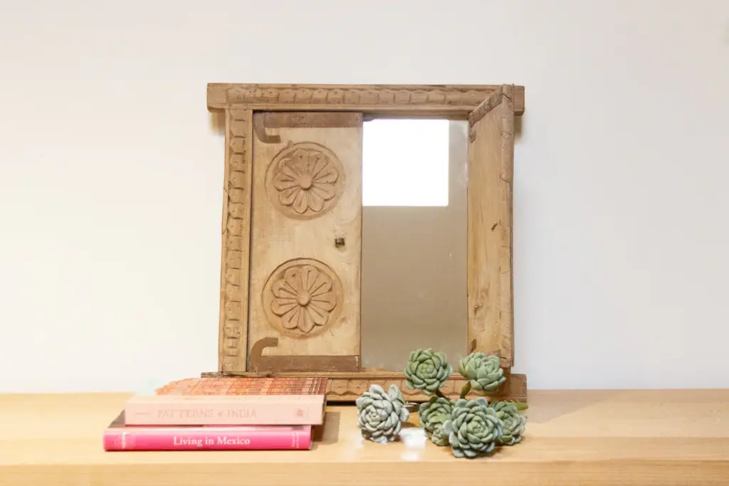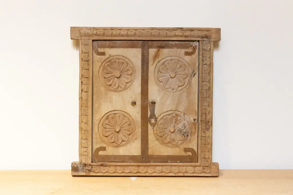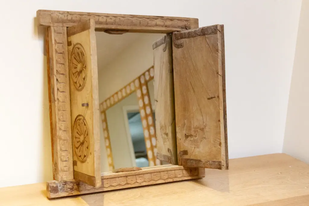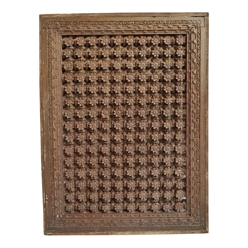 A remarkable 19th-century carved window from India. Retaining its original sun-bleached natural patina, this window stands as a testament to traditional craftsmanship. The front is adorned with exquisite carvings, showcasing a harmonious blend of geometric patterns and delicate floral motifs that encapsulate the rich history of its origins. Adding a touch of modern functionality, a newly added mirror enhances its allure, making it a unique and versatile piece.