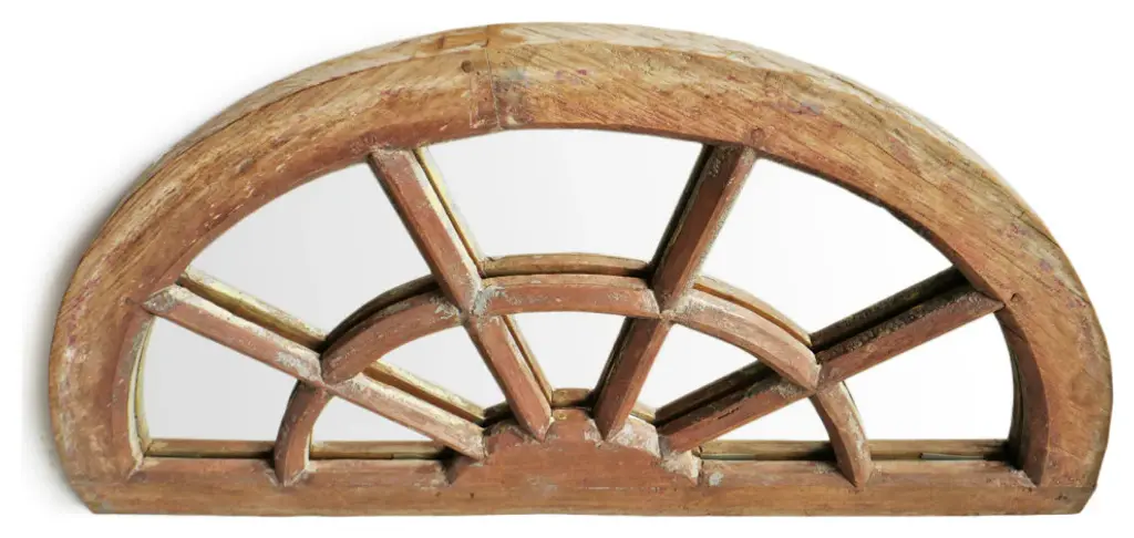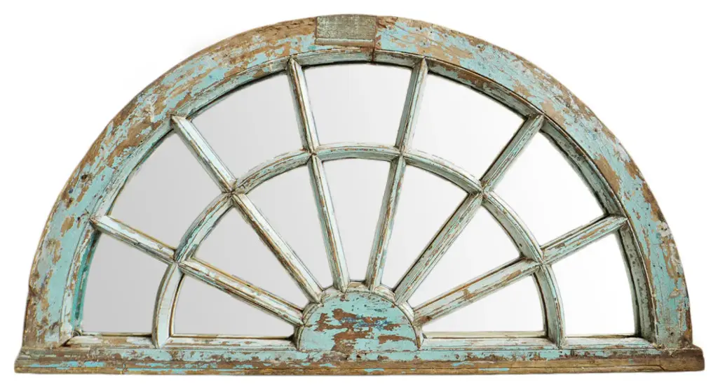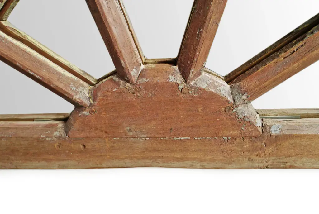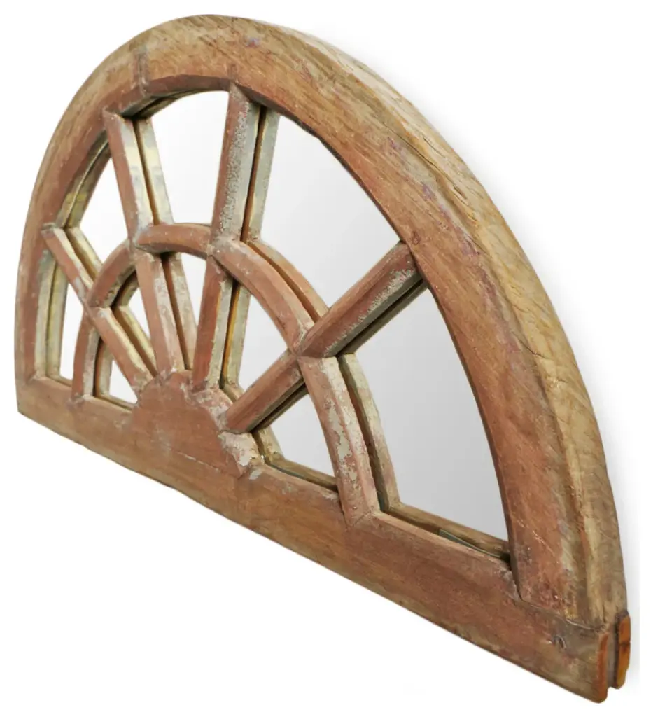 Consigned antique old teak window frame repurposed into a one of a kind beautiful arched mirror. Original aged worn finish with paint remnants.Condition: Good, with signs of age and useOrigin: IndiaEra: 1900''s