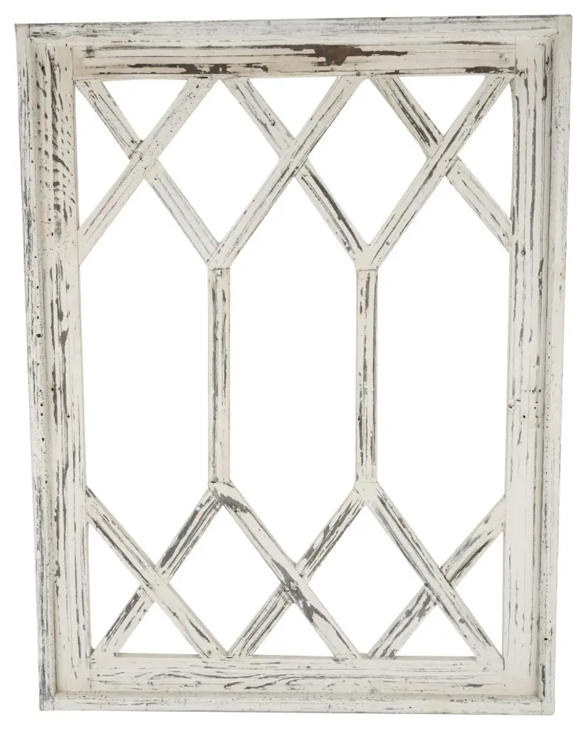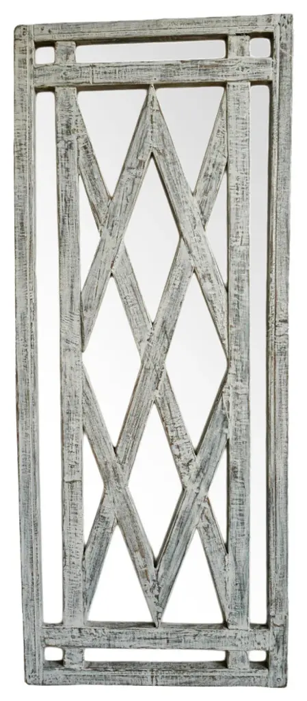 Consigned vintage wood window frame from Jakarta. Beautiful patina in blue hues with worn finish and each slightly unique. Striking back mirror beautifully reflects the light and silhouette of the frame design. Mirror frame is vintage with new mirror glass backing. This item is non-returnable - all sales are final.Condition: Great, with signs of ageOrigin: IndiaEra: 1920''s