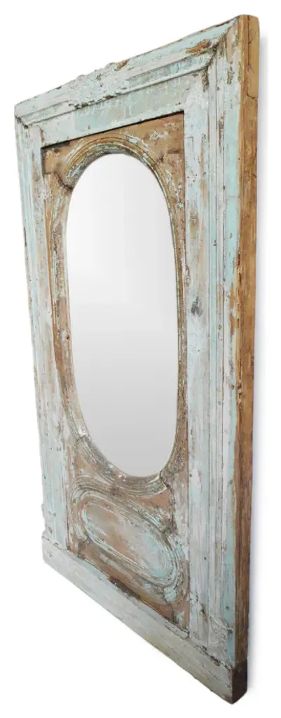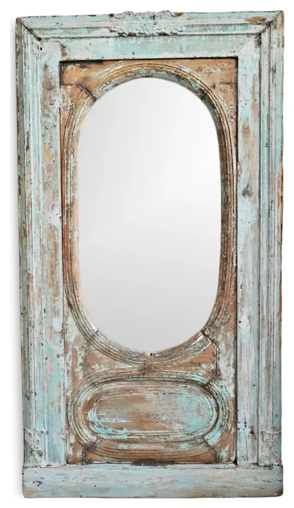 Consigned original old window frame from north India. Beautiful aged and worn pale blue patina repurposed into a useful and unique mirror frame. Ready to hang or can be used leaning on the wall with recommended attachment. One of a kind find.Condition: Great, with signs of age and useOrigin: IndiaEra: Early - Mid 1900''s