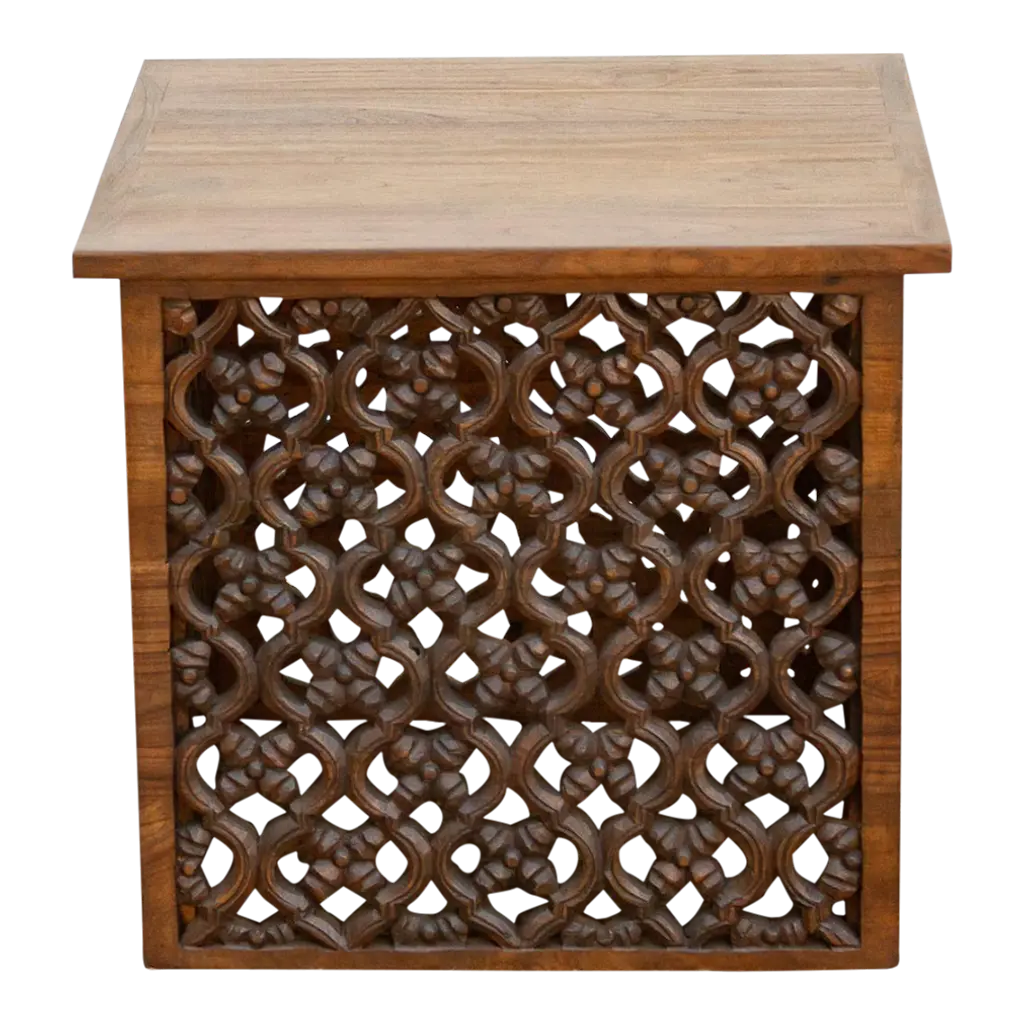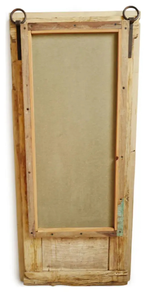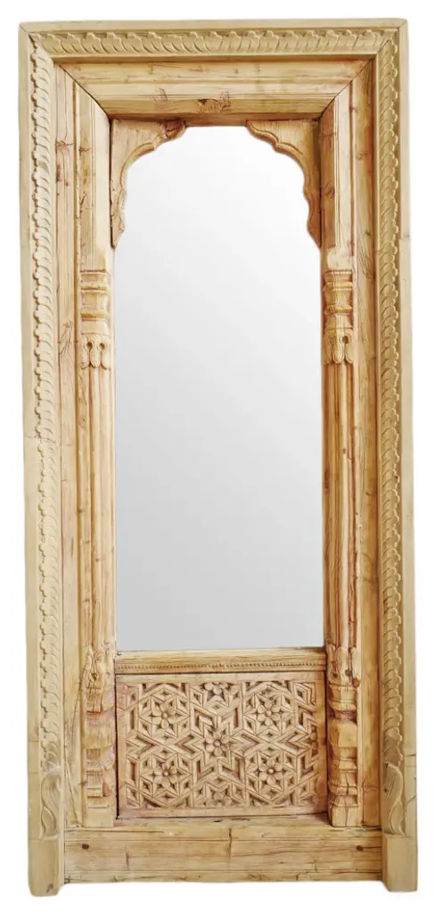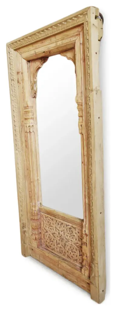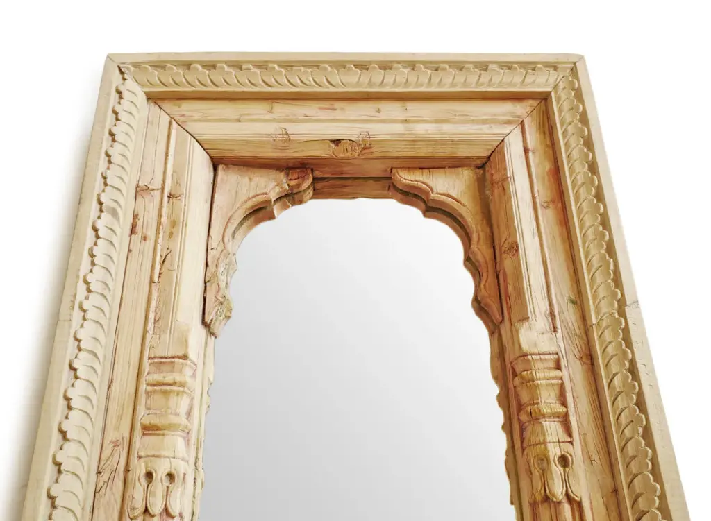 Consigned old vintage carved wood window frame from Rajasthan, India repurposed into a one of a kind mirror. Sun bleached finish and signs of age and use on old wood frame.Condition: Great, with signs of age and useOrigin: India Era: Mid 1900''s