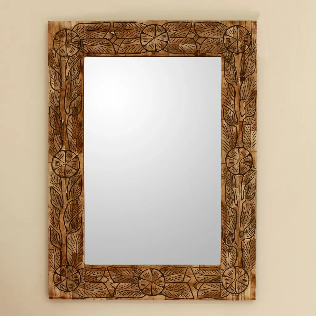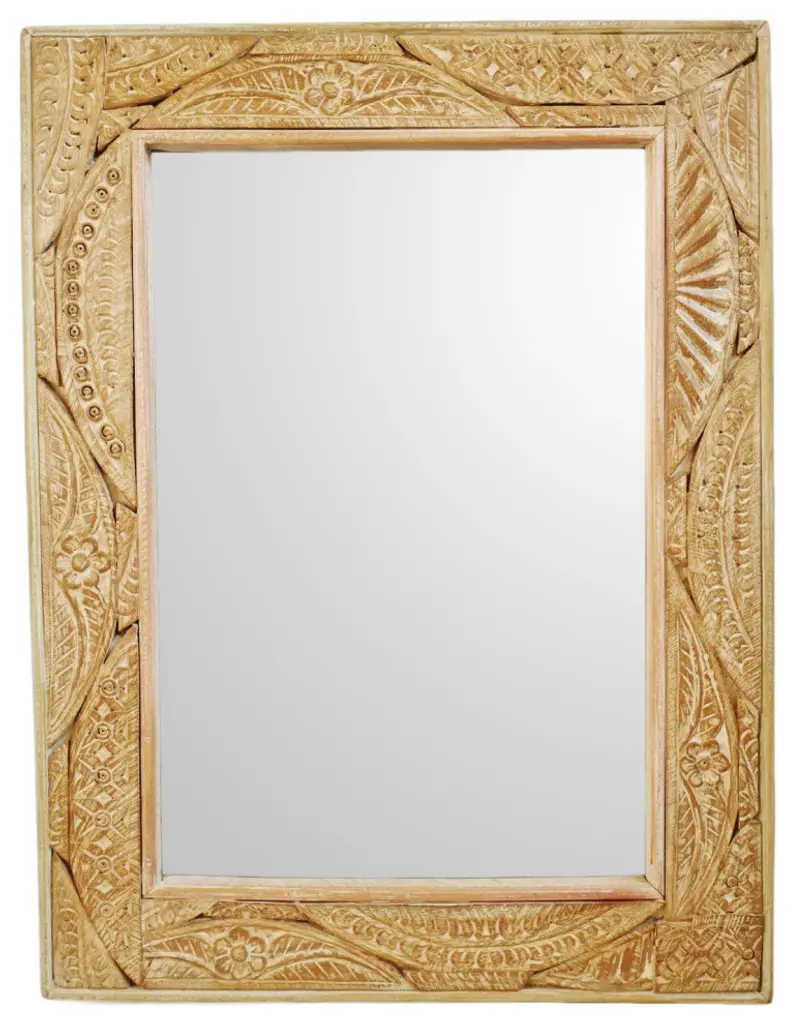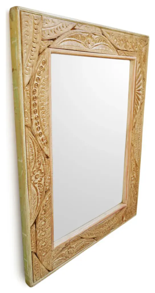 Consigned charming vintage Agra India carved wood frame mirror. Beautiful hand carved details of flowers and traditional patterns.Condition: Great, with signs of age and useOrigin: IndiaEra: Mid 1900''s