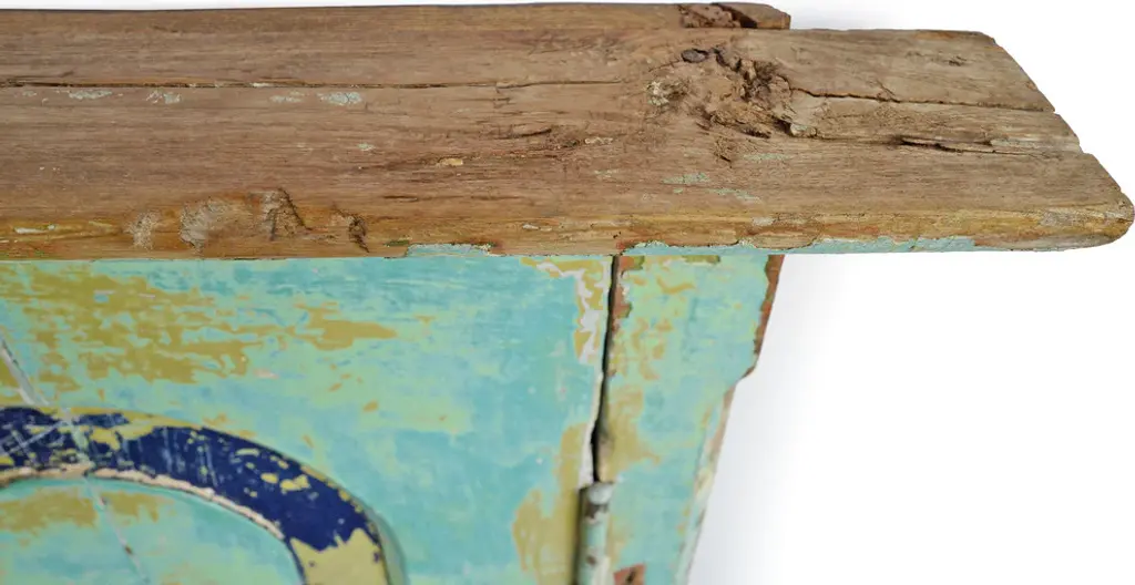 Consigned original old teak wood painted shutter door with mirror inside. Choose to open or close. Beautiful original painted turquoise blue and green aged patina. Ready to hang. This item is non-returnable - all sales are final.Condition: Great, with signs of age and useOrigin: IndiaEra: 1900''s