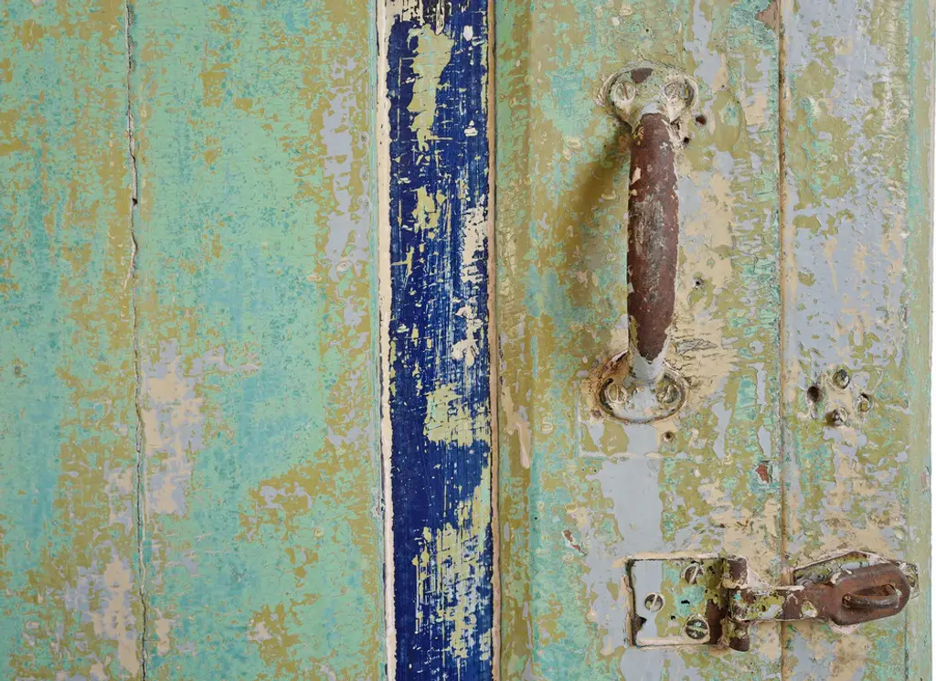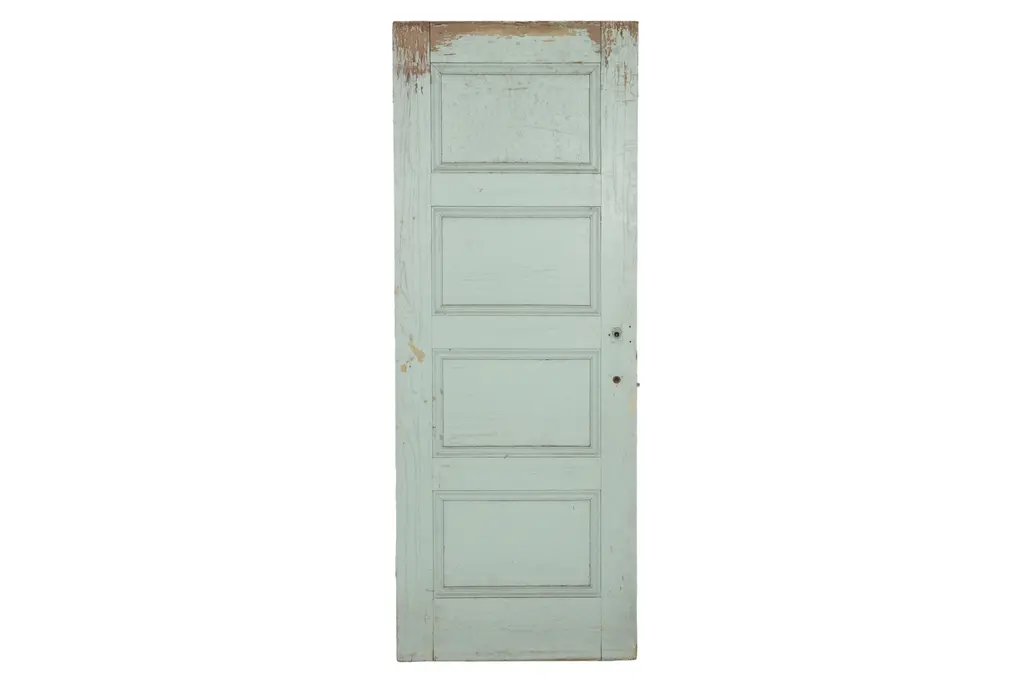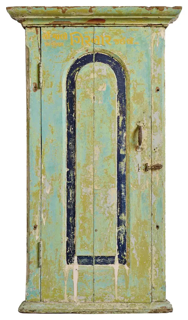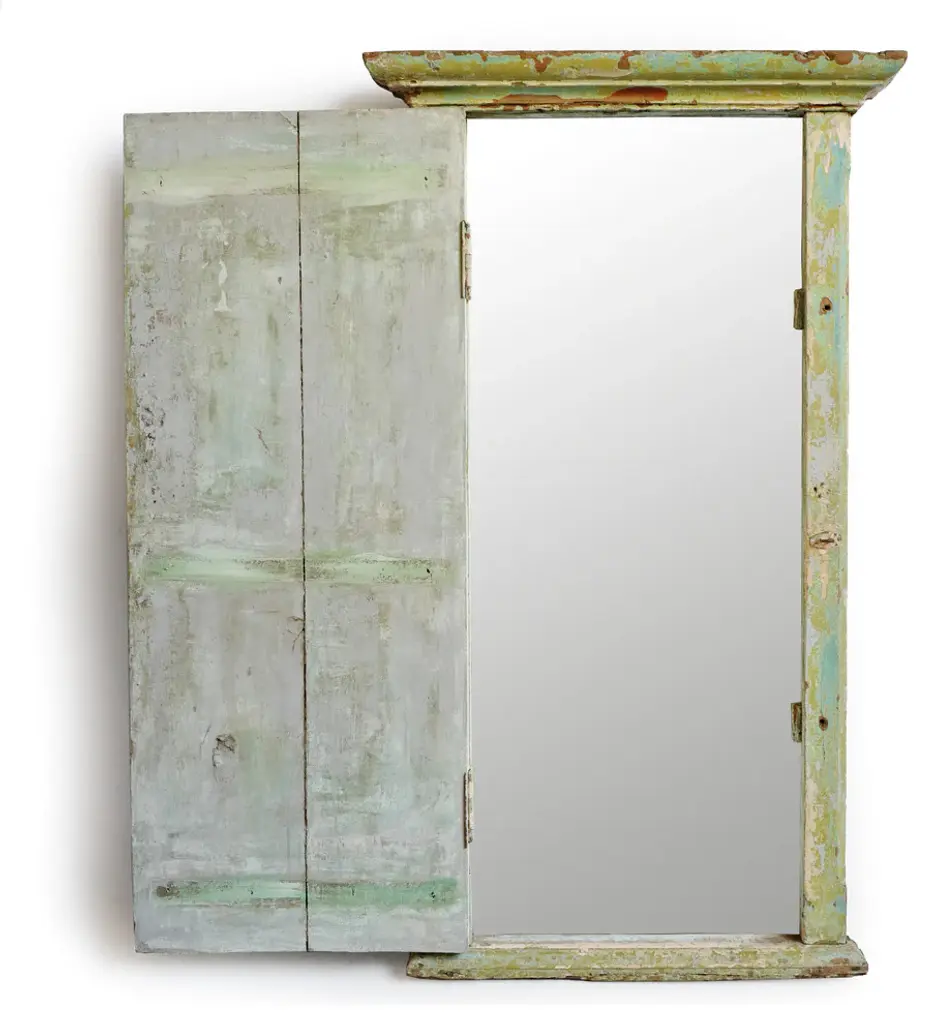 Consigned original old teak wood painted shutter door with mirror inside. Choose to open or close. Beautiful original painted turquoise blue and green aged patina. Ready to hang. This item is non-returnable - all sales are final.Condition: Great, with signs of age and useOrigin: IndiaEra: 1900''s