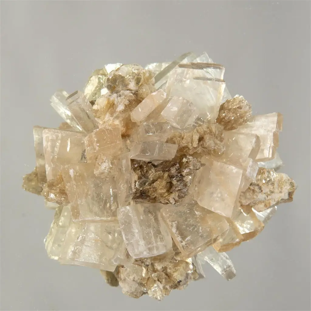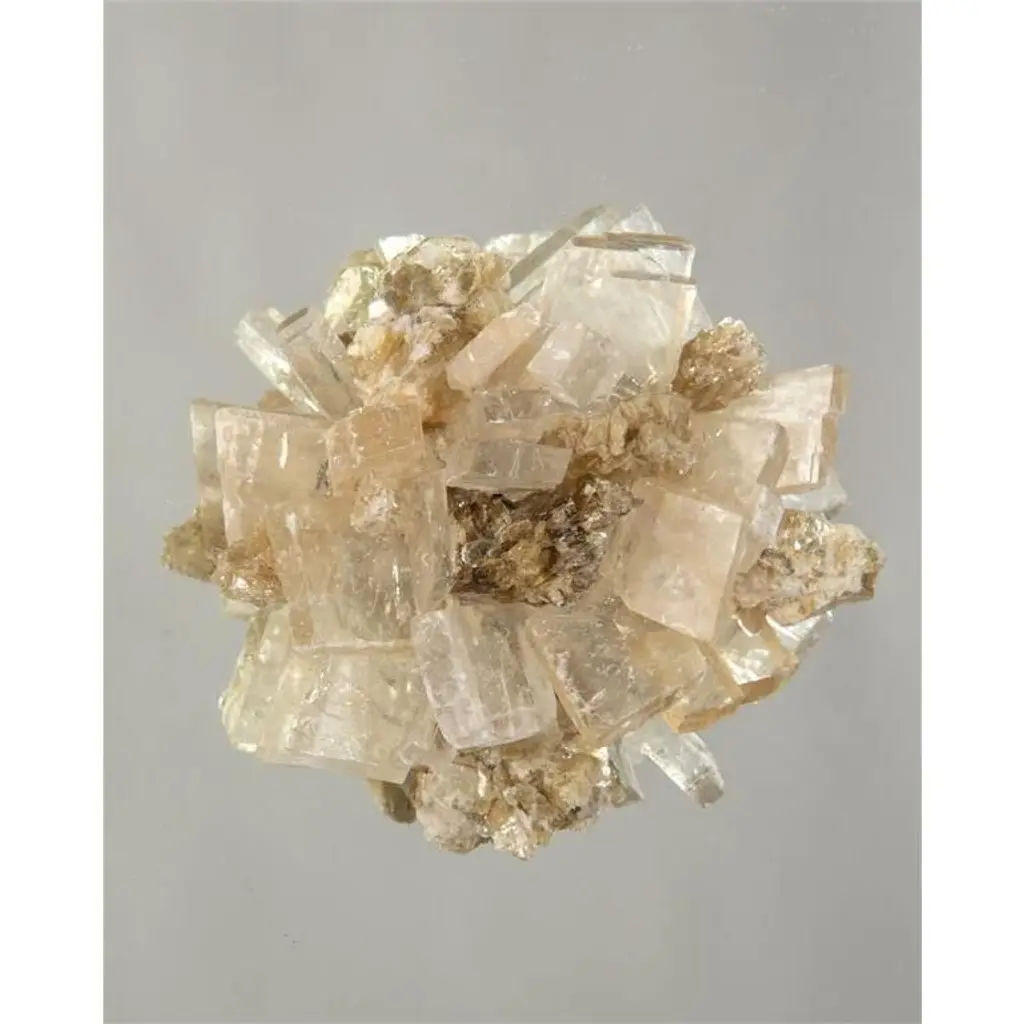 A mirror with a simple cock bead molding in brushed silver finish featuring a selenite crystal decor at its center. French cleats are fitted.