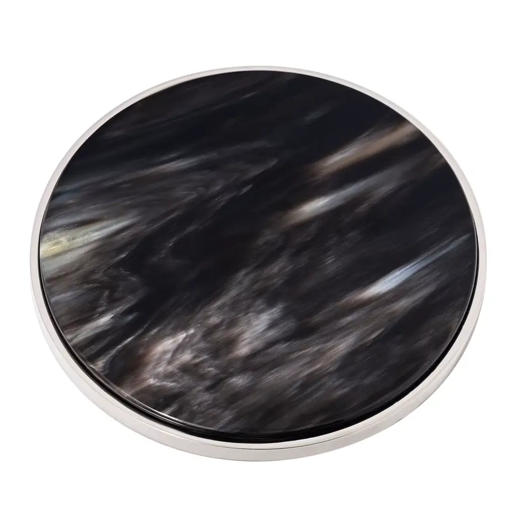 Constellation Mirror by Tom Palmer.Dimensions: D 150 x H 5 cm.Mterials: Glass, Resin.Also available: other sizes and variations available.The constellation mirrors are made from hand mirrored toughened glass backed with layers of coloured translucent resin and further hand slivering. I have developed a unique method of mirroring glass using a the precious metal Palladium and water which allows me to create swirling compositions reminiscent of deep space Constellations and Nebulas.The mirroring of the constellation mirrors can be composed to respond to clients spaces along with the colours of the backing resin layers.As standard the constellation mirrors are framed in a custom circular frame, that can be finished in a range of metal finishes, pewter, bronze and brass etc. It is also possible for the constellation mirrors to be framed in rectangular frames, forming triptychs etc.It is possible to easily create custom diameters of the constellation mirrors as there is no mould required unlike the iris mirrors. I have found that dimensions between 80cm - 180cm are most effective with 120cm as the standard diameter.Tom Palmer (b 1986) is an Artist whose work ranges from individual pieces for private clients, to bespoke installations for international interior designers and architects. Much of Tom’s work has been informed by his ability to work with an ever-expanding range of materials and skills both ancient and contemporary. He has a particular fascination in the world of Medieval and Renaissance Europe but also the aesthetic and art of later Japanese makers and artists. He takes inspiration from functional objects as well as religious and fine art. A brief overview of some recent pieces gives the best insight into Tom’s astonishing range. As well as working on his own pieces, Tom has developed and created specific elements for many projects on a more architectural scale for both private and industry clients. In recent years he has been called upon to create often deeply textural pieces using everything from timeless ‘noble’ materials such as stone and bronze to newly emerging industrial composites.Tom is included in the prestigious Homo Faber Guide of craftsmanship compiled by the Michelangelo Foundation