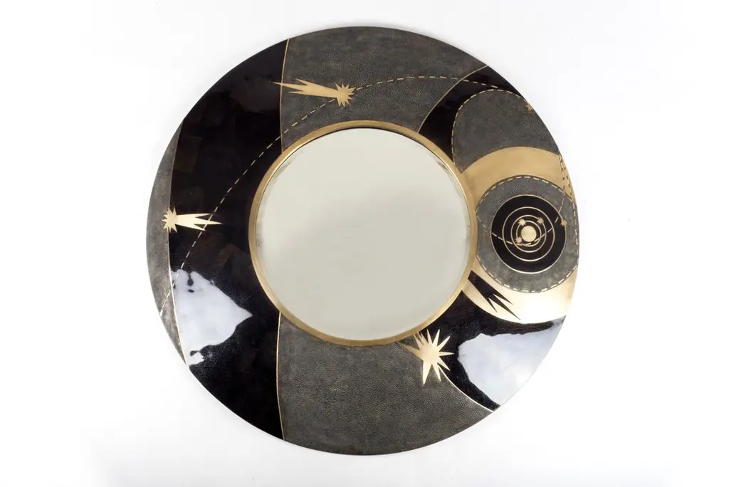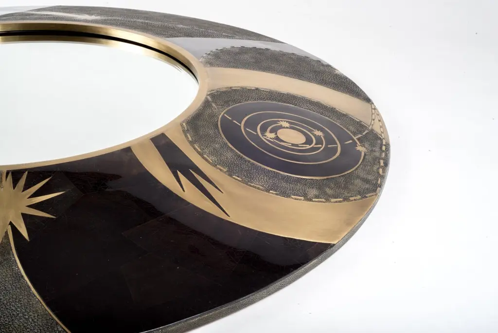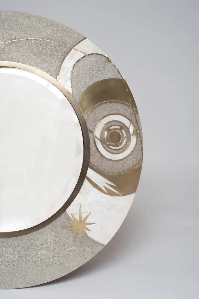 The Paris based label has distinguished themselves since their launch, with their iconic use of shagreen mixed with brass and other exotic materials. All furniture is handcrafted by skilled artisans, ultimately making each piece unique, designed in Paris and produced in the Philippines.The Constellation light mirror is a statement piece with it’s celestial inspired roots. The mirror can be hung in 3 different ways. Available in a larger size and black finish (image at end of the slide). The shagreen is hand-dyed by artisans and the designers calls the final finish “Antique Natural” shagreen. Each mother of pearl shell is hand-selected before it is inlaid creating a one of a kind piece each time. This piece is designed by Kifu Augousti, the daughter of Ria and Yiouri Augousti. Please note due to the shell finish the reflection of light appears on the image. The dimensions of these pieces are: 70 x 70 x 5 cm / 27.5 x 27.5 x 2”All Kifu Paris pieces are handmade by artisans, ultimately making each piece unique. Custom color/sizing available on request. Wipe clean with soft dry cloth.Although inspired by her parents, her collection of Home Accessories and Furniture is a distinct identity of its own. Kifu uses handmade techniques of elaborate inlay patterns of shagreen, shells, semi-precious stones, materials she experienced as a child growing up in her parent’s studio, but interpreted in a younger quirkier way reflecting her youth. From her "jewelry inspired knobs" on decorative boxes, gold bar boxes and an extravagant inlay pattern mix of shagreen and shell inspired by galactic constellations, as seen on her enormous round mirror, is refreshing to see. Kifu embodies whimsical elements throughout her collection and is not afraid to be daring and unexpected in her approach to design. All shagreen-covered items should be kept out of direct sunlight, color variants may occur on the stingray and other exotic finishes, but this showcases the Parisian label's commitment to creating authentic luxurious products using natural components.