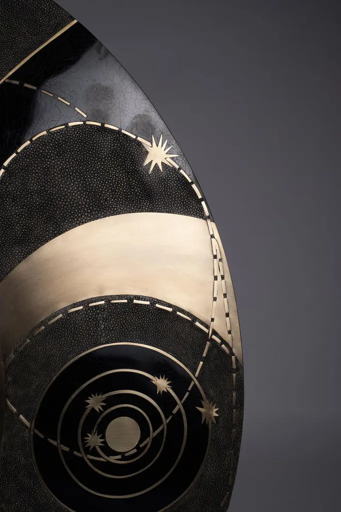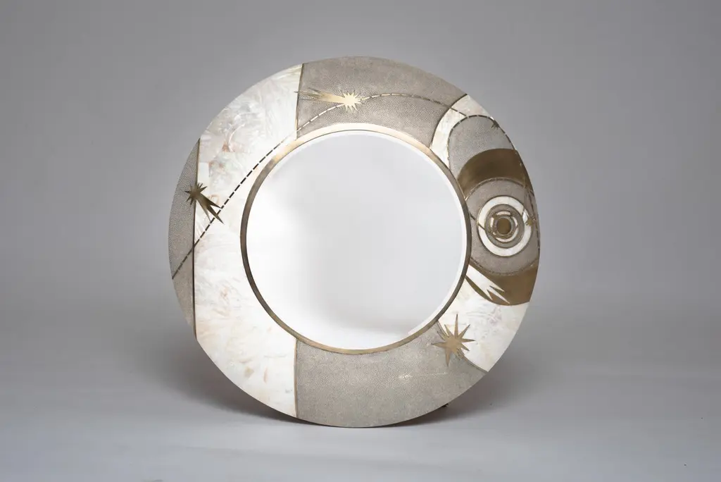 The Paris based label has distinguished themselves since their launch, with their iconic use of shagreen mixed with brass and other exotic materials. All furniture is handcrafted by skilled artisans, ultimately making each piece unique, designed in Paris and produced in the Philippines.The constellation dark mirror is a statement piece with its celestial inspired roots. The mirror can be hung in 3 different ways. Available in a smaller size and cream finish (image at end of the slide). The shagreen is hand-dyed by artisans and the designers calls the final finish “Antique Black” shagreen. Each shell is hand-selected before it is inlaid creating a one of a kind piece each time. This piece is designed by Kifu Augousti, the daughter of Ria and Yiouri Augousti. Please note due to the shell finish the reflection of light appears on the image.The dimensions of these pieces are: 90 x 90 x 5 cm / 35.5 x 35.5 x 2”All Kifu Paris pieces are handmade by artisans, ultimately making each piece unique. Custom color or sizing available on request.Wipe clean with soft dry cloth.Although inspired by her parents, her collection of home accessories and furniture is a distinct identity of its own. Kifu uses handmade techniques of elaborate inlay patterns of shagreen, shells, semi-precious stones, materials she experienced as a child growing up in her parent’s studio, but interpreted in a younger quirkier way reflecting her youth. From her "jewelry inspired knobs" on decorative boxes, gold bar boxes and an extravagant inlay pattern mix of shagreen and shell inspired by galactic constellations, as seen on her enormous round mirror, is refreshing to see. Kifu embodies whimsical elements throughout her collection and is not afraid to be daring and unexpected in her approach to design.All shagreen-covered items should be kept out of direct sunlight, color variants may occur on the stingray and other exotic finishes, but this showcases the Parisian label's commitment to creating authentic luxurious products using natural components.