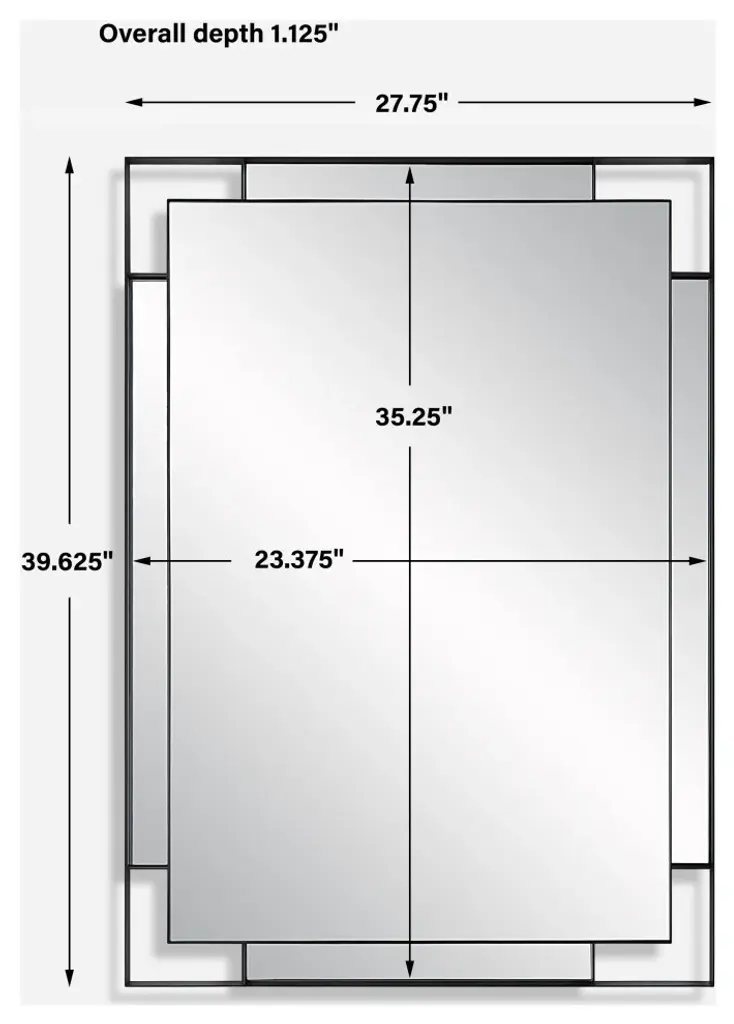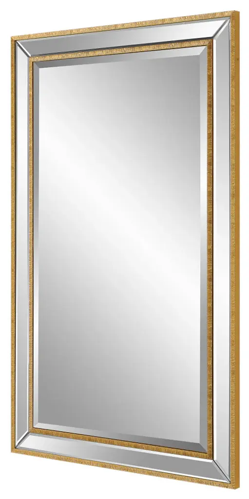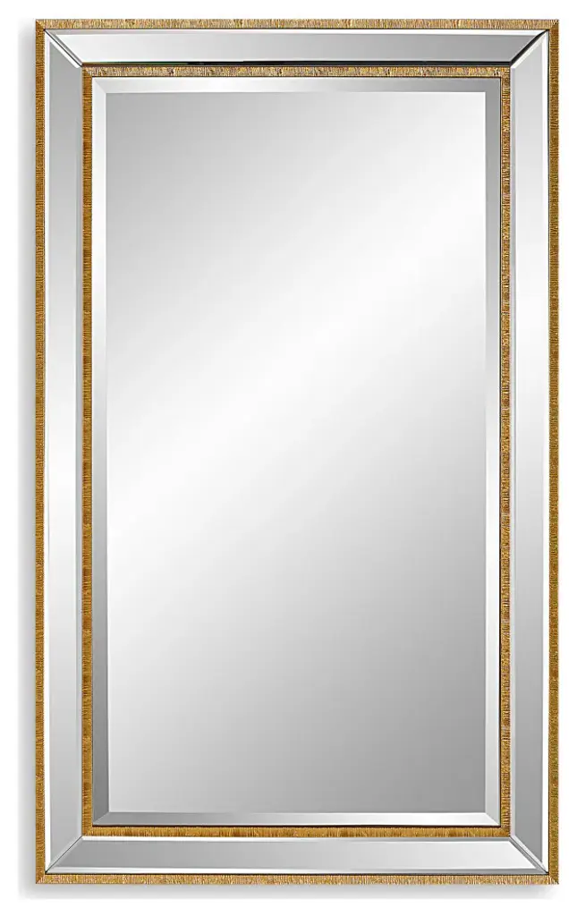 This elegant frame features beveled mirror panels accented with a gold organic textured design that surrounds the frame. The inner mirror has a 0.75" bevel. May be hung either vertically or horizontally. Also available in black.