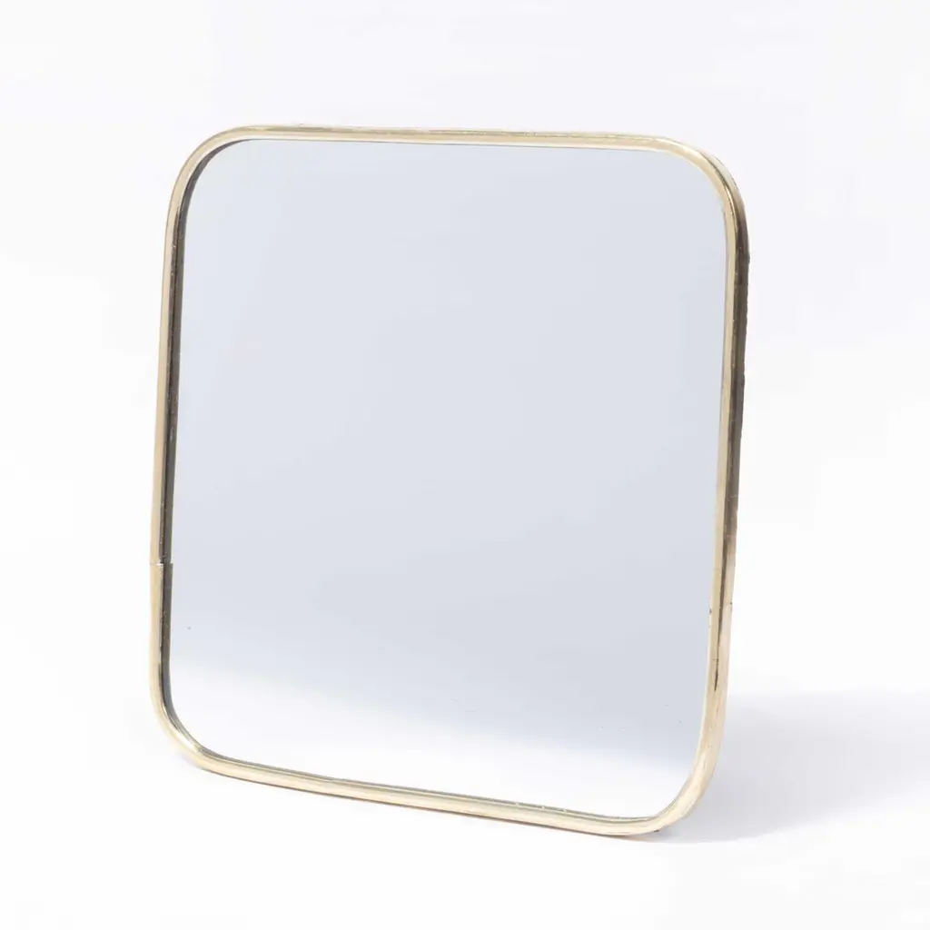 Contemporary Brass Mirror - Small. Handmade for us in Morocco, a contemporary deign with a simple brass frame and textile back. The back panel has two simple eye loops for hanging, but the mirror can also just be propped up against a vertical surface.Workshop Report:Contemporary product handmade in Morocco.Date:21st CenturyMaker:Handmade - MoroccoDimensions:25cm(w) x 25cm(l) x 1cm(h)