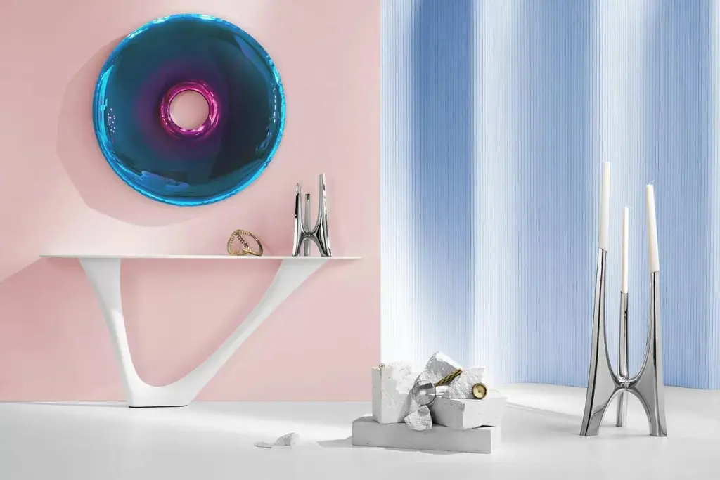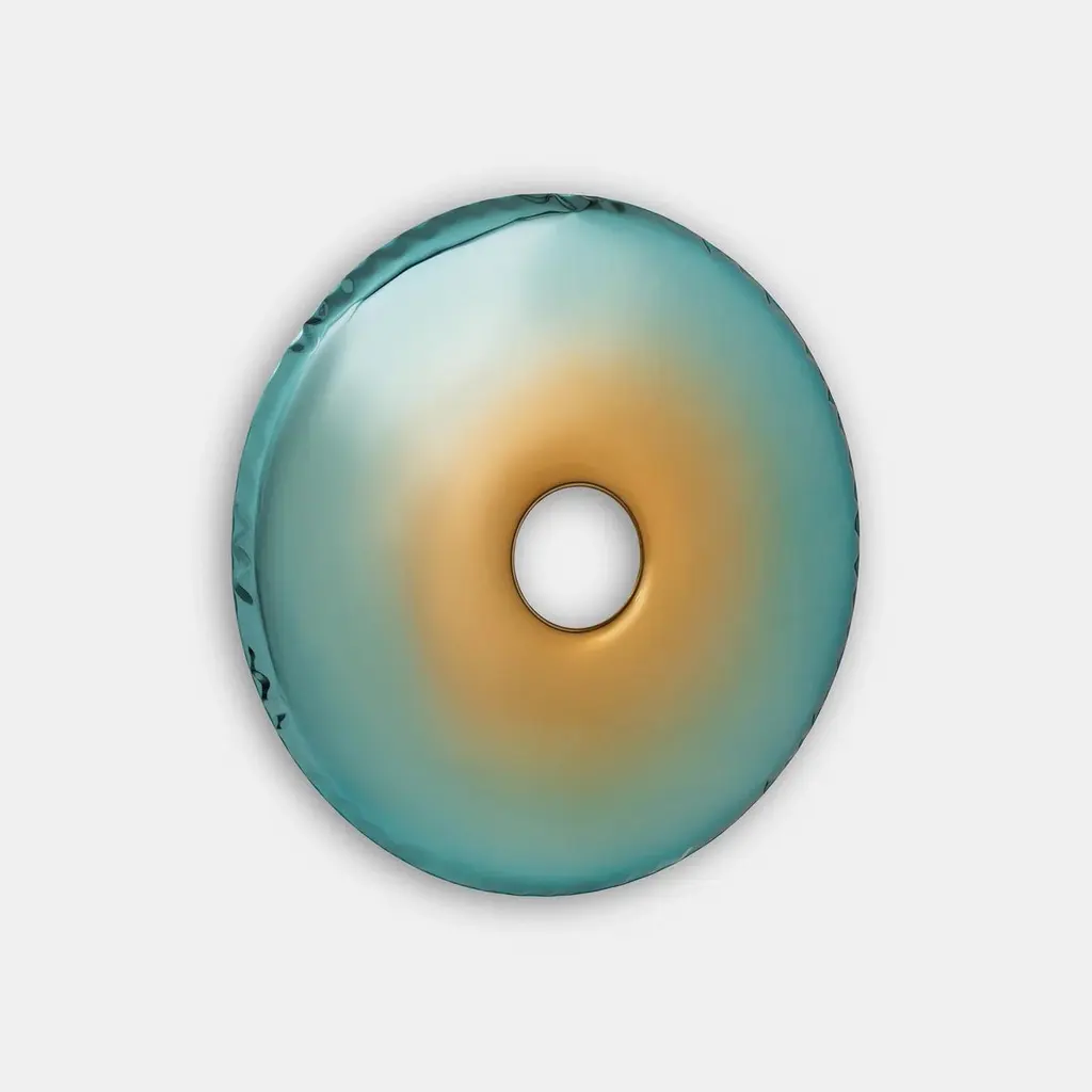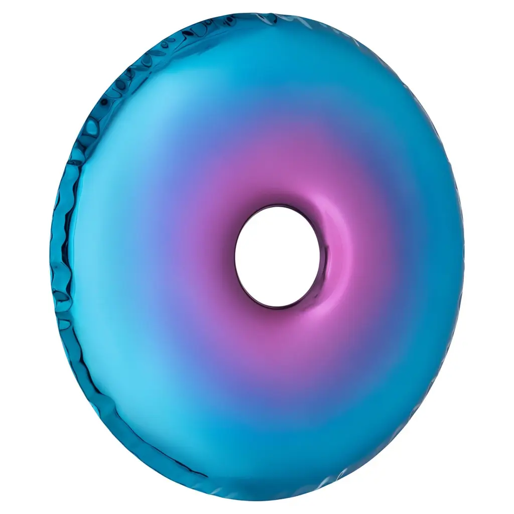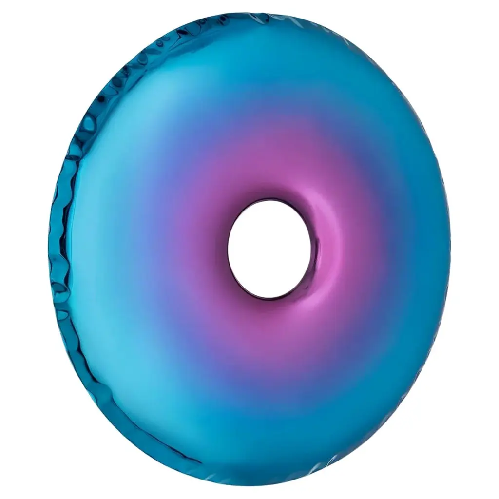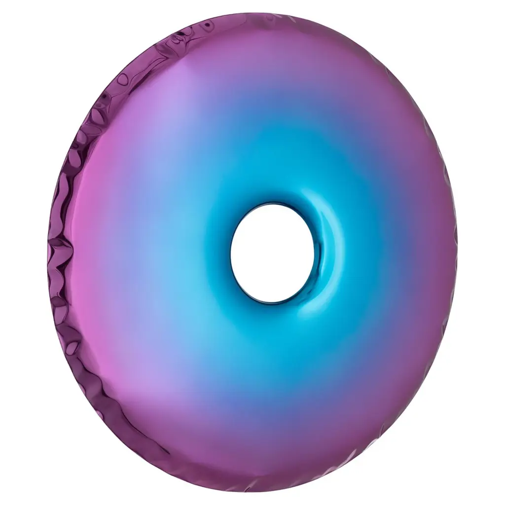 "Rondo" contemporary mirror by ZietaOriginal Zieta mirror, delivered with certificate. Collection: TRANSITION, Helix Nebula (launched in Salone del Mobile, Milano, 2023)Material: Polished stainless steelFinish: TA, tanzanite-amethystOskar Zieta’s mirrors framed in bionic shapes always provoke. In their flexible deformations they refract light in an unobvious way, creating an unusual experience for the senses—now broadened with new gradient finishes driven by Zieta’s admiration for all things cosmic. They enrich the Inox mirrored surfaces of RONDO objects and expand the TRANSITIONS COLLECTION with the shape and shade of HELIX NEBULA.HELX NEBULA is a manifesto of how the artist studies the relationship between the universe - matter - color. The transition between shades creates the effect of a smooth fusion of color from the edge of the object to its center. The colors are inspired by the trace left behind by a dying star - a planetary nebula. The glow of the nebulae is particularly intriguing because it appears differently across a wide range of light spectra, from ultraviolet to infrared. These cosmic works of art are gigantic clouds made of dust and gases; the outer layers of a star scattered through the galaxy’s space 650 light-years away from the Earth. The combination of energetic colors has an extraordinary effect on the viewer, creating a strong, even vibrant colors spectacle. The intense coloring is accompanied by a feeling of harmony and purity of the form, which gives an almost hypnotic effect. The created illusion gives the opportunity to move directly into the immersive boundlessness of space. The artist in a metaphorical way brings us closer to what is almost unattainable. We can observe planetary nebulas evolve, expand, and fade over a period of decades. That provides a detailed picture of how dying stars spread their atoms and molecules into the galaxy. Either scientifically or artistically nebulas fascinate us by colors, as a result, they wake emotions. This is how the Universe lets us create.--Zieta is best known for his collection of stools “Plopp” made through the technologist FIDU. With the same principle Zieta Studio conceived mirror collections made of stainless steel called “Tafla”, “Rondo” and “Rondel”. Two laser-cut metal sheets are first welded together before air is injected between them until they separate from each other forming a three-dimensional object.