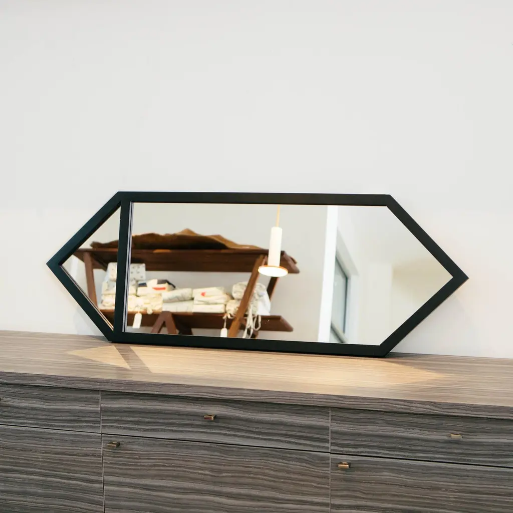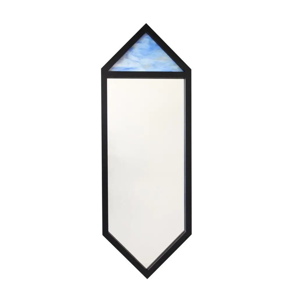 The “Crystal Black" mirror is from the 2016 collection of Alex Drew & No One. Inspired by traditional craftsmanship while incorporating a modern edge, AD&NO's work plays on light, textures, and form.Mirror shown in solid wood frame with opaque black lacquer finish with mirror glass detail at top (also available in stained glass). Solid wood frame, color TBD. Catalyzed lacquer finish. Top detail to be stained glass or mirror.Custom stained glass colors available. Recessed mirror back.Customization available upon request.Each piece is handcrafted by Alex Rosenhaus and Drew Arrison in Detroit, MI.Sold individually.