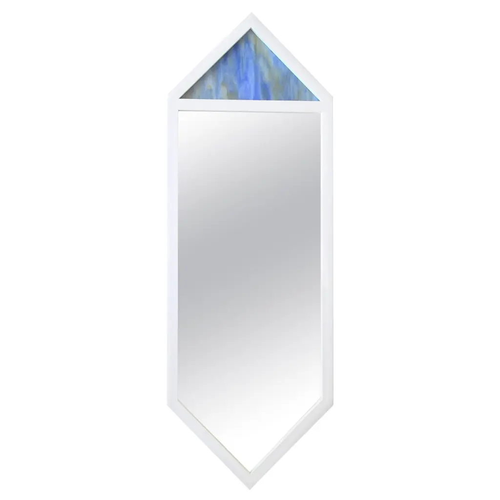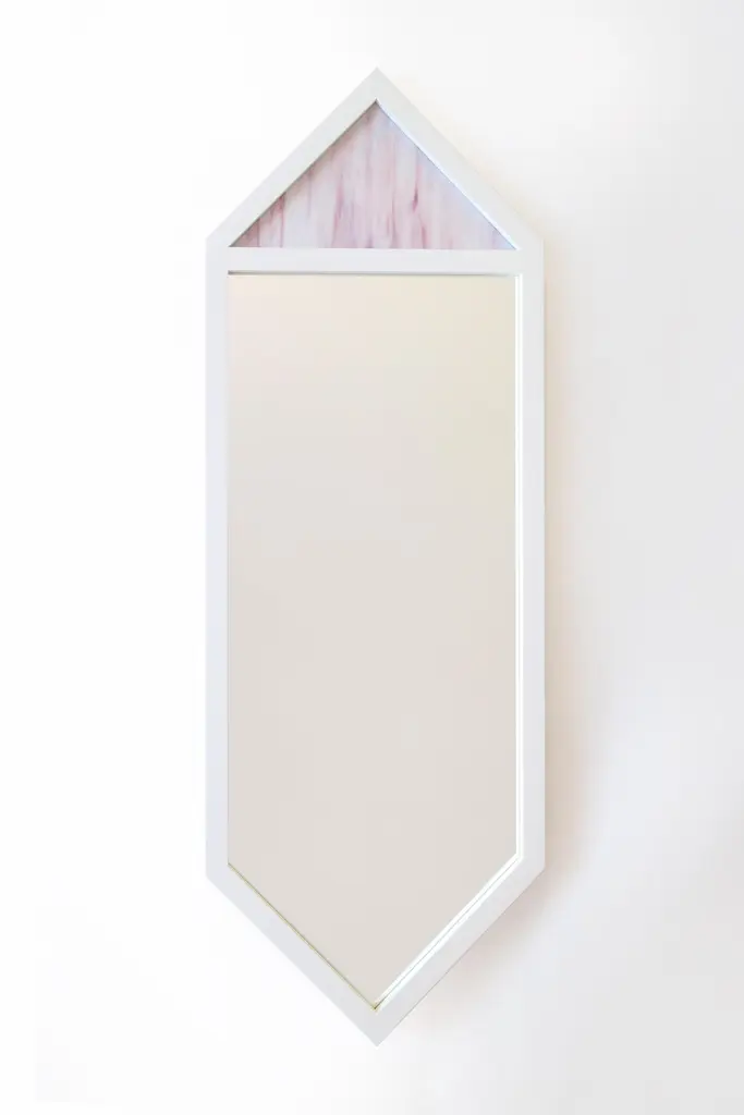 The “Crystal Pink" mirror is from the 2016 collection of Alex Drew & No One. Inspired by traditional craftsmanship while incorporating a modern edge, AD&NO's work plays on light, textures, and form.Mirror shown in solid wood frame with opaque white lacquer finish with pink stained glass detail. Solid wood frame, color TBD. Catalyzed lacquer finish. Top detail to be stained glass or mirror.Custom stained glass colors available. Recessed mirror back.Customization available upon request.Each piece is handcrafted by Alex Rosenhaus and Drew Arrison in Detroit, MI.Sold individually.