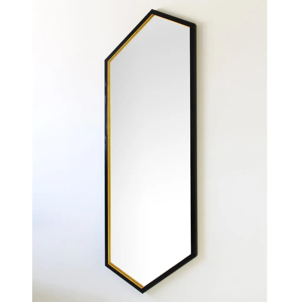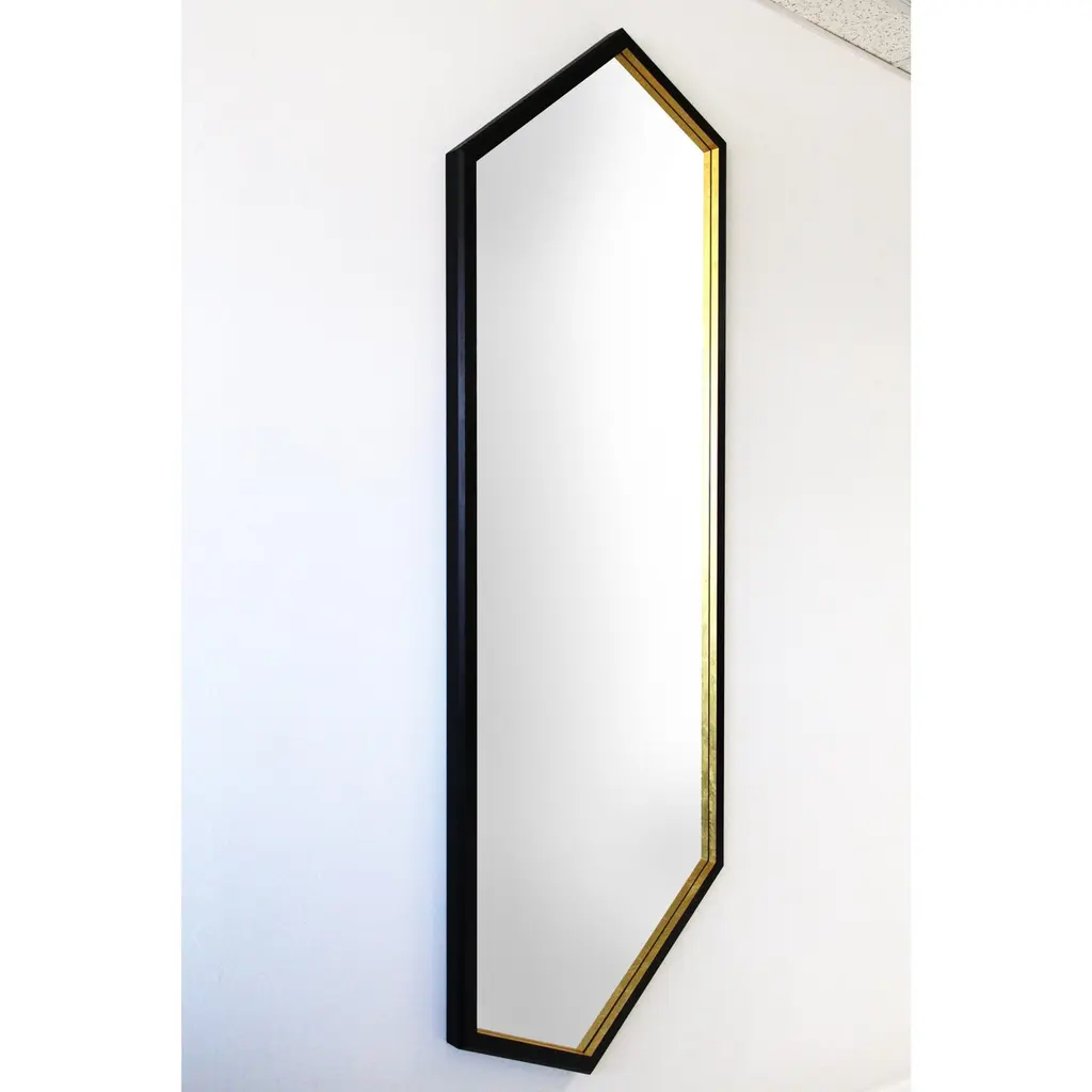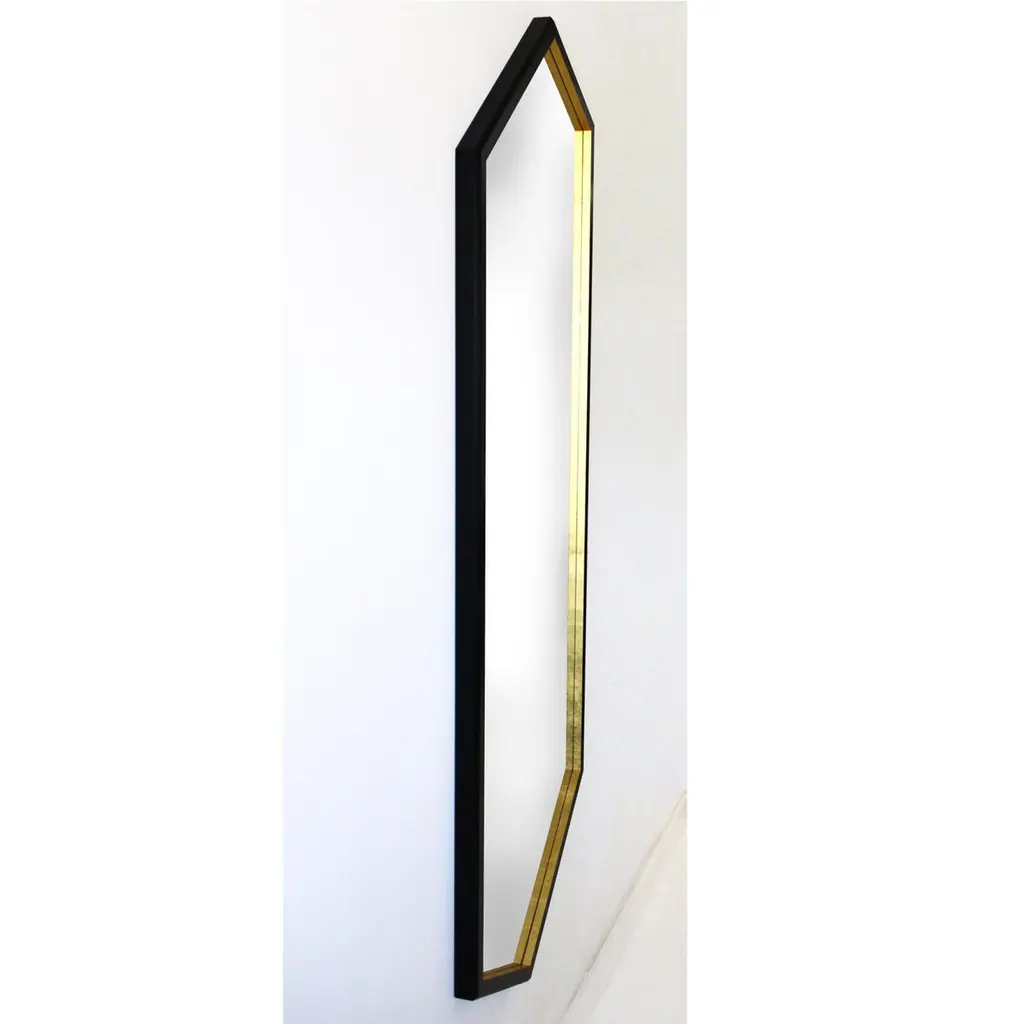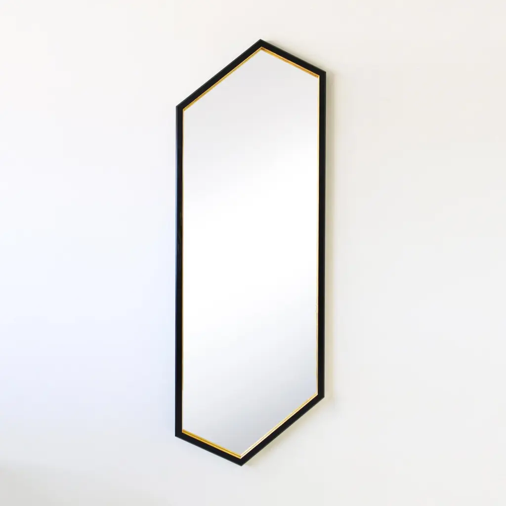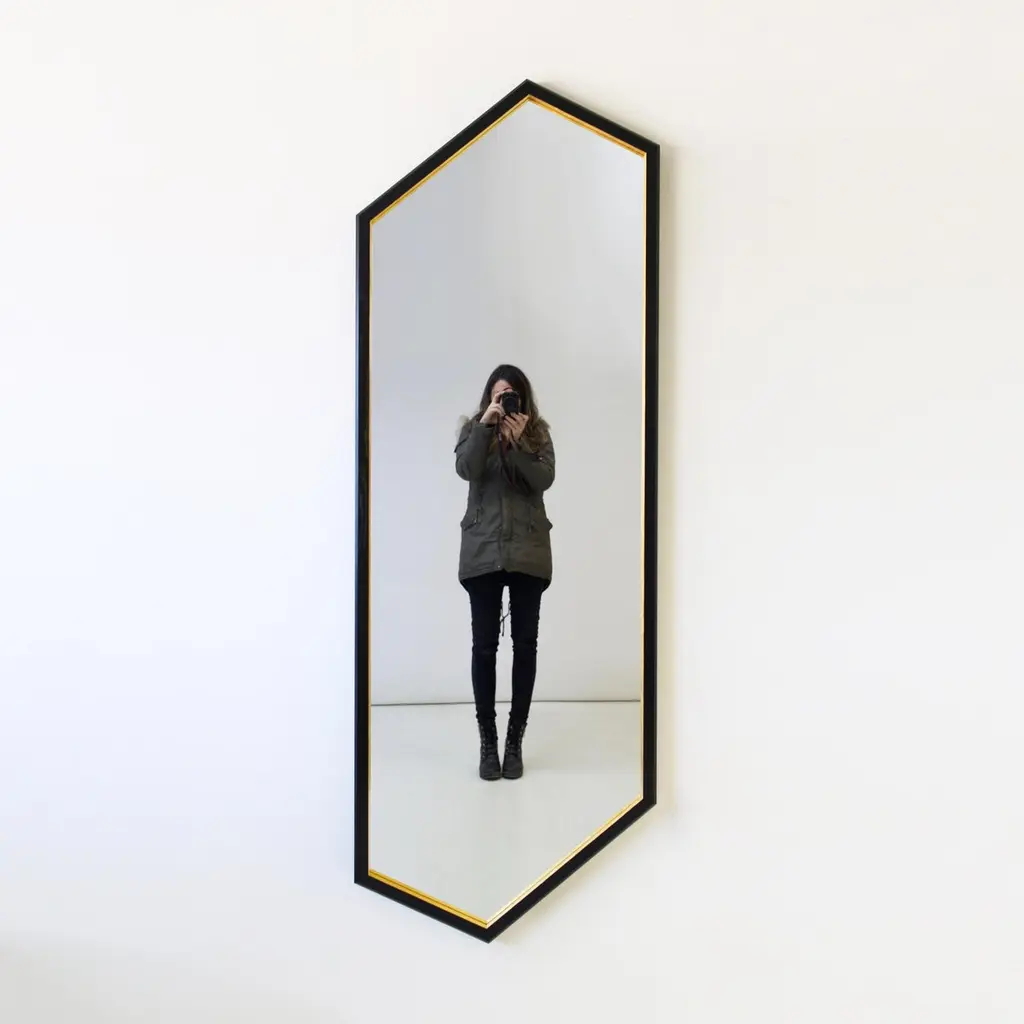 The “Hex Full Length Mirror" is from the 2022 collection of Alex Drew & No One. Inspired by traditional craftsmanship while incorporating a modern edge, AD&NO’s work plays on light, textures, and form.Each piece is handcrafted by Alex Rosenhaus and Drew Arrison in Detroit, MI.Measures: 72” L x 25-1/4” W x 1-3/4” HSolid ebonized Ash lacquered frame.Wood frame has a chamfered outside edge detail. 23-karat gold gilded detailing.Recessed mirror back. Lead Time: 4-6 weeks.