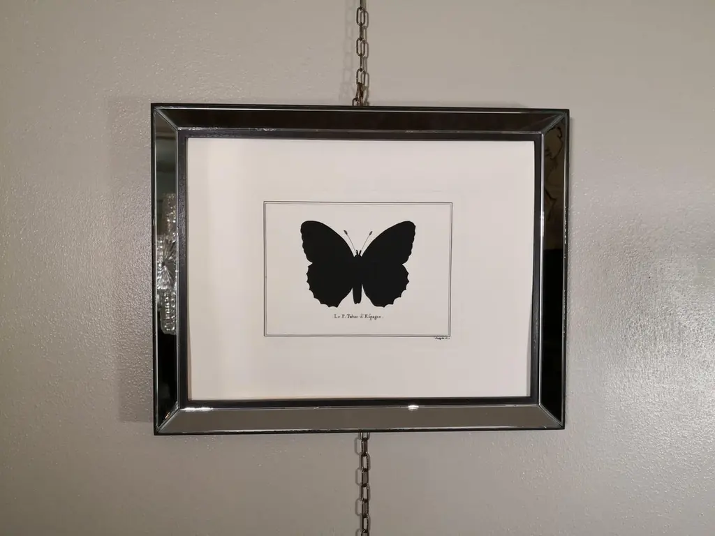 Contemporary Italian Hand-Colored Silver-Washed Butterfly Print With Mirrorframe