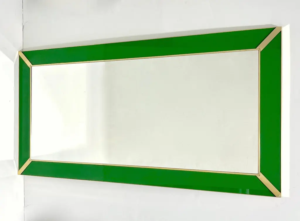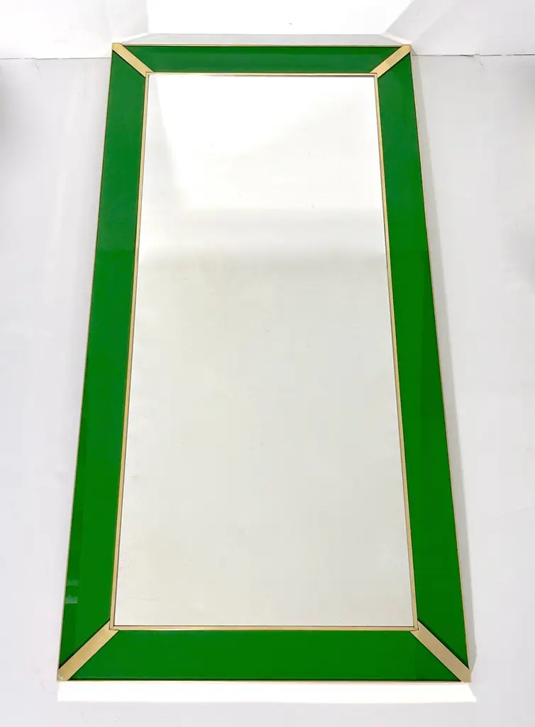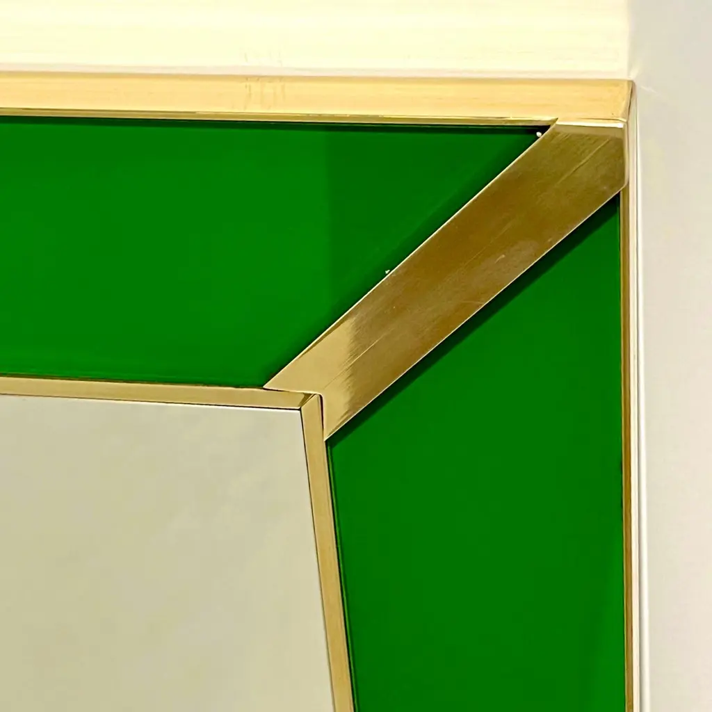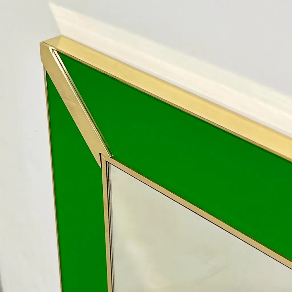 Bring your own accent colors to any space with our customizable modern collection, entirely handmade in Italy, with the purpose of bringing individuality through Art in a functional piece. This mirror with a minimalist design has a frame in colored glass, that can be in the tint of your choice. Play with the limitless combinations of different colors for each side and transform this simple style into an artistic statement!This contemporary Italian apple green and brass mirror has a high-quality construction with a 3" wide glass frame that is inset in an embracing brass border all the way around as well as an inside border of the mirrored plate. The corners are highlighted with a brass detail which adds to its depth. The glass can be in any color of the RAL K7 Classic Color Gloss Chart. Contact us with your requirements.Frame border 3" wide.