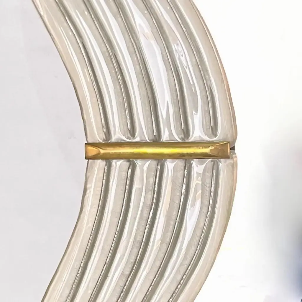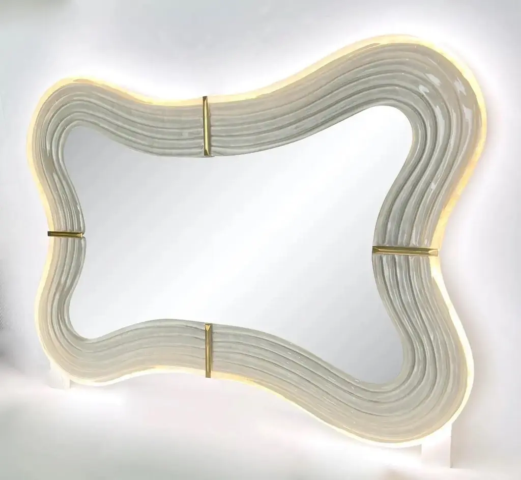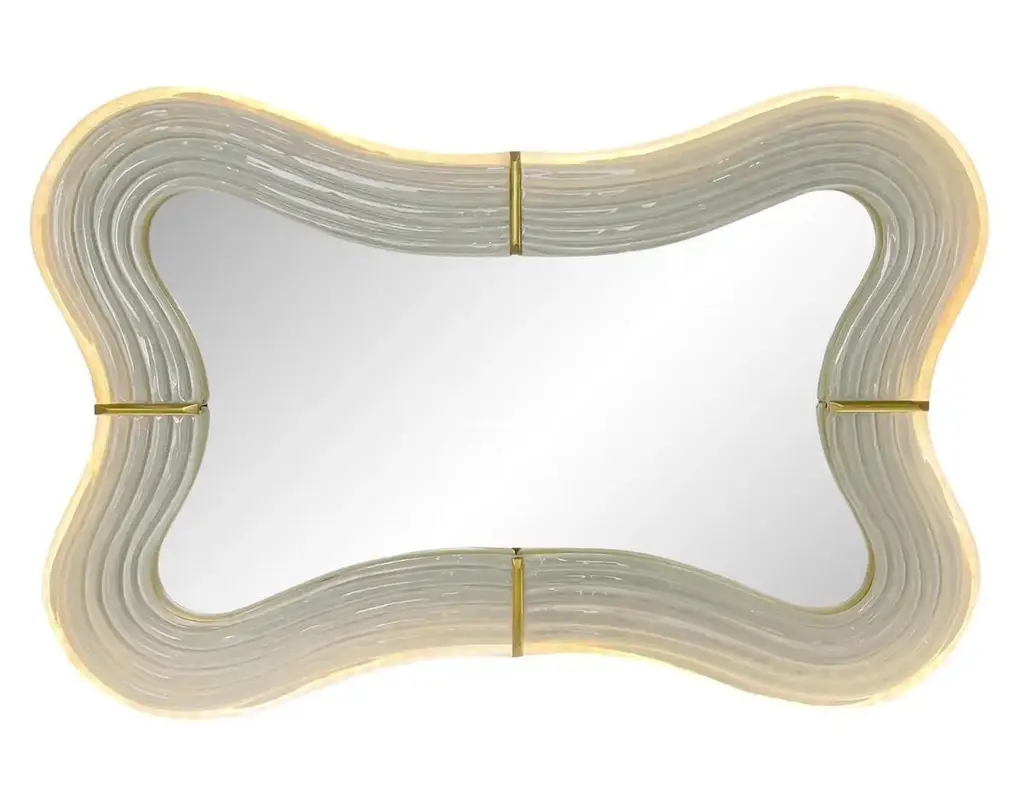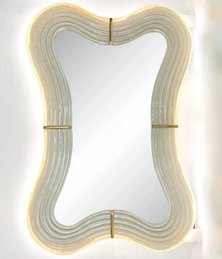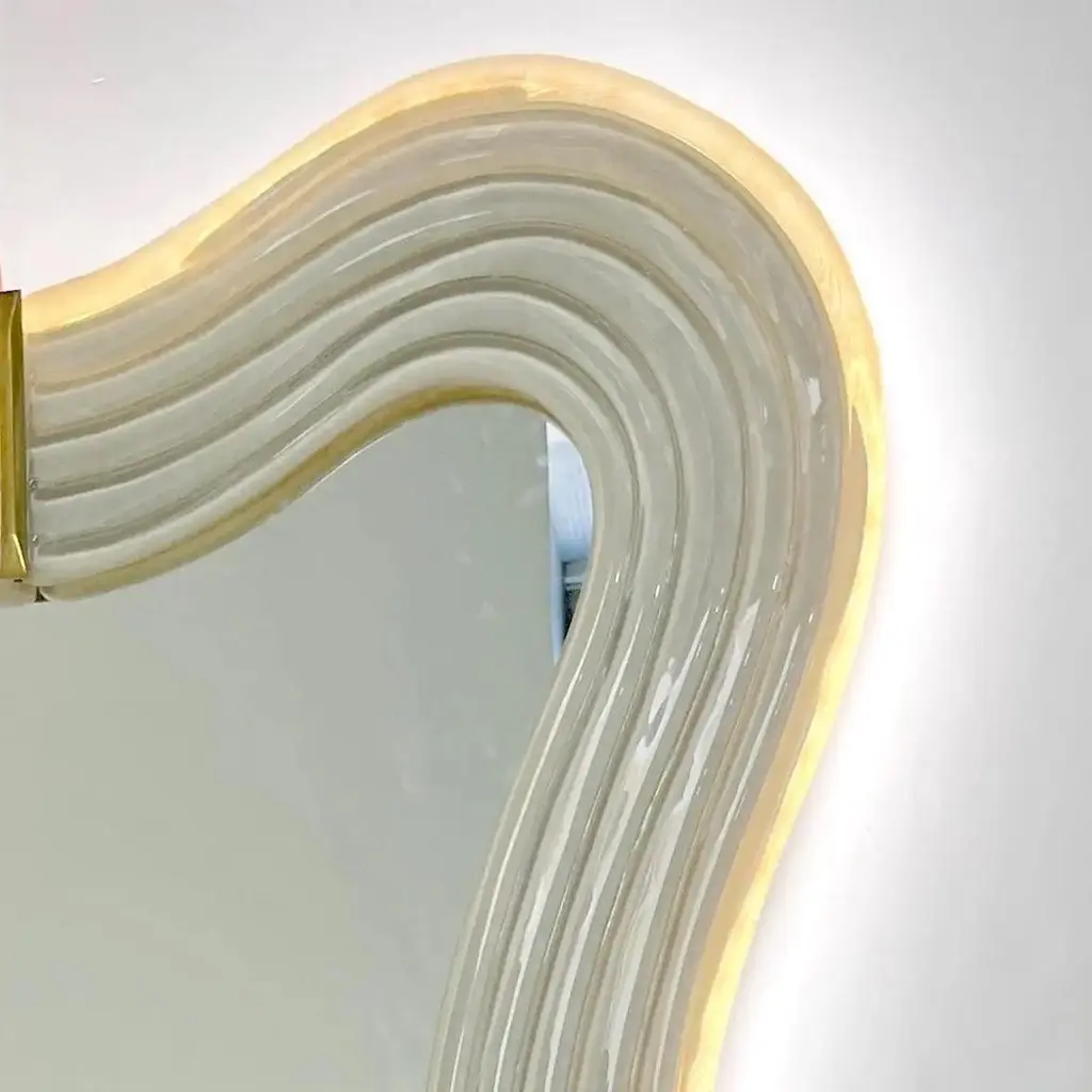Contemporary Italian Pearl White Cream Murano Glass Brass Backlit Curved Mirror