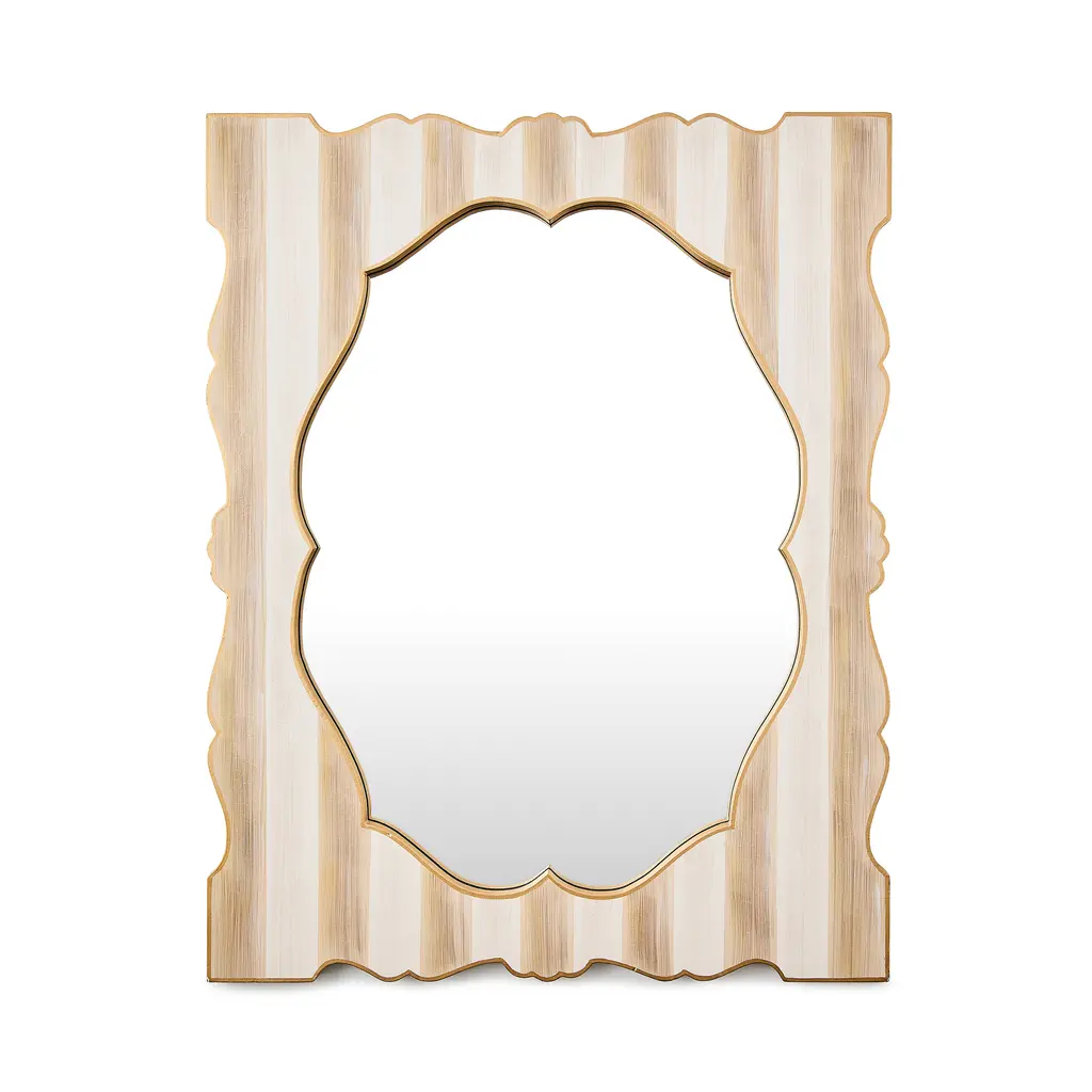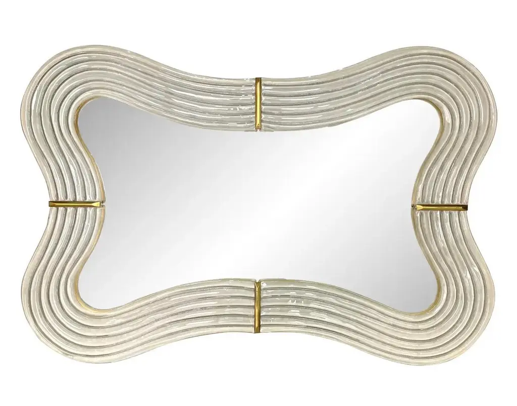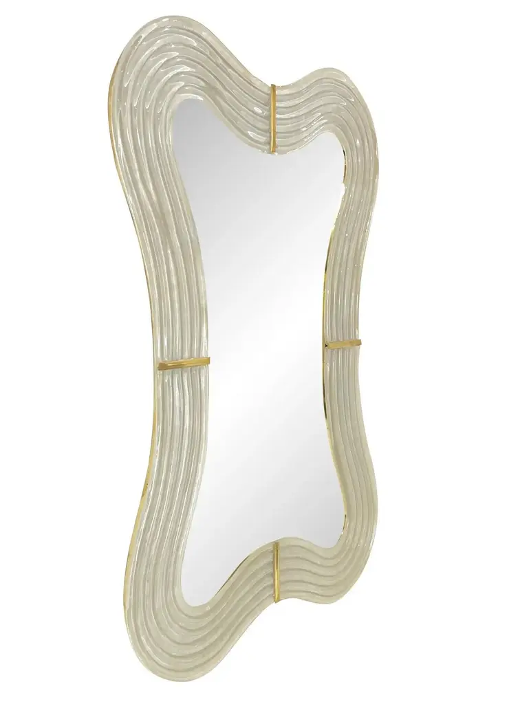 This Venetian mirror brings a sensuous soothing feeling with its curved silhouette, entirely handcrafted in Italy. The sexy waved shape presents exquisite craftsmanship: the wood backed frame, entirely edged in brass, is decorated with a reeded sinuous motif in blown Murano glass in a sophisticated shimmering pearl gray white color, accented with 4 brass baguettes. The outline is fitted on the back with LED light which accentuates the shape and the pearl iridescent finish of the glass which has a luminous elegance and definitely brings Hollywood regency glamour defined in the details, color, texture, and composition.Can also be displayed horizontally.Mirror without lighting: $9,200.
